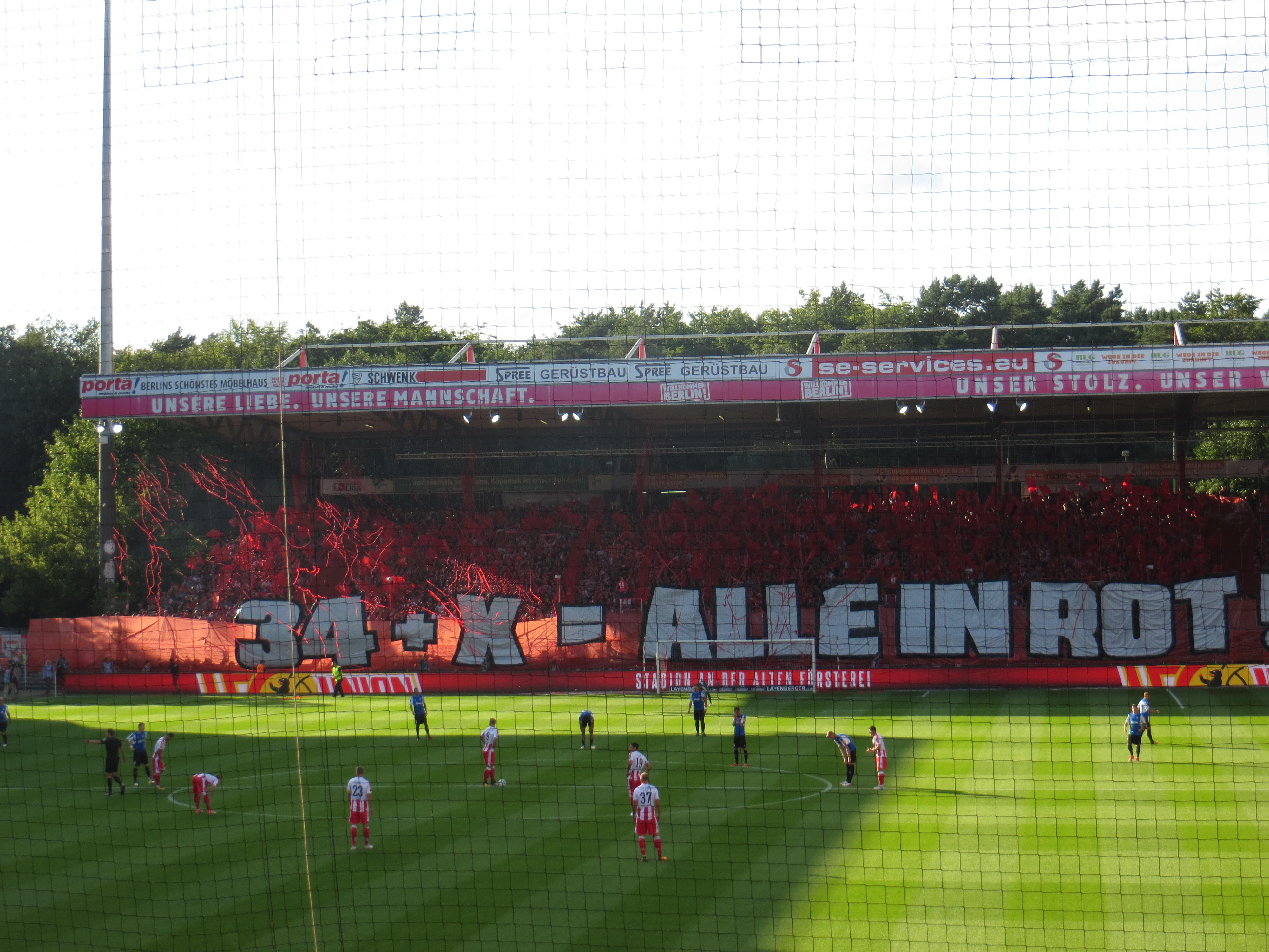 Die Anreise ins finstere Köpenick, war heute eine echte Herausforderung, denn es gab einen Feuerwehreinsatz in Neukölln, wodurch die Ringbahn nur sehr eingeschränkt fuhr. Am Südkreuz passierte erst einmal gar nichts und so befürchtete ich schon den Anpfiff zu verpassen. Nach 15 Minuten erbarmte sich dann jedoch eine Bahn und fuhr ein. Diese war dann dementsprechend voll und wir mit unseren Fahrrädern, wurden nicht gerade frenetisch bejubelt. Ein älterer Herr wies mich dann auch lautstark darauf hin, wie ich ein Fahrradabteil erkennen würde und schimpfte wütend vor sich hin. Unverhoffte Hilfe kam von einem anderen Fahrgast, der ihn anpflaumte: „Zieh Deinen dicken Bauch ein, dann kommst du auch vorbei.“ Ab Schöneweide ging es dann die letzten Kilometer mit dem Fahrrad bis zum Stadion. Auch dank der entspannten Einlasssituation, kamen wir 15 Minuten vor Spielbeginn im Block an. Das war großes Glück, denn gerade die erste Halbzeit war einfach nur unfassbar. Beide Teams spielten tollen Offensivfußball und fabrizierten haarsträubende Fehler in der Defensive. So stand es völlig kurioserweise bereits nach 32 Minuten 3-3. Die sechs Treffer fielen innerhalb von 20 Minuten und bei konsequenterer Chancenverwertung, wäre sogar ein 5-5 zur Halbzeit denkbar gewesen. Nach der Halbzeit war es nicht mehr ganz so furios, und Union konnte mit 4-3 gewinnen. Ein unglaublich unterhaltsames Spiel und eine tolle Leistung von beiden Mannschaften. Schade für Kiel, denn ein Unentschieden wäre das gerechtere Ergebnis gewesen. Auch auf den Rängen machten beide Seiten heute einen guten Eindruck, wobei der Spielverlauf dem natürlich auch sehr zuträglich war. Union startete mit einer Choreo mit dem Motto: „34+X= Alle in Rot“ in die Partie. Hinter dem Spruchband gab es rote Fahnen, Luftballons und Luftschlangen zu sehen, was zu einem schönen Intro führte, auch wenn mich das Motto jetzt nicht vom Hocker haute. Stimmungsmäßig war das auch solide, vor allem, wenn die umliegenden Tribünen mit in die Gesänge einstiegen. Das war aber vor allem bei den Klassikern und Standardmelodien der Fall. Abgesehen von der Choreo, scheint man sich in Köpenick aber nur wenig aus dem optischen Bild zu machen, denn Fahneneinsatz und Geschlossenheit bei den Schalparaden kann man nur mit viel Wohlwollen erkennen. Pluspunkte gab es aber für das Spruchband: „1984 ist endgültig heute. Projekt Südkreuz: Gläserner Bahnhof für gläserne Leute.“ Sackstark. Die Fans von Holstein Kiel sah ich das erste Mal und sie übertrafen meine Erwartungen. Man merkte, dass jeder Anwesende Lust auf dieses Spiel hatte und so gab es einen stimmungsvollen Auftritt zu hören. Auch wenn im Gästeblock sicher der eine oder andere Gelegenheitsfan zu finden war, schafften sie es gut, den ganzen Block mit einzubeziehen. Beide Fanlager feierten ihre Teams noch weit bis nach Abpfiff. Wirklich ein toller Fußballabend, mit einem irren Spiel. Irgendwie läuft es bei der Spielauswahl momentan ziemlich gut. Auch die Rückfahrt verlief wie am Schnürchen und so waren wir Ruckzuck, wieder im wunderschönen Südberlin.