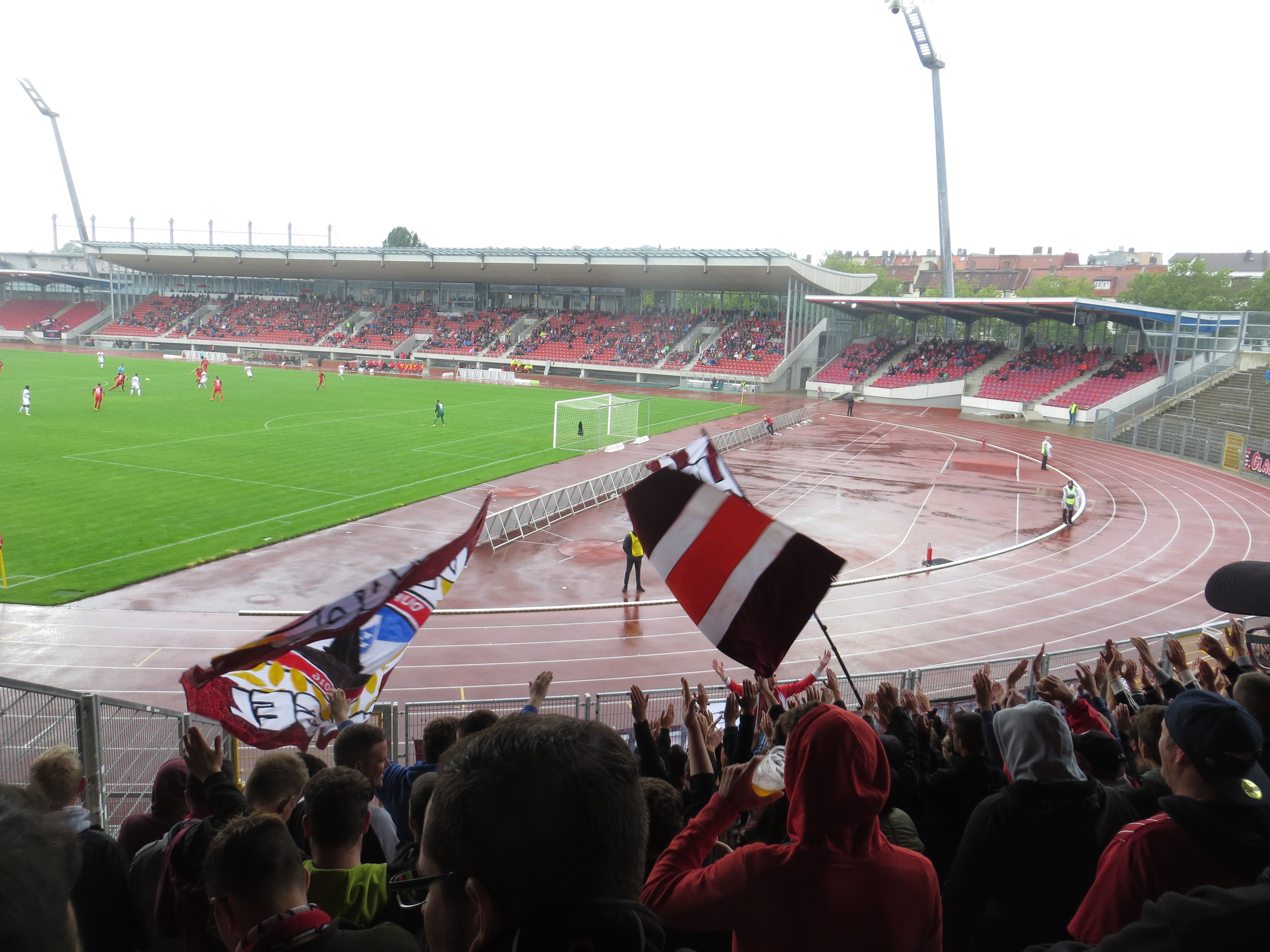 Viel zu früh ging es heute aus den Federn, denn auf dem Rückweg nach Berlin, hatte ich mich bei Vudi Röller höchstpersönlich angekündigt, um mit ihm einem Klassiker der Regionalligasüdwest beizuwohnen. Mit der Zugverbindung ging alles glatt und so kam ich pünktlich um halb 1 in Kassel an. Auch dort begrüßte mich ein Empfangskomitee, denn Vudi holte mich am Bahnhof ab. Der leicht tröpfelnde Regen war schon Grund genug für den Herren auch noch seinen Vater einzuspannen und mit dem Auto vorgefahren zu kommen. Danke auf jeden Fall dafür. Nach einem kurzen Aufenthalt im Hause der Familie Röller und einer kleinen Brotzeit, ging es zum Kasseler Auestadion. Der Parkplatz direkt am Stadion war kostenfrei und 20 Minuten vor Anpfiff noch nicht einmal überfüllt. Tieferklassiger Fußball, du bist ein Phänomen. Das Wetter war abermals zum Fürchten und so fröstelte ich in meinem bierübergossenen Pullover von gestern ziemlich. Oberste Priorität war hier heute ein Dach über dem Kopf zu haben und so kauften wir uns Karten für die Nordkurve und nahmen im oberen Bereich des Kassel Fanblocks Platz. Dieser war ganz gut gefüllt, wobei sich nur circa 200 Mann konstant an der Stimmung beteiligten. Bei den Liedern waren einige Schmuckstücke dabei, während bei anderen schon etwas die Ohren bluteten. Ein wahres Kuriosum war ein Klatschrythmus, der regelmäßig bei Standardsituationen zelebriert wurde. Für meine ungeübten Ohren klang das ziemlich unmelodisch, aber Vudi war hier anderer Meinung und traf den nicht zu treffenden Takt konstant. Für eine Regionalligaszene war das hier schon sehr solide. Auch einige Anhänger von Stuttgart II mit einer Fahne im Gepäck waren im Stadion anzutreffen. 1800 Zuschauer wurden hier als anwesend gemeldet. Eine Zahl, die ich zumindest mit einem kleinen Fragezeichen versehen würde. Fußball gespielt wurde hier übrigens auch. In der ersten Halbzeit aber vor allem von den Stuttgartern. Kassel spielte eine Hälfte zum Gruseln und war mit dem 0:1 zur Halbzeit noch gut bedient. In der zweiten Hälfte, trumpfte Kassel jedoch groß auf und war die bessere Mannschaft. Folgerichtig konnte das Spiel mit 2:1 sogar noch gedreht werden. Durch einen abgefälschten Freistoß, traf Stuttgart ärgerlicherweise jedoch noch zum 2:2 Endstand. Völlig durchgefroren ging es zurück zum Hause der Röllers, wo ich noch mit leckerem Kuchen versorgt wurde. Auch hier ein großer Dank an die Gastfreundschaft und auf bald!