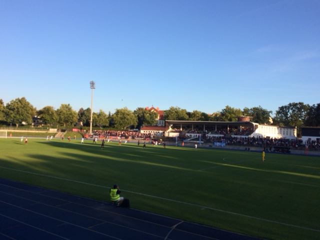 Der Mittwochabend bot ein Nachholspiel der Regionalliga Nordost. Nach den abgeschlossenen Umbauarbeiten zog Viktoria wieder zurück in das Stadion Lichterfelde. Das Spiel wurde zum Hochsicherheitsspiel deklariert, was stets den unangenehmen Nebeneffekt einer Preiserhöhung mit sich bringt. So gibt Viktoria den Sicherheitsaufschlag direkt an die Fans weiter und der Eintritt kostet ermäßigt 10 Euro, was für diese Liga schon ein stolzes Sümmchen ist. Warum man ein solches Spiel aber zum Sicherheitsspiel ausrufen muss, ist mir völlig schleierhaft. Gerade für Amateurvereine, bedeutet dies stets eine enorme finanzielle Belastung, da zum Beispiel der Ordnungsdienst aufgestockt werden muss. Begleitet wurde ich heute neben Lisa von einem Ostberliner Original, der es völlig überraschend über die Grenze geschafft hatte und sogar noch einen Kumpel im Gepäck hatte. Es wurde sich noch mit einer Bratwurst und einem Radler eingedeckt, bevor wir unsere Plätze an der Bande einnahmen. Ich mag die Heimspielstätte von Viktoria wirklich, da man die Auswahl hat auf der Tribüne Platz zu nehmen oder sich auf der gegenüberliegenden Seite einfach an die Bande zu stellen. Das Spiel begann sehr erfreulich durch den 1:0 Führungstreffer von Viktoria. Im direkten Gegenzug sorgte der BFC aber für den Ausgleich. Kurz vor der Halbzeit konnte der BFC dann sogar den Führungstreffer erzielen. Wenige Minuten vor Schluss erhöhte der BFC dann durch einen Konter sogar auf 1:3 und verließ verdientermaßen als Sieger das Feld. Viktoria war einfach nicht clever genug in diesem Spiel. Viktorias 3-Mann Fanszene sang auf jeden Fall konstanter als der BFC. Dort beschränkte man sich auf einfache Lieder nach den Toren, sowie auf vereinzelte Sprechchöre. Über weite Teile des Spieles herrschte jedoch Stille und man hörte nur die Unterhaltungen der Zuschauer, sowie das Brüllen der Spieler. In Erinnerung bleiben wird das Spiel jedoch vor allem wegen des nahezu epischen Kampfes gegen Mücken und Wespen, die vor allem mich ausnahmslos traktierten. So war der Abpfiff relativ erlösend und mit dem Fahrrad ging es zügig nach Hause.