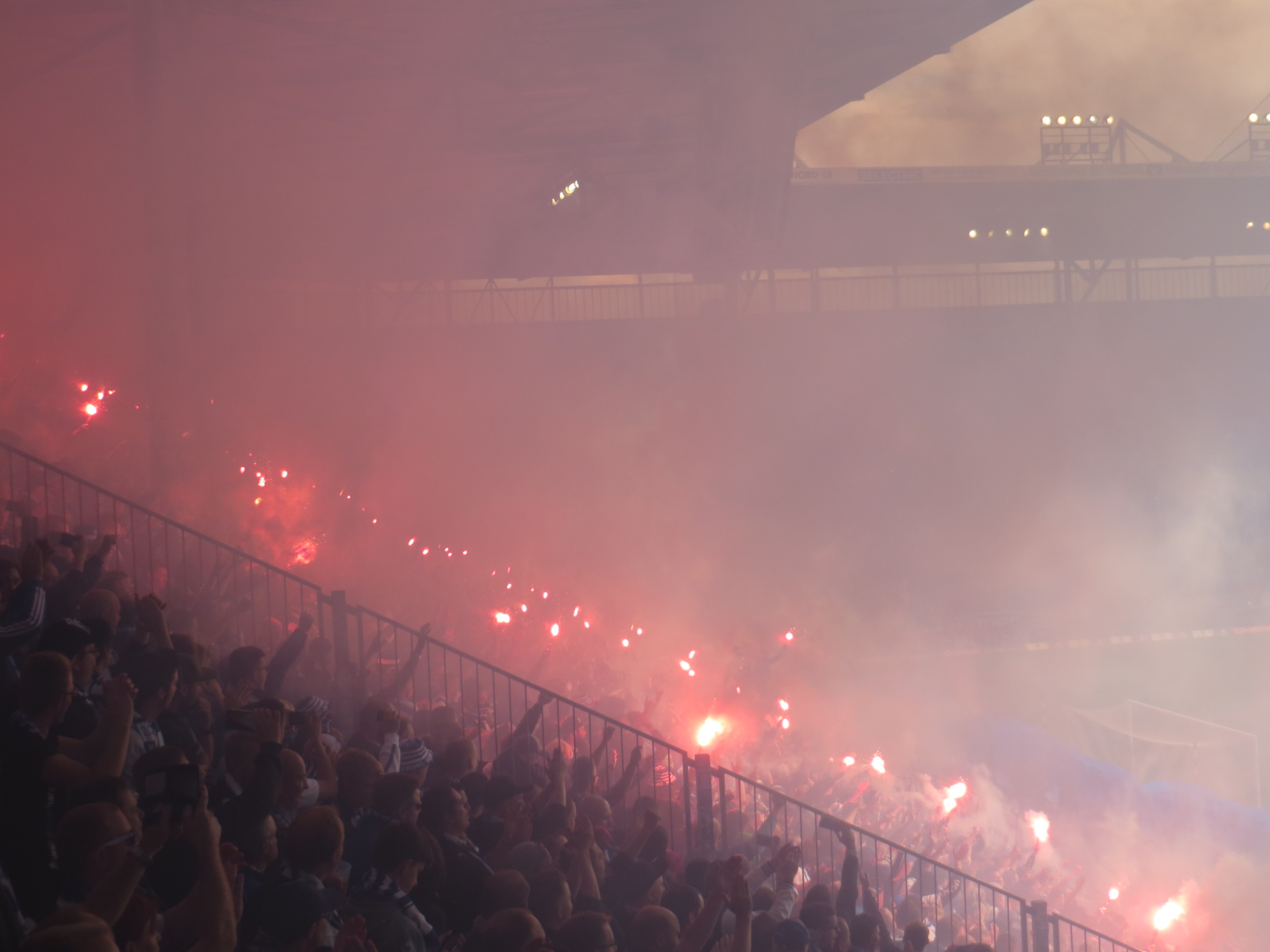 Als der 1.FC Magdeburg mich als Bestandskunde anschrieb und mir ein Vorverkaufsrecht gegen die Hansa Kogge einräumte, konnte ich natürlich nicht nein sagen und schlug zu. Bero war gewohnt großzügig und erklärte sich bereit uns in Magdeburg herauszuschmeißen. Wir ließen uns bis zur Universitätsbibliothek fahren, da ich dort mit kostenlosen Schließfächern rechnete. Wir brauchten dann aber fast eine  halbe Stunde, bis wir überhaupt den Eingang zur Bibliothek gefunden hatten. Dann folgte der nächste Schock, denn die Schließfächer konnte man nur mit einem Bibliotheksausweis verschließen. Eine Nachfrage beim unfreundlichen Bibliothekspersonal brachte nur einen hellhörig gewordenen Sicherheitsdienst ein. Da wir aber nicht wirklich eine Wahl hatten, belegten wir trotzdem ein Schließfach und machten die Tür einfach zu ohne abzuschließen. Ich bin ja nicht umsonst ein Sonntagskind. Dann liefen wir in Richtung des Stadions und die Vorfreude stieg von Sekunde zu Sekunde an. Von überall strömten Fußgänger und Fahrradfahrer zum Stadion. Ab und zu detonierte in der Ferne ein Böller und sorgte für ein Kribbeln. Am Stadion war dann aber alles entspannt, bis auf einen Flaschensammler, der seinen Einkaufswagen mit einem AFD Plakat geschmückt hatte. Ach, Deutschland im Jahr 2017. Wir betraten dann unsere Plätze im Stehplatzblock 2 direkt neben Block U. Dort positionierten wir uns im oberen Teil des Blocks und warteten auf den Anpfiff. Magdeburg startete mit einer dreiteiligen Choreo in die Partie. Interessanterweise startete man erst nach dem Anpfiff mit der Durchführung. Keiner hielt schon Zettel nach oben, als er es noch nicht sollte. Es ist einfach verrückt. Ob die Ossis einfach besser auf Befehle hören können oder was es ist, ich weiß es nicht. Jedenfalls klappte die Durchführung wunderbar. Hinter einem Spruchband: „Und wenn unsere Chöre laut erklingen- Dann sind wir die Grösten (sic!) auf der Welt“ wurde durch Zettel in einem ersten Schritt ein „Club“ gebildet, was nach einer Minute zu einem „Fans“ umgewandelt wurde. Dann wurden die Zettel verstaut und im gesamten Block U circa 100 Fackeln angerissen. Es entstand ein zauberhaftes Bild und die Durchführung war hervorragend. Der Rechtsschreibfehler wurde per Spruchband in der zweiten Halbzeit mit einem ironischen „Hurra Hurra… Das S ist da“ wettgemacht. Auch die Stimmung war wieder auf einem tollen Niveau. Es gab Wechselgesänge über alle vier Tribünen und auch sonst eine gute Mitmachquote und Lautstärke. Es war jedoch vielleicht einen Tick leiser als gegen Würzburg, was die Protagonisten in Block U auch unzufrieden machten. Dennoch habe ich eine solche Heimspielstimmung in Deutschland einfach noch nicht erlebt. Wirklich toll.