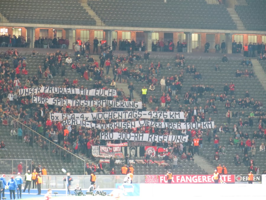 Auf den Rängen war das heute ein positiv stimmender Auftritt. Die Lautstärke des Bilbao Spiels wurde zwar nicht erreicht, aber es war ein entspannter und lockerer Abend. Attribute, die im grauen Bundesligaalltag leider oftmals verloren gehen. Circa 700 Leverkusener fanden sich an diesem Mittwoch in Berlin ein. Die Fanszene flaggte den unteren Bereich des Blocks ab und verdiente sich das Prädikat stets bemüht. Akustisch kam auf unserer Seite jedoch so gut wie nichts an. Gemeinsam mit den Gästen gab es wieder einen Wechselgesang gegen den DFB.