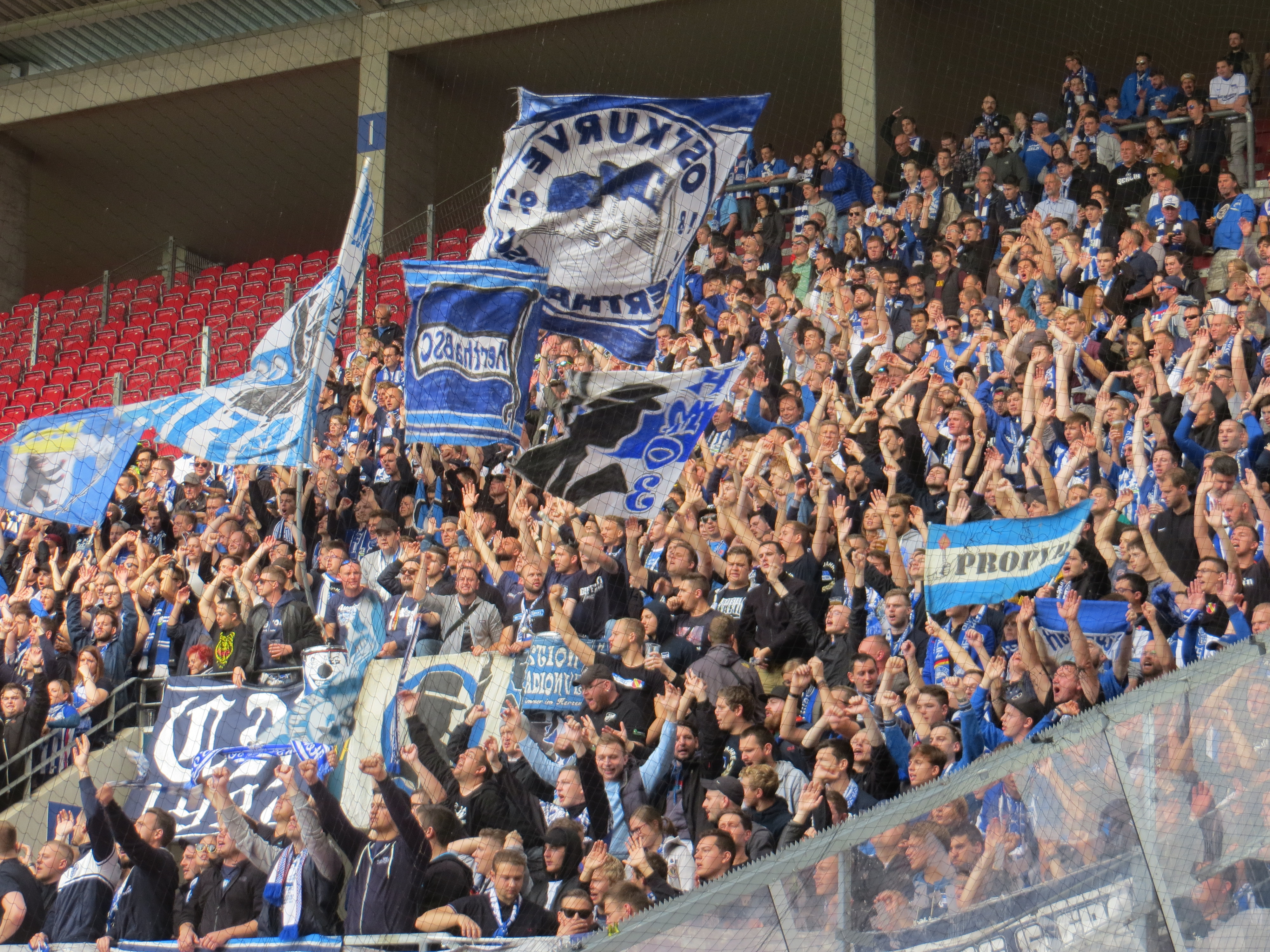 Wie ist eigentlich das Leben so für Menschen, deren Wochenenden nicht durch Fußball durchgetaktet sind? Einen kleinen Vorgeschmack liefern die Spieltage, an denen man bereits am Vortag angereist ist. Wenn man sich um 5.00 noch einmal umdreht und einem kurz der Gedanke kommt, dass die Anderen jetzt losfahren müssen… Wahnsinn. Ausgeschlafen und frisch startete ich hingegen in den Tag und nach einem Frühstück ging es ziellos in die Mainzer Innenstadt. Auch die Sonne ließ sich ab und zu blicken und so war es ein durchaus angenehmer Tag im Frühherbst. Es war der Tag vor der Bundestagswahl und dementsprechend aktiv waren die Parteien. Auch die Freunde von der AFD waren zahlreich am Start, was einen stets vor die unbequeme Frage stellt, wie man damit umgehen soll. Wir entschieden uns nach reiflicher Überlegung für nichts tun und schlenderten weiter durch die Altstadt. Wir holten dann den Klabauterkeeper am Mainzer Hauptbahnhof ab, der sich wegen einer Mischung aus Hertha, Vudi und Restfahrten auf dem Bahnsommerticket auf den Weg gemacht hatte. Chapeau und Danke für das Fotografieren. Dann ging es per Shuttlebus zum unansehnlichen Stadion in Mainz. Auch hier war meine Konsequenz schon einmal größer. Wenn man Shuttlebus fahren soll, macht man ein Riesentheater und will laufen und heute steige ich einfach freiwillig in so einen Bus. Die Bequemlichkeit sie kommt. Ich war circa 45 Minuten vor Anpfiff im Block, in dem noch kaum jemand aus der Szene zugegen war. Der Hauptmob kam dann einige Minuten später und entschied sich heute dafür den unteren Bereich des Blockes frei zu lassen und sich über den Mundlöchern zu positionieren. An sich keine schlechte Idee, aber durch die späte Ankunftszeit steht man dann einfach meistens Scheiße und es sind Leuten an Plätzen, an denen sie nicht stehen sollten. Auf den Rängen war das heute wieder eher mäßig. Wir spulten unseren Standardstiefel ab, aber die Ausreißer nach oben blieben einmal mehr aus. Die Mannschaft bot einem aber auch wieder keinen Grund. Die Leistung beider Teams war heute einfach nur gruselig. Es gab so gut wie keine Chancen und zu 95% wurden hier heute nur Querpässe gespielt. Wie so oft auswärts eine unglaublich schwache Leistung. Man fragt sich wirklich ob die Mannschaft überhaupt gewinnen möchte. Gegen so eine Mainzer Mannschaft wäre das nämlich durchaus im Bereich des Möglichen. Der Gegentreffer fiel durch einen Videobeweis- Elfmeter. Juhu. Auch nach Ansehen der Wiederholung bin ich da sehr skeptisch, zumal eine ähnliche Szene auf unserer Seite nicht einmal angesehen wurde. Fußballmafia DFB!