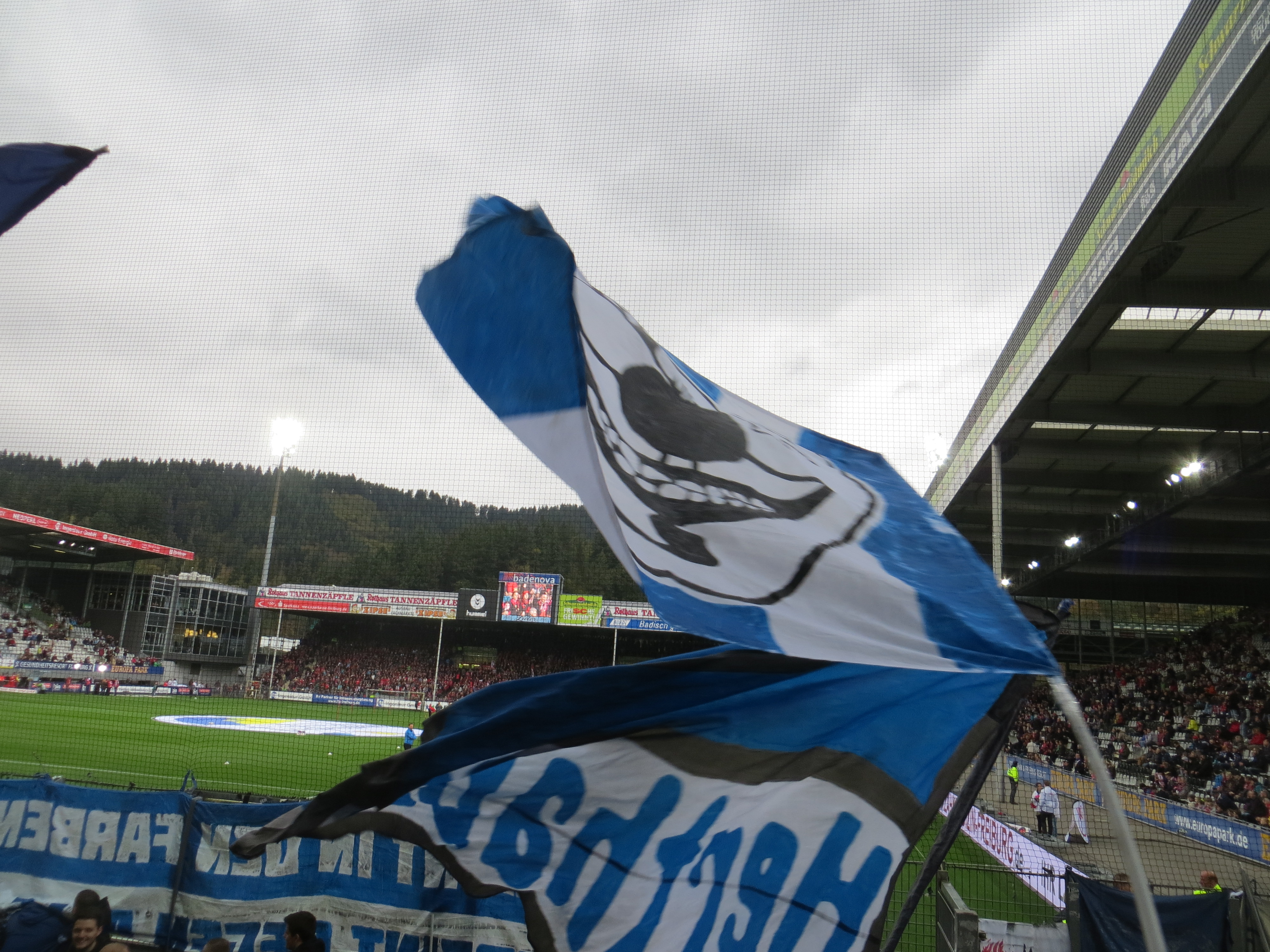 Ich hatte unglaubliche Lust auf die Tour in den tiefsten Süden der Republik. Am Vortag hatte ich die S-Bahn-Verbindung gecheckt und mir wurde ein Zug um 5.50 angezeigt. Das hätte mir eine knappe, aber doch sichere Anfahrt zum Hauptbahnhof ermöglicht. Als ich am Morgen die Pünktlichkeit überprüfen wollte, stellte ich geschockt fest, dass die Bahn doch erst um 06.00 fuhr. Mit einer Mischung aus Panik und Fatalismus prüfte ich weitere Möglichkeiten zum Bahnhof zu kommen. Es gab keine gute. Ich raste mit dem Fahrrad zum Rathaus Steglitz, nahm dort die U-Bahn und fuhr dann vom Zoo in einem Affentempo (haha!) zum Hauptbahnhof. Dort stellte ich in Sekundenbruchteilen mein Fahrrad ab, rannte zum Gleis und kam um 6.28 an. Abfahrt war um 6.30. Man, man, man. Völlig durchgeschwitzt, brauchte ich erst einmal eine halbe Stunde, um wieder herunterzukommen. Ich machte erst einmal einen Spaziergang zu meinen Kumpels, um mir mein Frühstück abzuholen. Danke an dieser Stelle für den Support! Dann musste ich mich unkorrekterweise in mein Abteil verabschieden, denn ich wollte die Stunden nutzen, um an meiner Masterarbeit zu werkeln. Von einer Glasscheibe getrennt verfolgte ich die Fahrt anderer Herthaner, die sich zu großen Teilen schon zu früher Stunde in andere Dimensionen schickten. Fast in Dauerschleife ließ der neue Hit „Morgens, Mittags, Abends ich muss saufen- der Hahn muss laufen.“ Das kreierte eine sehr produktive Atmosphäre, in der ich prächtig vorrankam. Nach circa drei Stunden bekam ich Besuch in meinem Abteil und die drei anders gestalteten Stunden, machten sich im Lautstärkepegel bemerkbar. Ich verließ erst einmal mein Abteil mit Kindern und führte das Gespräch im Gang. Irgendwann kamen wir dann in Freiburg an und als ersters stürmte alles zu den Schließfächern. Es gab nur riesige Dinger für 5 Euro. Absolut geisteskrank. Da hätte man locker ein paar Kinderleichen verstauen können, was man dann auch gerne gemacht hätte, einfach um den Platz in irgendeiner Form zu nutzen. Ich verzichtete erst einmal und versuchte mein Glück in den umliegenden Hotels. Diese hatten jedoch enorme „Sicherheitsbedenken“ und wiesen mich alle eiskalt ab. Danke Deutschland, ich küsse dein Herz! Also doch ein Schließfach für fünf Euro. Dann schlenderte ich noch durch die Stadt, die wie immer sehr schön wirkte. Um ein bisschen die lokale Küche zu genießen, gönnte ich mir in einem Café eine Currywurst mit Pommes. Meine Lust früh am Stadion zu sein, war heute auch nicht existent und so schlenderte ich erst noch ausgiebig durch die Gassen, bevor ich eine Bahn nahm und erst um 15.00 am Stadion war. Der Gästeblock in Freiburg ist ein einziges bauliches Disaster. Erst ab der circa vierten Reihe sieht man einen kleinen Ausschnitt des Spielfelds. Das ganze Spielfeld kann man glaube ich an keinem Ort des Gästeblocks sehen. Unser Vorsänger äußerte zu Beginn erst einmal Respekt an jeden, der die Reise an diesem Sonntag nach dem ganzen Gegurke der letzten Wochen, auf sich genommen hatte. Man sah auch erschreckend viele Gesichter, die unter der Woche in Lviv waren. Unter den knapp 1.300 Herthanern weilten auch wieder etliche Leute aus Karlsruhe. Die Stimmung war heute eher mäßig. Gerade nach den Vorfällen um Mitchell Weiser, der Fans am Flughafen sinngemäß entgegengeschleudert hatte: „Dann bleibt doch einfach zu hause. Ihr wart sowieso extrem leise und außerdem verdiene ich gar nicht so viel Geld“, war die Wut auf die Mannschaft ziemlich hoch. Die erste Halbzeit sollte aber noch einen Aufreger bereithalten. Julian Schuster, die alte Schabe sollte direkt vor unserem Block eine Ecke ausführen. Um seine Konzentration etwas zu fördern, wurde er durch eine Melodie aus unserem Megafon unterstützt. Die weinende Schabe musste daraufhin seinen Versuch abbrechen und heulte sich beim Schiri aus. Dieser hatte aber auch keine Einsicht und forderte Schuster auf den Eckstoß auszuführen. Nun waren natürlich alle Dämme gebrochen und alle Gestalten, die wir so aufbieten konnten, versammelten sich am Zaun und unterstützte Schuster moralisch. Als er dann theatralisch auch diesen Versuch abbrach und kurz danach wieder zur Eckfahne trottete, erbarmte sich jemand und verdünnte seinen Schweiß mit etwas Speichel. Erneute Theatralik und sein Teamkollege musste ihm dann die Spucke wegmachen. Nach drei Minuten wurde dann endlich die Ecke ausgeführt. Dann holperte vor unserem Zaun ein Freiburger Offizieller herum und regte sich tierisch auf. Was für ein sympathischer Verein. Auch auf den Tribünen übte sich das Spießbürgertum im kollektiven Kopfschütteln. Wir fühlten uns in der Situation natürlich pudelwohl und gaben Gesänge wie „Wenn wir wollen, schlagen wir euch tot“ zum Besten. Wunderbar. Dann war auch schon Pause und alle konnten sich wieder ein wenig beruhigen.