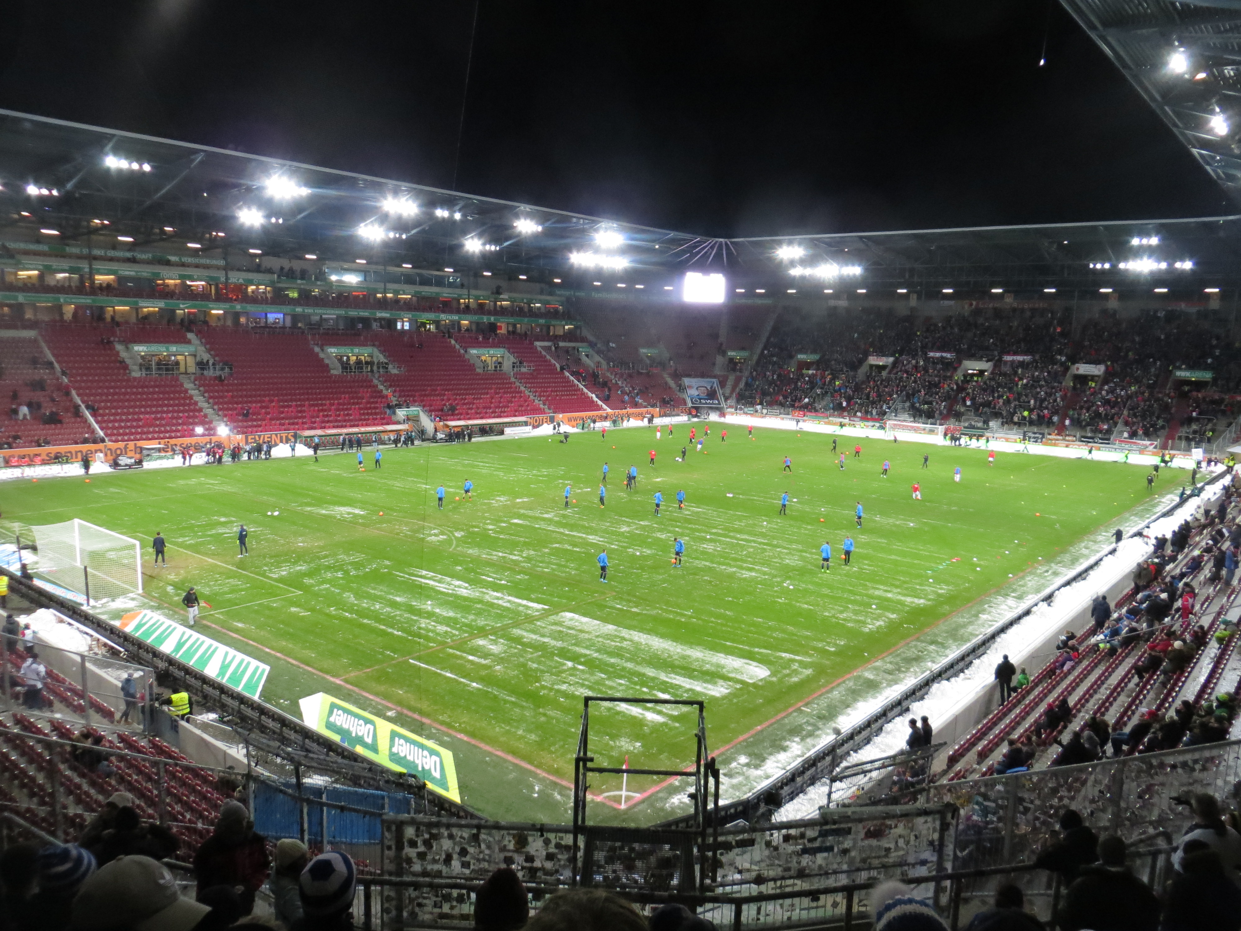 Die Fahrt war ähnlich fürchterlich, wie in Köln vor zwei Wochen. Ein absolut schauderliches Publikum, das sich in einer Sprache unterhielt, die ich nicht verstand. Dazu Fraternisierungsversuche zwischen 50-jährigen dickbäuchigen, völlig besoffenen Herthanern und Augschburgern. Herrlich! Irgendwann erreichten wir die hässliche Arena an der Autobahn und ich betrat erst circa 20 Minuten vor Anpfiff den Block. In diesem befanden sich zu dem Zeitpunkt vielleicht 100 Herthaner, die wohl größtenteils aus der Region kamen. Eine SMS brachte Gewissheit und die Fanszene steckte tief im Schneegestöber und würde den Anpfiff nicht pünktlich erreichen. Mein Glück, dass ich mit dem Zug angereist war. In solchen Situationen ist es furchtbar mitanzusehen, wer und vor allem wie das entstehende Vakuum gefüllt wird. Ich verbrachte die erste Halbzeit also Fußball guckend, bzw. eher nur mit gucken, denn dass was Hertha anbot konnte man nicht wirklich als Fußball bezeichnen. Es lief einfach gar nichts zusammen und nur durch Glück stand es zur Pause noch 0:0.