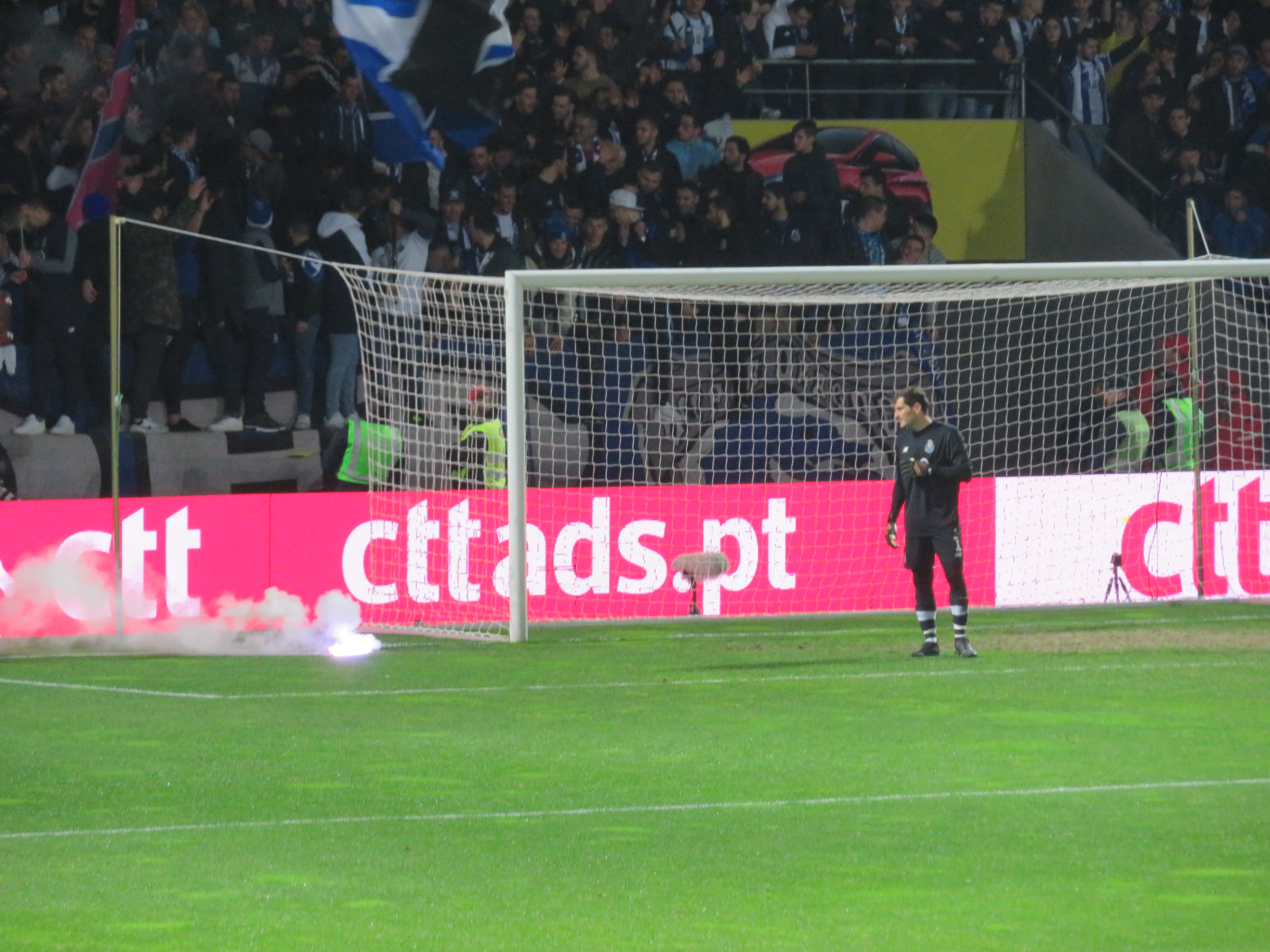 In der zweiten Halbzeit beruhigte sich das Spiel etwas und Porto konnte noch den Siegtreffer erzielen. Die aktive Fanszene um die Superdragoes, riss mich heute nicht vom Hocker. Zwar sorgte die bekannte Zaunfahne für Gänsehaut, aber gerade akustisch ist das eher nicht mein Ding. Die Melodien sind wirklich sehr simpel und die Laustärke arg verbesserungsfähig. Optisch war das etwas ansehnlicher, auch wenn man Bengalos auch mal in der Hand halten kann und sie nicht unbedingt auf den eigenen Torwart werfen muss, selbst wenn er Spanier ist. Die kleine Fanszene von Paços war heute von einer Tribünensperre betroffen und stürmte kurz vor Schluss ins Stadion, um ein Spruchband gegen den Verband zu zeigen. Dafür gab es Applaus von den Porto Fans und vom Rest des Stadions. Nur die Polizei fand es nicht so witzig.