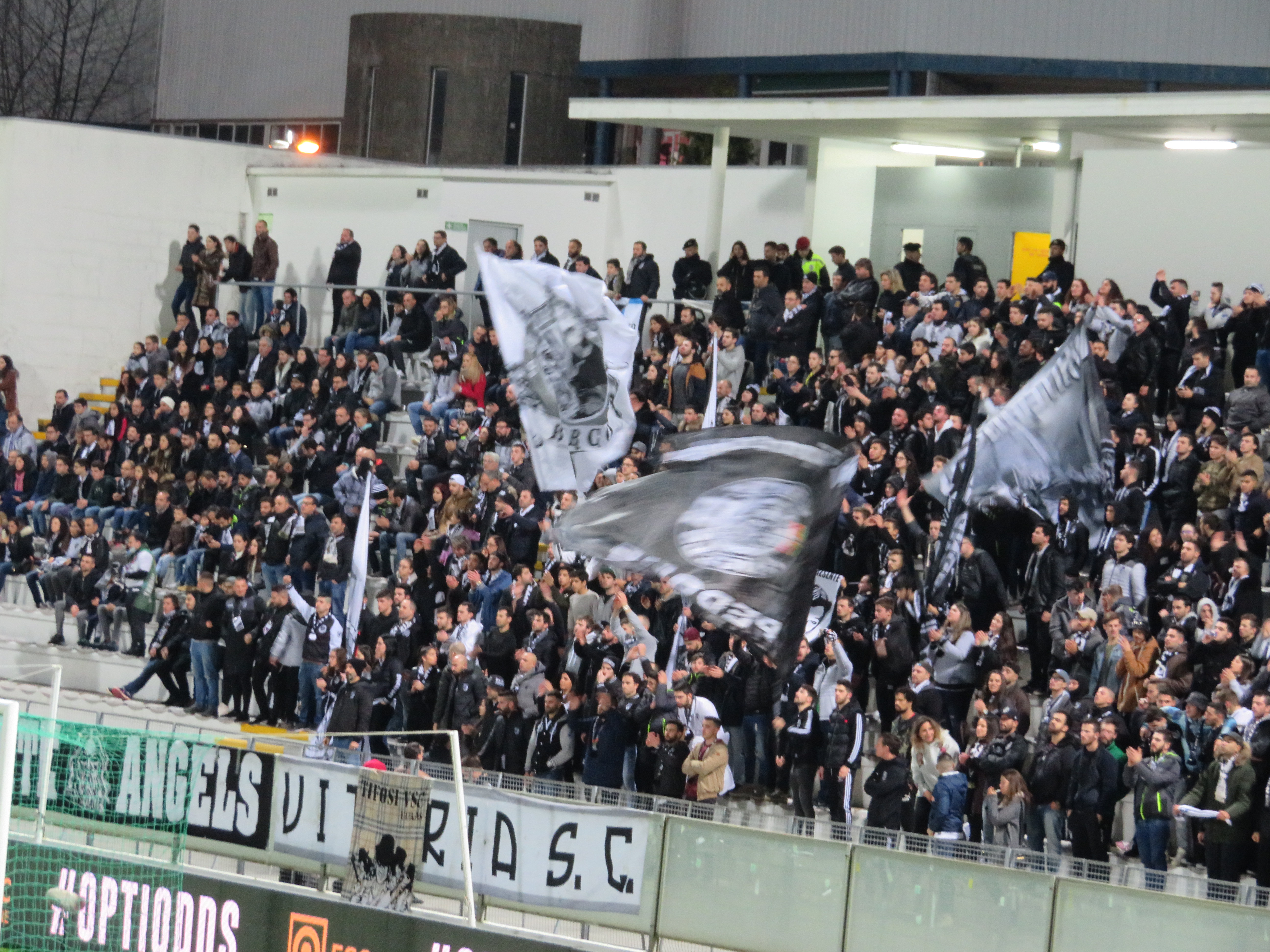 Der Weg zum Stadion von Moreirense führte uns dann über einen Berg, sodass man früh einen Blick auf die Flutlichter des Stadions hatte, was die Vorfreude ins Unermessliche steigen ließ. Der Blick auf die Uhr dämpfte diese jedoch auch wieder erheblich, denn wir waren spät dran. Die letzten Meter durch ein Wohngebiet wurden immer abenteuerlicher und dann standen wir plötzlich mitten in einem Dorf vor dem Stadion. Wir hatten viel Mühe mit der Parkplatzsuche, sodass wir mit drei Minuten Verspätung die Haupttribüne des Stadions betraten. Verspätung bei Spielen von Guimarães scheinen Tradition zu haben. Wir setzten uns in die Nähe der Guimarães Fans, sodass wir den wunderbar eingängigen Melodien lauschen konnten. Was für Ohrwürmer, die während der Spielzeit herausbretterten, war schon fast legendär. Fast bei jedem Lied musste man mitwippen und mitsummen. Dazu sind die Jungs und Mädels auch wirklich gute Sänger, sodass der Auftritt wirklich Spaß machte. Unterlegt wurden die Gesänge von etlichen einfachen Fahnen, die den guten Eindruck vervollständigten.