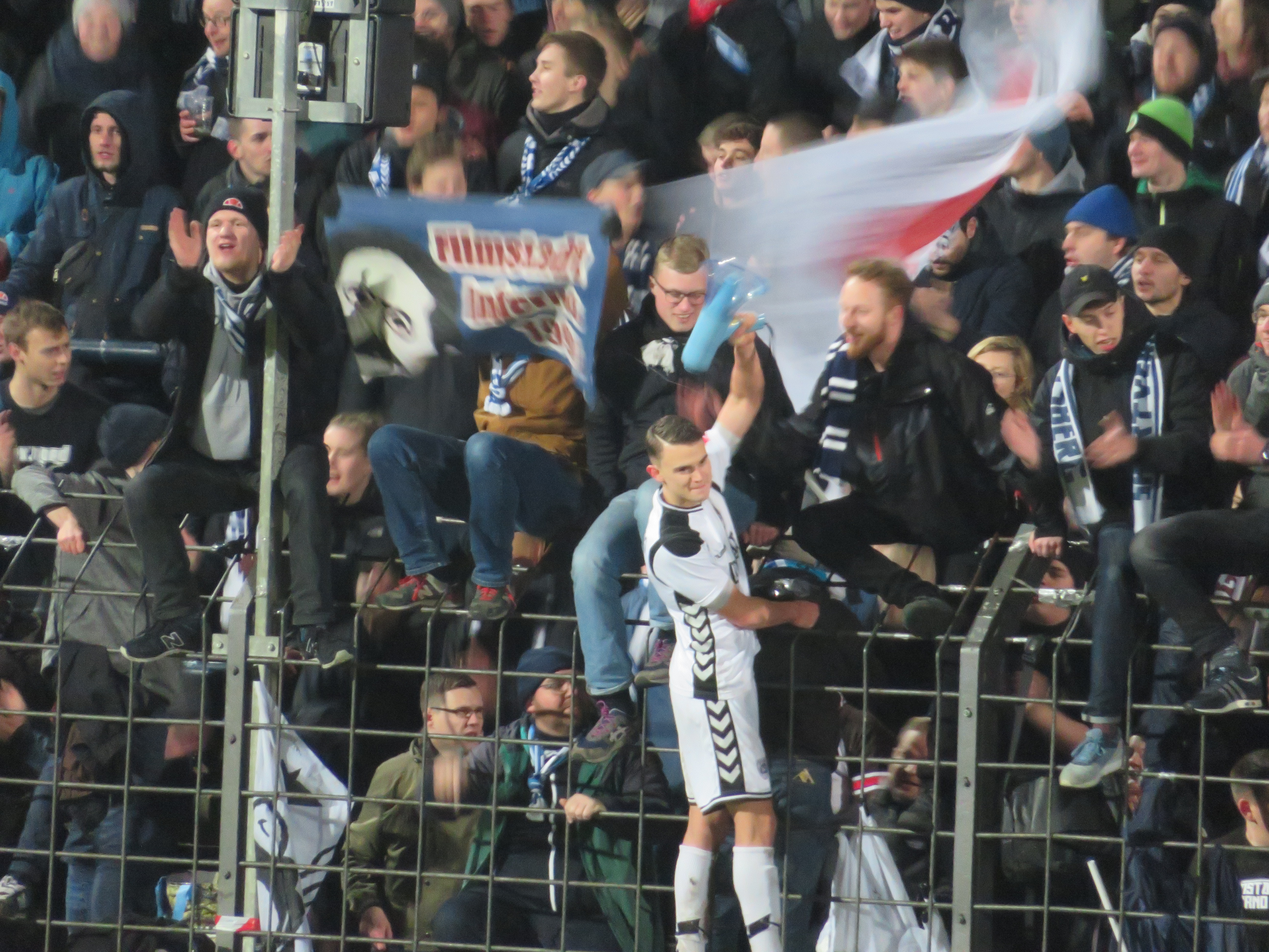 Eine tolle Aktion des Vereins, der sich so auf die Seite der Fans stellt und hoffentlich die Öffentlichkeit schafft, um auf die Missstände der Sportgerichtsbarkeit aufmerksam zu machen. Babelsberg war auf einem soliden Niveau. Anscheinend wurden heute auch viele Rosinenpicker von dem Gegner auf den Rängen angezogen und so waren heute wenige freie Plätze auszumachen. Zum Start gab es eine kleine Optische Aktion, die auch durch etwas blauen Rauch unterlegt wurde, was ein schönes Bild ergab.
