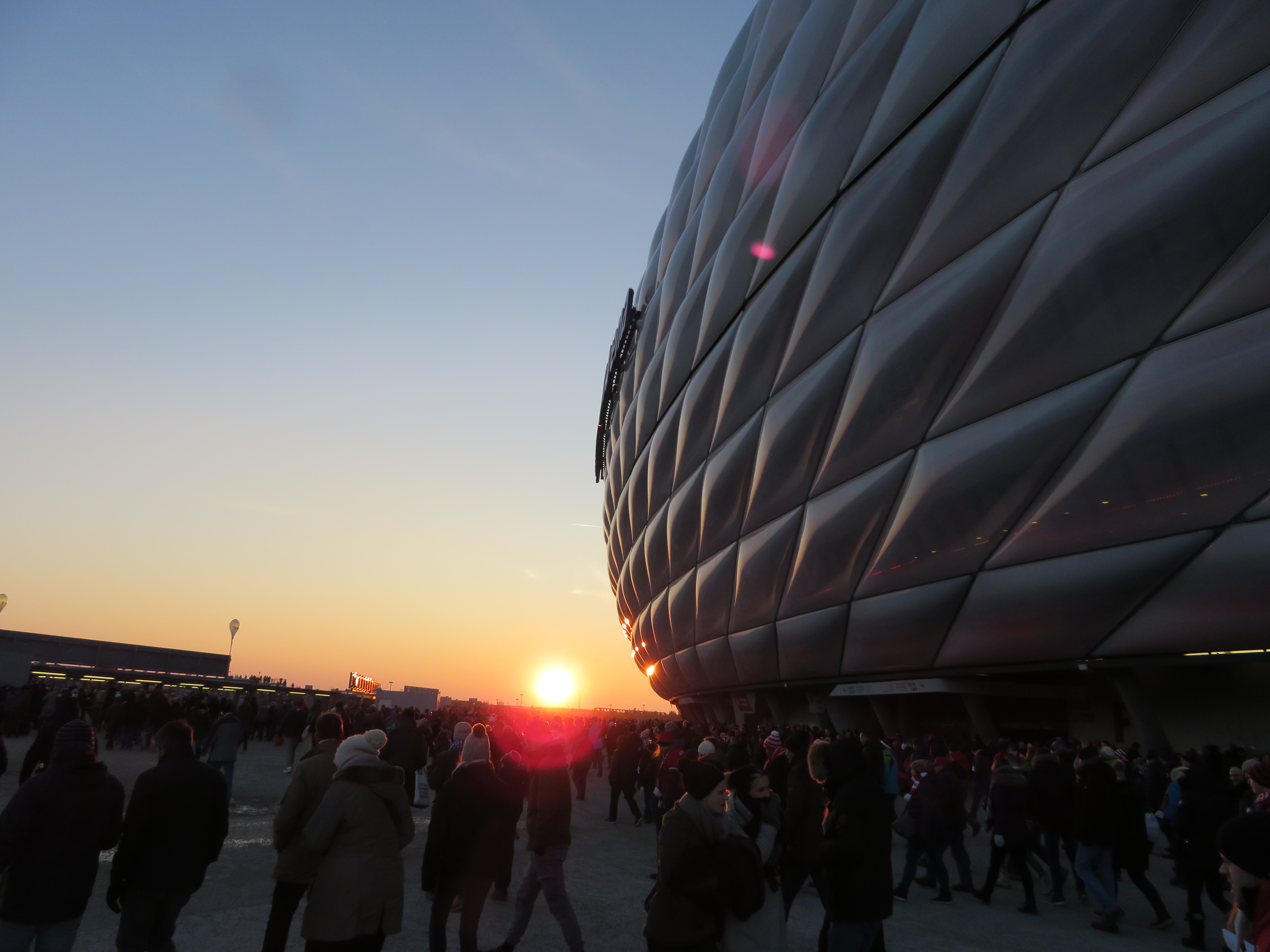 Am Spieltag selber fuhr ich mit der Tram erst in das nahegelegene Siegburg, um von dort in den ICE nach München zu steigen. Auf diese komfortable Reiseroute konnte ich spontan umsteigen, da meine eigentlich gebuchte Verbindung wie so oft nicht mehr existierte. Die Fahrt nach München verlief entspannt und gegen Mittag erreichte ich die gediegene Metropole des Südens. Nach wenigen Metern außerhalb des Bahnhofs war ich schon komplett erfroren. Das Thermometer zeigte heute Temperaturen um – 10 Grad und da es ein sehr klarer Tag und zudem noch windete, war jeder Schritt schmerzhaft. Dementsprechend flüchtete ich schnell in ein großes Kaufhaus, um mich erst einmal aufzuwärmen. Dort gab ich dann dem seit Wochen schwelenden Drang nach und kaufte mir eine lange Unterhose. Eine gute Investition, denn im Anschluss war die Kälte ertragbar. Das Kaufhaus sammelte mit kostenlosen Schließfächern weitere Punkte, sodass ich glücklich und zufrieden in die Münchener Kälte schritt. Ich aß noch ein deftiges bayerisches Mahl, bevor ich nach einem kleinen Stadtspaziergang mit der U-Bahn in Richtung Stadion fuhr.