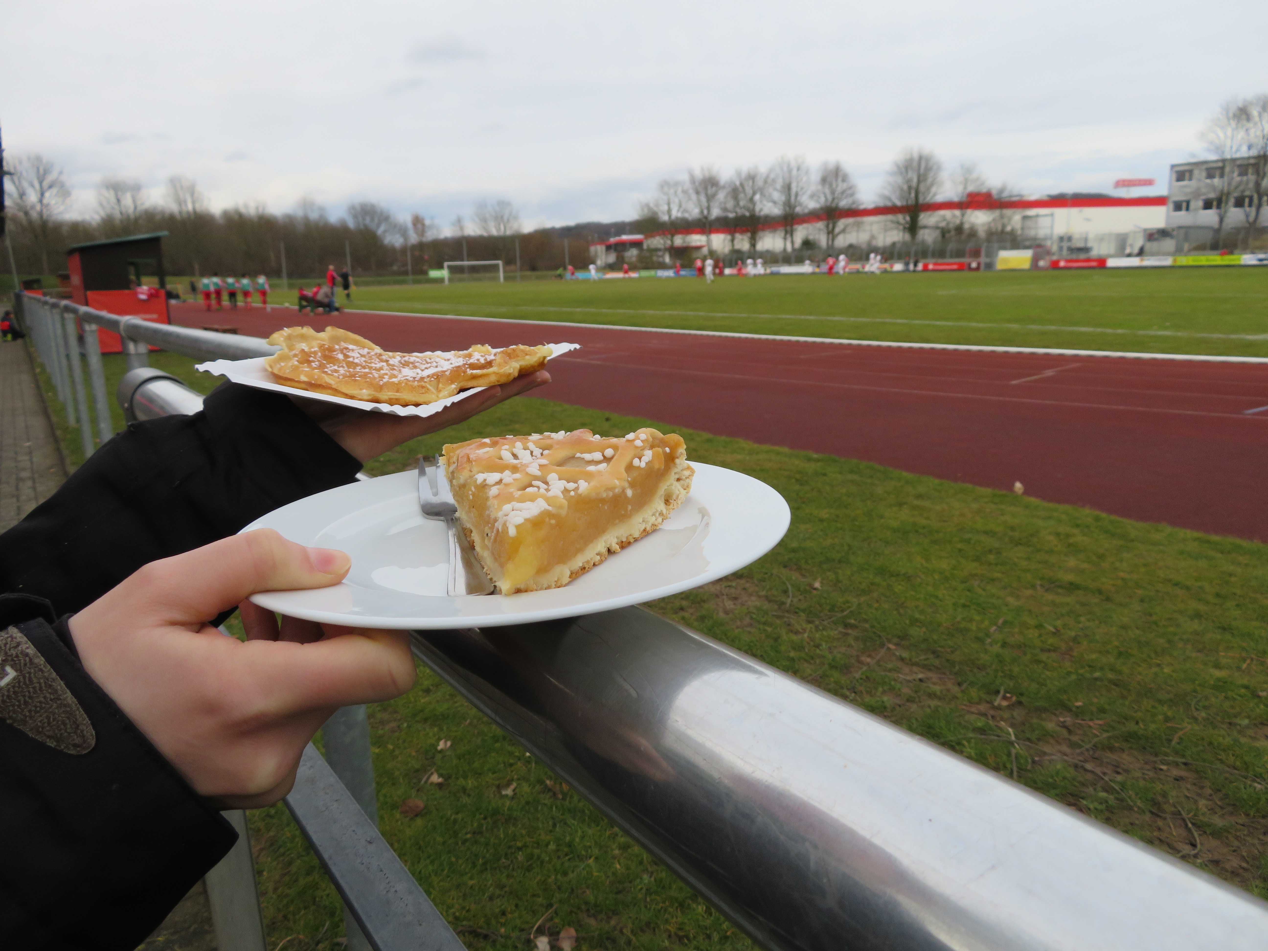 Auf der einen Seite des Stadions gab es eine kleine, schicke Tribüne. Außerdem konnte man sich in den restlichen Bereichen an die Bande stellen. Neben dem netten Ground, verzückte mich Hennef aber vor allem durch das unfassbare kulinarische Angebot. Es gab ein Vereinsheim, in dem die Preise sehr human waren und man in einer angenehmen Atmosphäre sogar Fußball gucken konnte. Außerdem gab es einen Kiosk, in dem es von Kuchen, zu Brezeln und belegten Brötchen wirklich alles gab was das Herz begehrte. Ich startete das Fest dann auch mit einer leckeren Wurst und gönnte mir in der zweiten Halbzeit sogar noch einen wohl mundenden Apfelkuchen. So darf es gerne öfter sein.