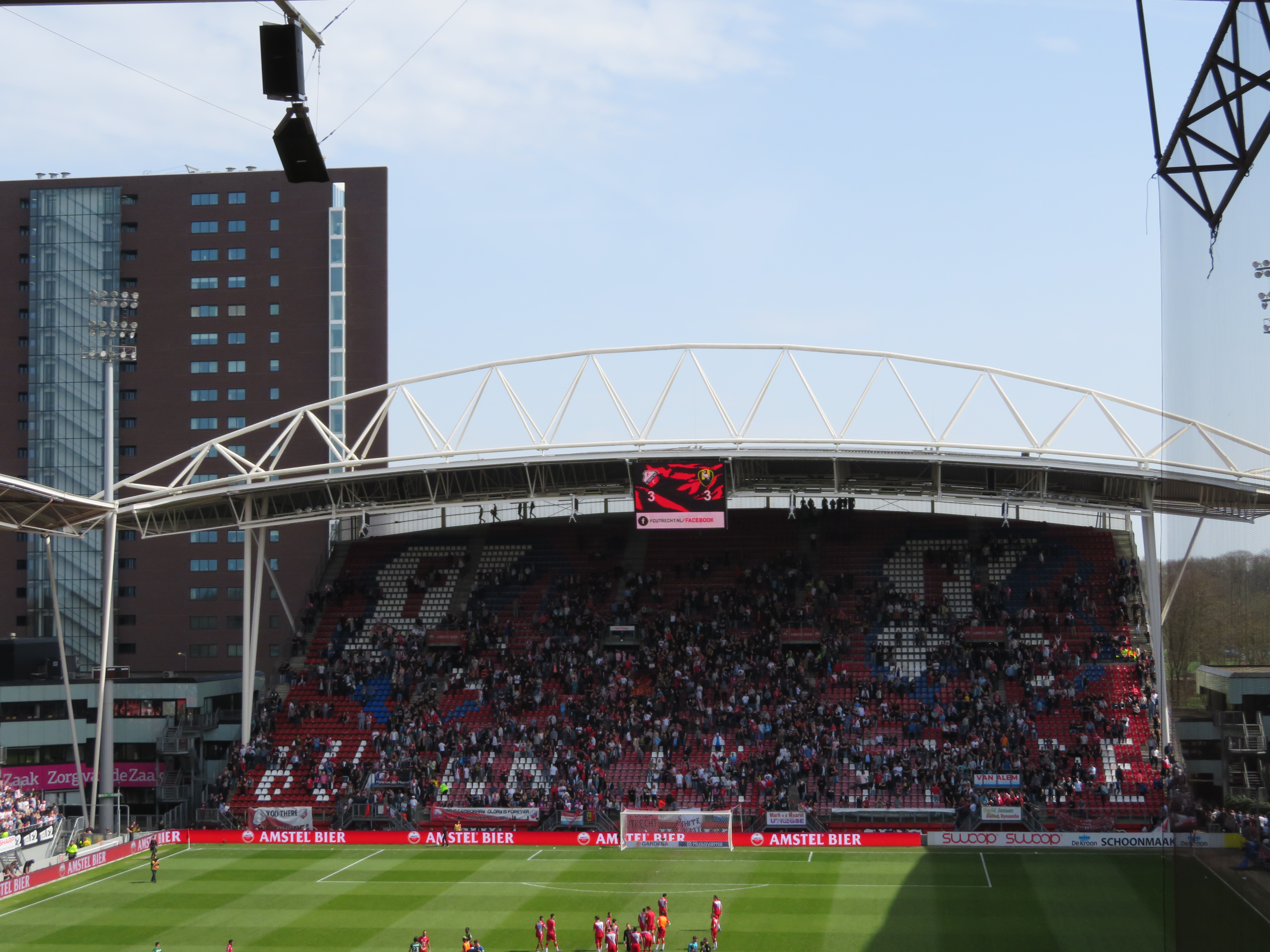 Für 17,50€ hatten wir unsere Tickets und drehten noch eine kleine Runde durch den angrenzenden Park, um das schöne Wetter zu genießen. Dann ging es in das Stadion, das mir rundum gut gefiel. Das Stadion lag fußläufig zum Zentrum und erinnerte mich stark an englische Spielstätten. Dazu gab es vier freistehende, steile Tribünen, die ordentlich etwas hermachten. Im Hintergrund schmiegte sich noch ein Wohnblock in das Bild, das hatte schon etwas. Wir hatten Plätze auf der Hintertortribüne gegenüber von den Utrecht Fans und somit die Ehre, direkt vor Kindern zu stehen, die ihre ersten Supportversuche unternahmen. Dafür hing eine Trommel am Zaun und es wurde ordentlich abgezappelt. Gott sei Dank, war das sehenswert genug, denn dadurch sah man gut und gerne nur noch 70% des Spielfelds. Dafür saß man wunderbar in der Sonne, was mehr als genug Grund war, um die Plätze nicht zu wechseln.