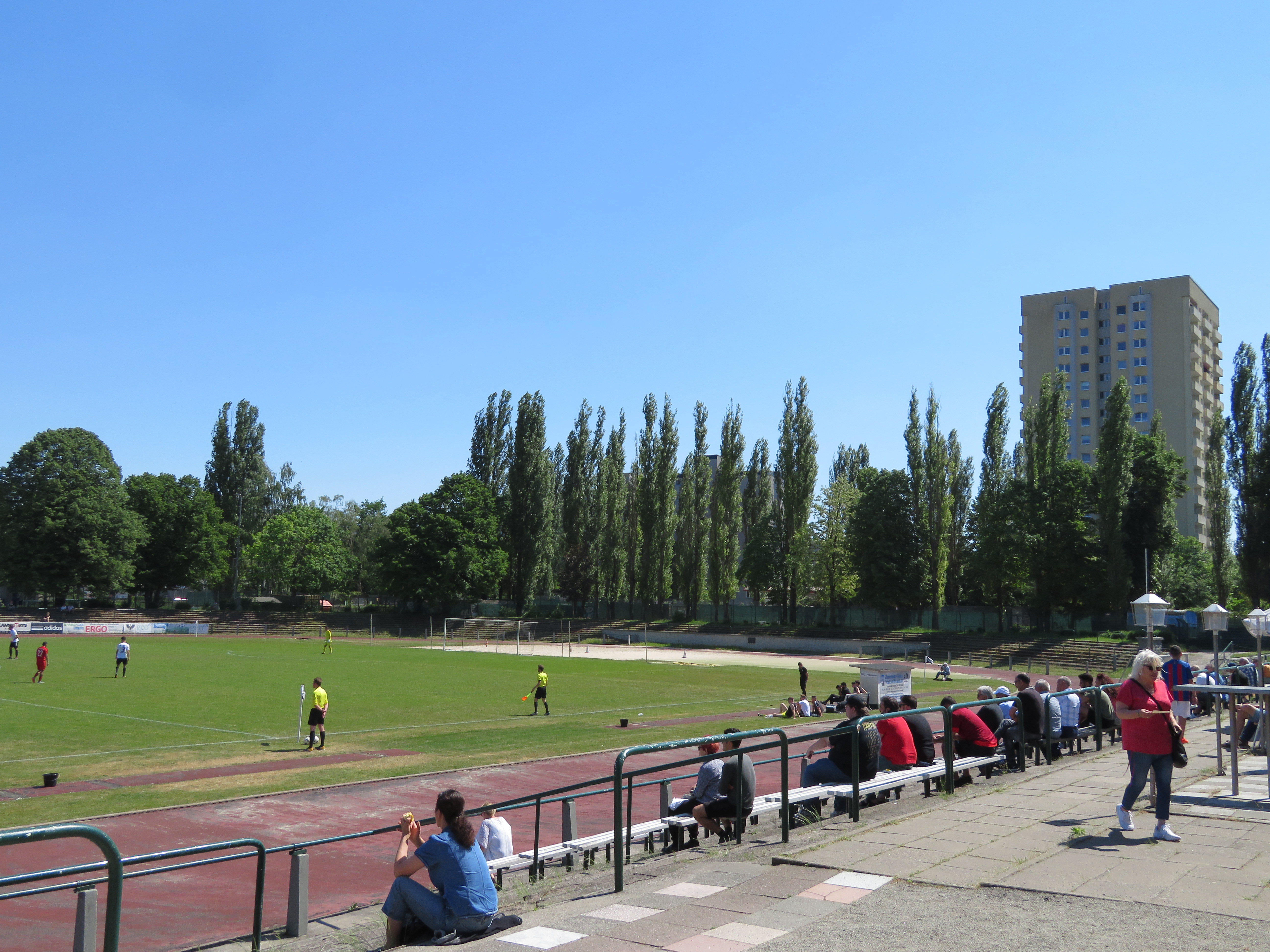 Der Fußballgott meinte es gnädig mit uns und legte dieses Spiel auf die für uns günstige 12:00 Anstoßzeit. Im schönen Lankwitz lockte das Preußenstadion mit einem Berlinligaspiel zwischen BFC Preußen und Al-Dersim. Das Preußenstadion wurde 1938 eröffnet und bot damals 20.000 Zuschauern Platz. Heute ist es nur noch für 3.000 Zuschauer zugelassen. Nach einer teilweisen Zerstörung im zweiten Weltkrieg wurde das Stadion nach und nach wiederaufgebaut und die Betonstufen, die erhalten blieben gelten als die ältesten Stehtraversen Berlins.