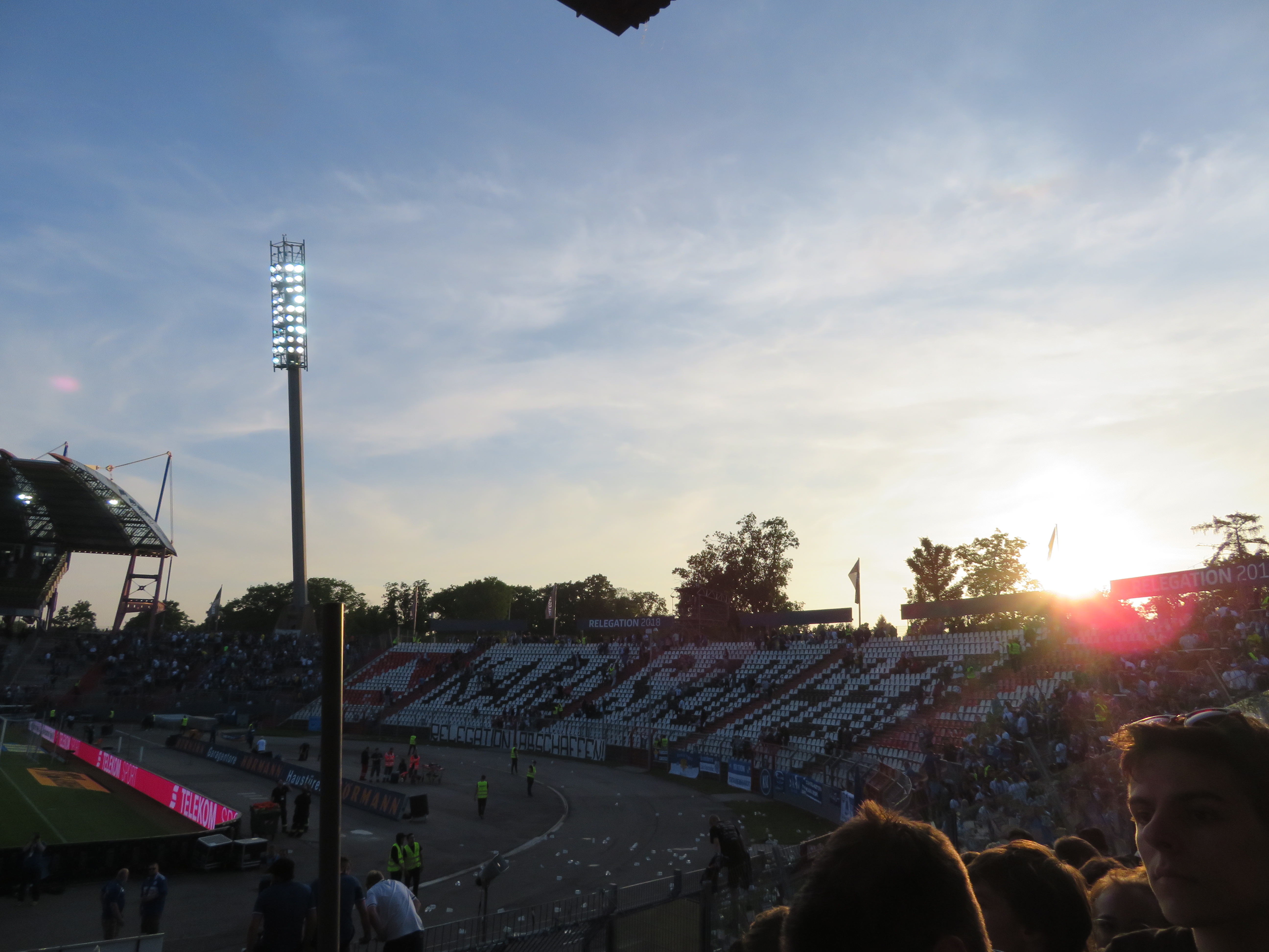 Um den Anpfiff zu erreichen, mussten wir den alten Schlangentrick anwenden und konnten uns so etliche Minuten ersparen. Das war auch bitter nötig, denn der Block war brechend voll und so standen wir mehr im Aufgang, als wirklich im Block. In der ersten Halbzeit sah ich somit vielleicht 20% des Spielfelds, während sich der Wert in der zweiten Halbzeit auf gute 50% erhöhte. Viel geboten wurde aber nicht, denn beide Mannschaften waren sehr darauf bedacht bloß keinen Fehler zu machen. So gab es viele Quer- und Rückpässe zu sehen und nur wenige zwingende Aktionen in Richtung Tor. Vollkommen verständlich, denn während der Relegationsspiele lastet ein unmenschlicher Druck auf den Spielern und den Vereinen. Dass dieser Druck nicht unbedingt zur Qualität der Spiele beiträgt, ist klar. Somit schließe ich mich den KA’lern an: Relegation abschaffen.