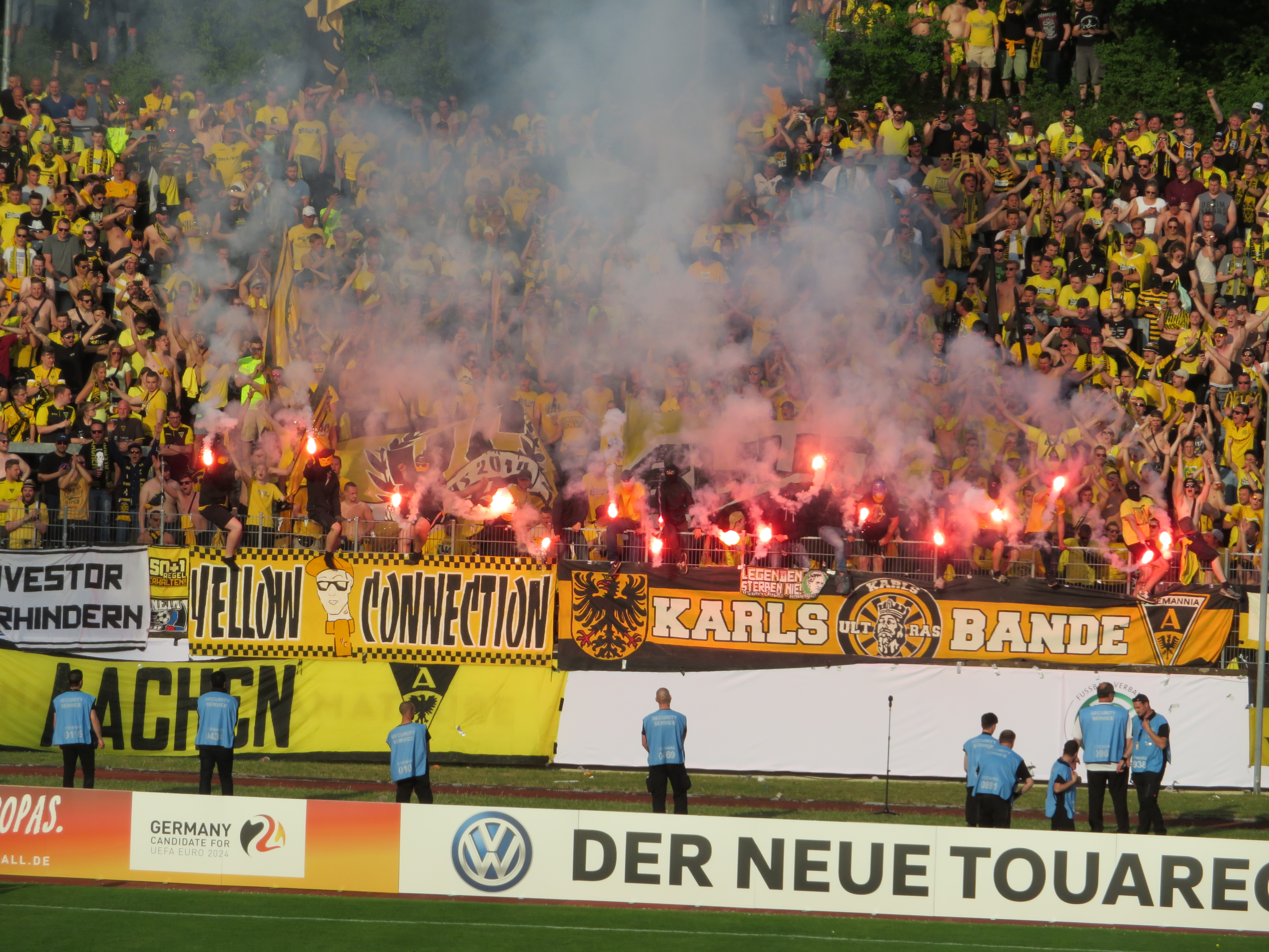 Im Zug war ich bei weitem nicht der einzige Fahrradtourist und so passten nur mit Mühe und Not alle Fahrräder in das Abteil. Direkt nachdem ich mich hinsetzte, überkam mich die Müdigkeit und ich war weg. Glücklicherweise stand mein Fahrrad auch in Bonn noch an Ort und Stelle und ich fuhr in Richtung Sportpark Nord. Auf dem Weg traf ich noch einen Kollegen, der sich samt besserer Hälfte spontan für einen Spielbesuch entschied. Der Klabauterkeaper und ich holten dann schon einmal Tickets und mussten dann lange auf das Eintreffen am Stadion warten. Dadurch ging die Aachener Pyroshow für mich flöten, was mir in der Seele weh tat. Zumindest bekamen wir aber noch einen guten Platz direkt vor der Staatsmacht.