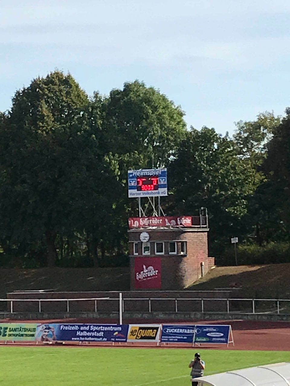 Wir kamen kurz vor dem Anpfiff an und so liefen auch schon die Mannschaften ein, als wir unsere Plätze eingenommen hatten. Die Rollen waren eigentlich klar verteilt. Budissa war durch einen passablen Ligastart der Favorit, während Halberstadt bisher erst einen Dreier eingefahren hatte. Auf dem Spielfeld jedoch verkehrte Welt: Halberstadt agierte unglaublich bissig und spielte mit Wucht nach vorne. Zur Halbzeit stand es völlig verdient 3:0 für die Heimmannschaft. Die zweite Halbzeit hätte man sich dann fast schenken können, denn viel passierte nicht mehr.