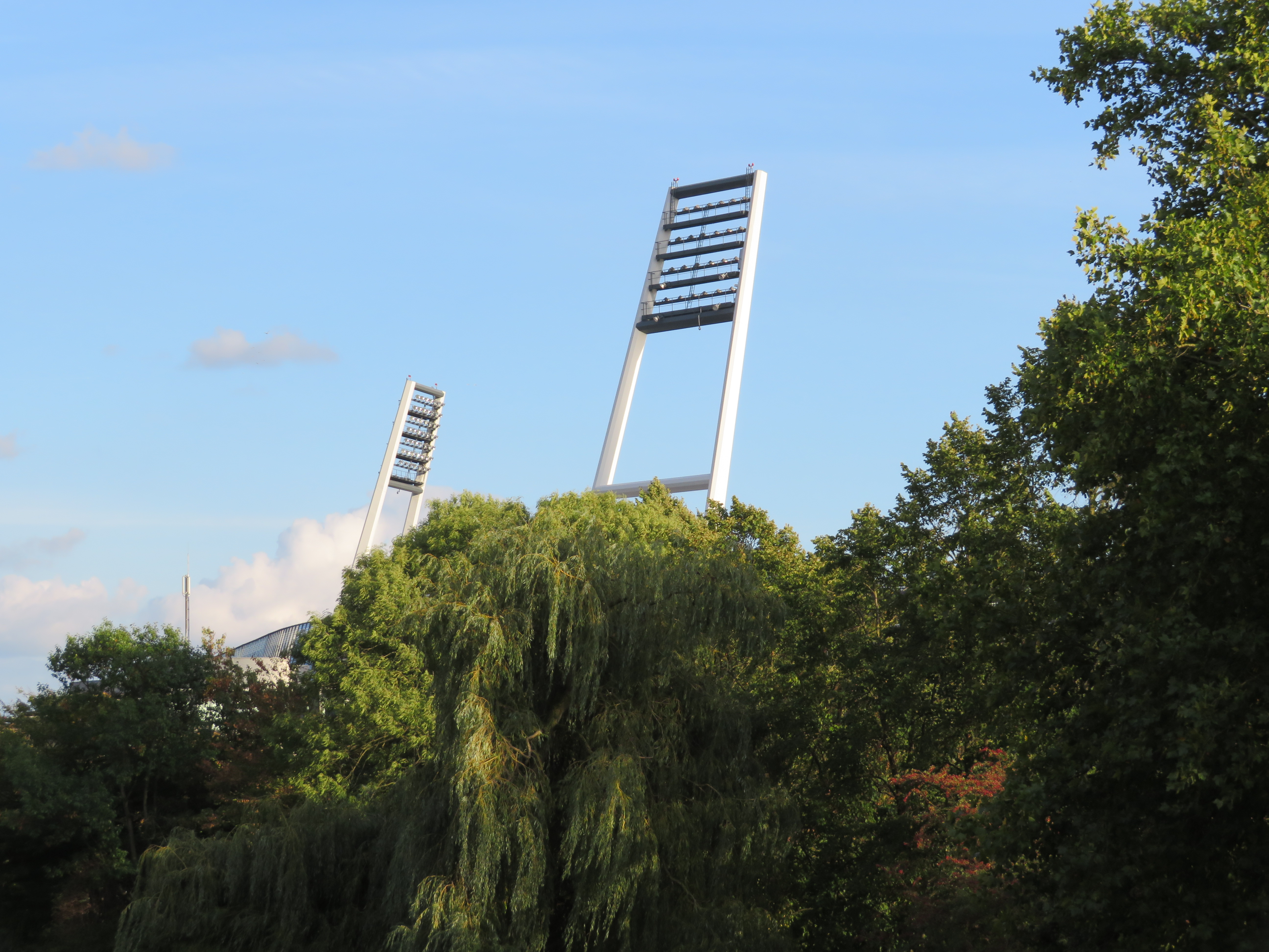 Endlich wieder Bundesliga. Diese Woche ließ einem den Schein des normalen Menschen kaum noch aufrechterhalten. Dienstag und Freitag ein Spiel, ist schon happig. Aber was tut man nicht alles? Die Terminierung auf einen Dienstag in Bremen war besonders bitter, da so das obligatorische Wochenende in der Hansestadt entfiel. Am Dienstagmorgen ging es mit dem Zug nach Bremen und ich nutzte den Zug als mein mobiles Büro. Schon nette Privilegien, die man da hat und ich fühle den Schmerz, aller richtigen Arbeiter, die einen solchen Luxus nicht haben. In Bremen genoss ich dann zumindest ein Mittagessen in guter Gesellschaft, bevor ich noch ein paar Stunden in die Tasten haute. Gegen 17.00 machte ich mich dann auf den Fußweg durch das Viertel zum Stadion. Dabei umspielten immer mal wieder Sonnenstrahlen mein Gesicht, sodass der Weg durchaus vergnüglich war.