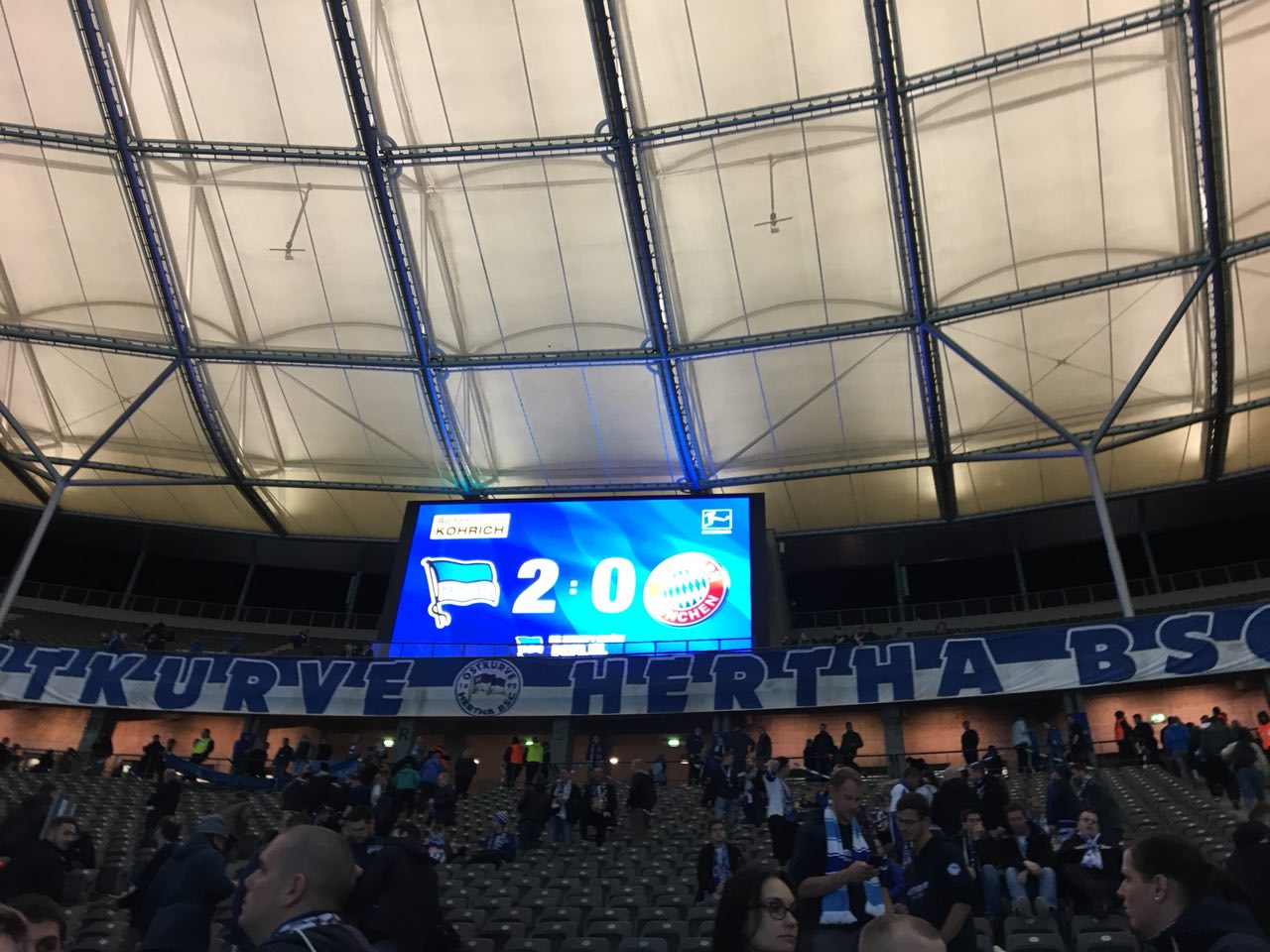 Auf dem Rasen war das schlicht und ergreifend Wahnsinn! Die Bayern wurden komplett auf dem falschen Fuß erwischt, denn Hertha stand hoch und presste die Bayern auf unglaublich gekonnte Art und Weise. Der Fuchs Kalou holte dann auf schlitzohrige Art und Weise einen Elfmeter raus, den Boateng uns wohl schenken wollte. Der alte Vedad verwandelte sicher und sprang wieder zu uns in die Kurve! Nach einer wunderbaren Kombination, schraubte Duda den Ball dann zu seinem unfassbaren fünften Saisontreffer in die Maschen! In der Folge, verteidigte Hertha leidenschaftlich und hatte an den nötigen Stellen auch das Glück des Tüchtigen! Gänzlich unverdient war der 2:0 Sieg aufgrund der mutigen Leistung aber nicht. Wahnsinn!