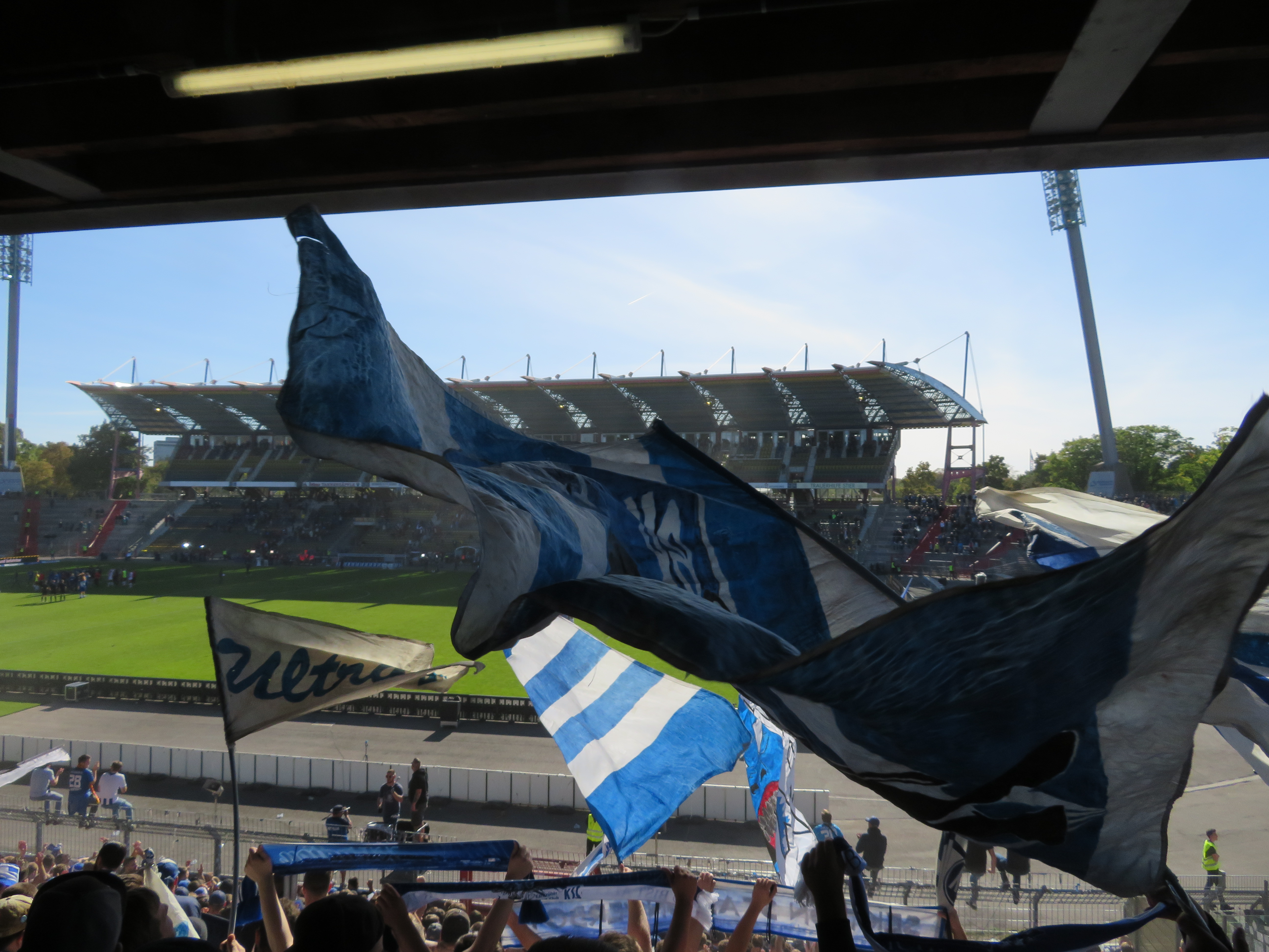 Für mich das erste Mal im Fanprojekt und ein wirklich schöner Laden! Wir liefen dann zu Fuß zum Stadion, wobei wir den unattraktiven Weg an der Schnellstraße, anstatt den idyllischen Waldweg wählten. Das kommt davon, wenn man auf die Jungschen hört. Wir warteten dann noch etwas vor dem Stadion und wurden dankenswerterweise von den Karlsruhern mit Karten versorgt. Und die Premieren gingen munter weiter, denn das erste Mal nahm ich oberen Stimmungsblock Platz. Dort wurde ich Zeuge von dem Konzept der Pfadabhängigkeiten. Anstatt auf dem Boden zu stehen, steht man in KA nämlich auf den Stühlen. Verbessert die Sicht nicht, verschlechtert den Stand und gibt vor allem ein furchtbares quietschendes Geräusch von sich. Abartig. Aber warum sollte man mit Traditionen brechen?