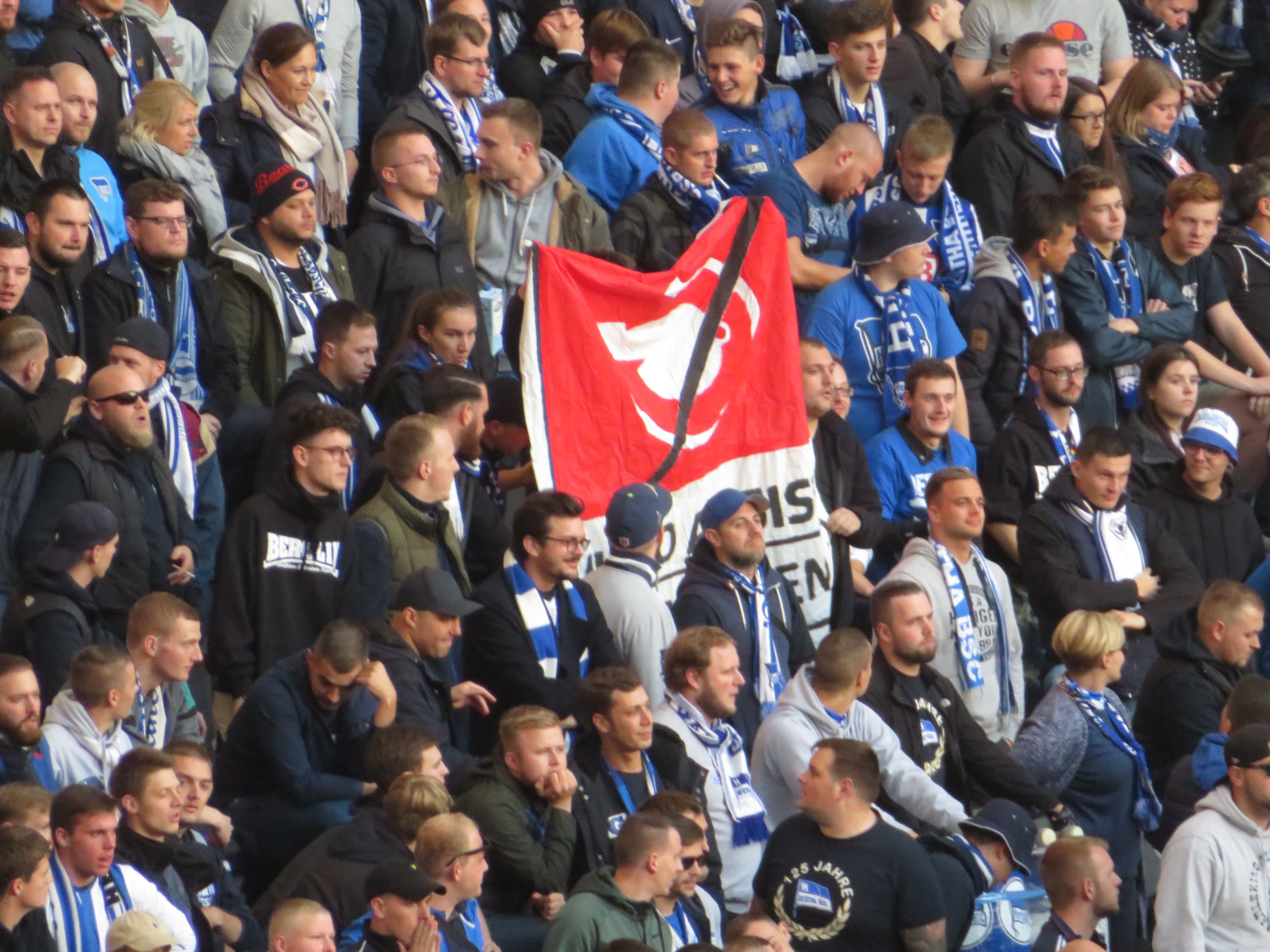 Strahlender Sonnenschein, machten diesen Sonntag zu einem goldenen Herbsttag. Zur Mittagszeit trafen wir uns mit „dem alten Rowdy“ in Charlottenburg und verbrachten einige Stunden zusammen. Dann fuhren wir gemeinsam zum Olympiastadion, wo sich die Wege trennten. Nach der Abholung der Auswärtskarten für die kommenden Partien, stieg ich in die Kurve hinab und verbrachte die letzte Stunde bis zum Anpfiff quatschend. Außerdem staunte ich ein wenig über die vielen Menschen. Freiburg brachte nicht wirklich viele Fans mit und dennoch über 53.000 Zuschauer? Die guten Leistungen der Mannschaft und die Erkenntnis der Marketingabteilung, dass wir in Berlin spielen, scheinen doch kleine Früchte zu tragen. Bliebt dabei!