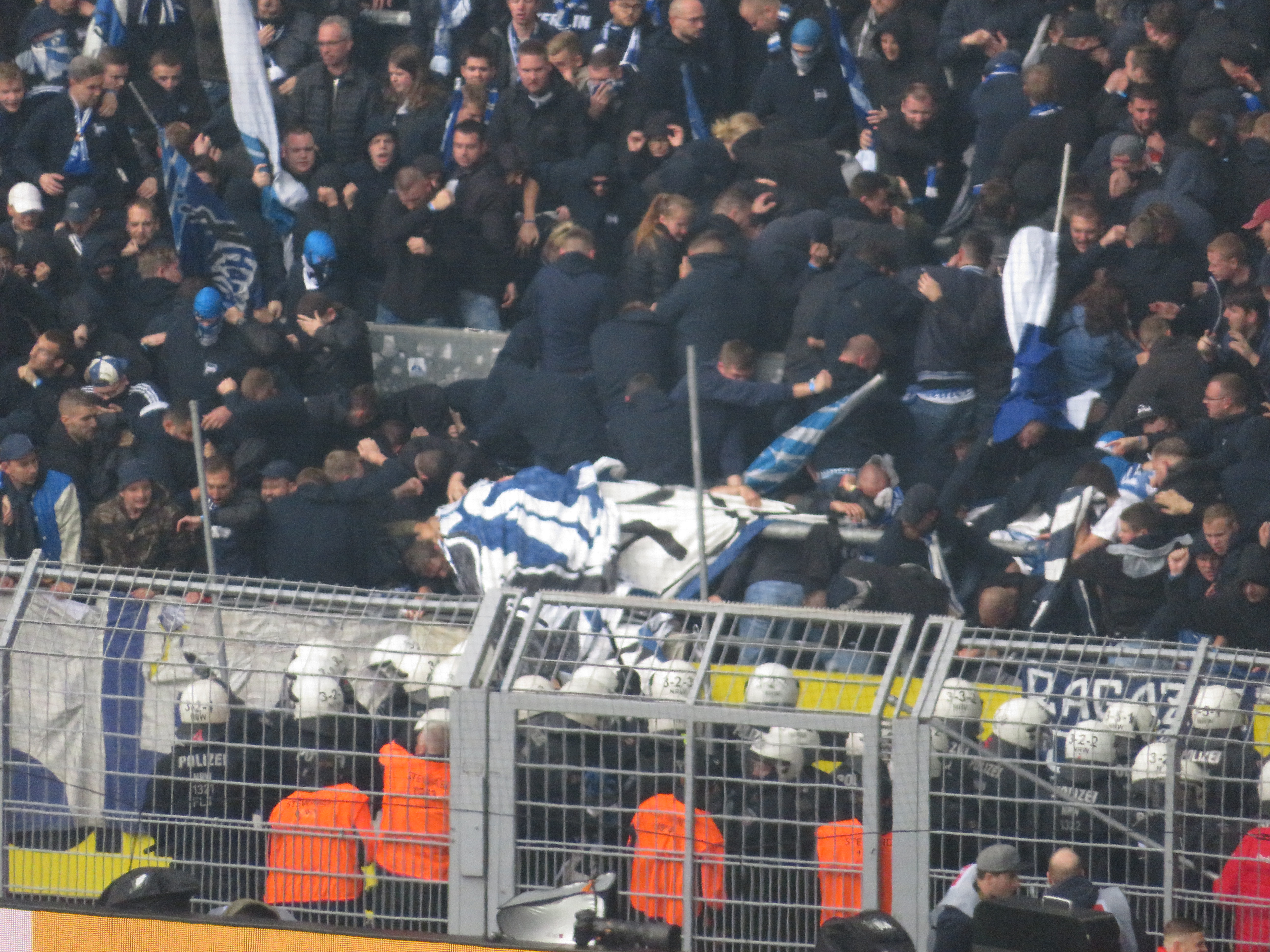 Es hätte ein wunderbarer Tag werden können. Ein Spiel zur klassischen Fußballzeit um 15.30 im Westfalenstadion in Dortmund. Beide Mannschaften waren super drauf und es war angerichtet ein Fußballfest zu werden. Ich betrat gegen 14.30 den Block und begrüßte einige bekannte Gesichter. Zum Einlaufen der Mannschaften gab es eine optische Aktion zu „15 Jahren Hauptstadtmafia“. An Fahnenstangen wurde ein großes Banner: „Ultras- 15 Jahre Hauptstadtmafia“ präsentiert. Das Bild wurde durch Fackeln, Strobos und Rauchtöpfe unterlegt. Zudem gab es Dutzende Blau-Weiße Herthafahnen, die geschwenkt wurden. Nach der Aktion wurde die Fahne in den Innenraum gelegt und die Stimmung stieg weiter. Die Mannschaft überstand die ersten Aktionen glimpflich und wurde nach vorne gepeitscht. Es gingen noch einmal zwei einzelne Fackeln an, als die Polizei mit circa 50-60 hochgerüsteten Beamten in den unteren Bereich zwischen Zaun und Block einlief.