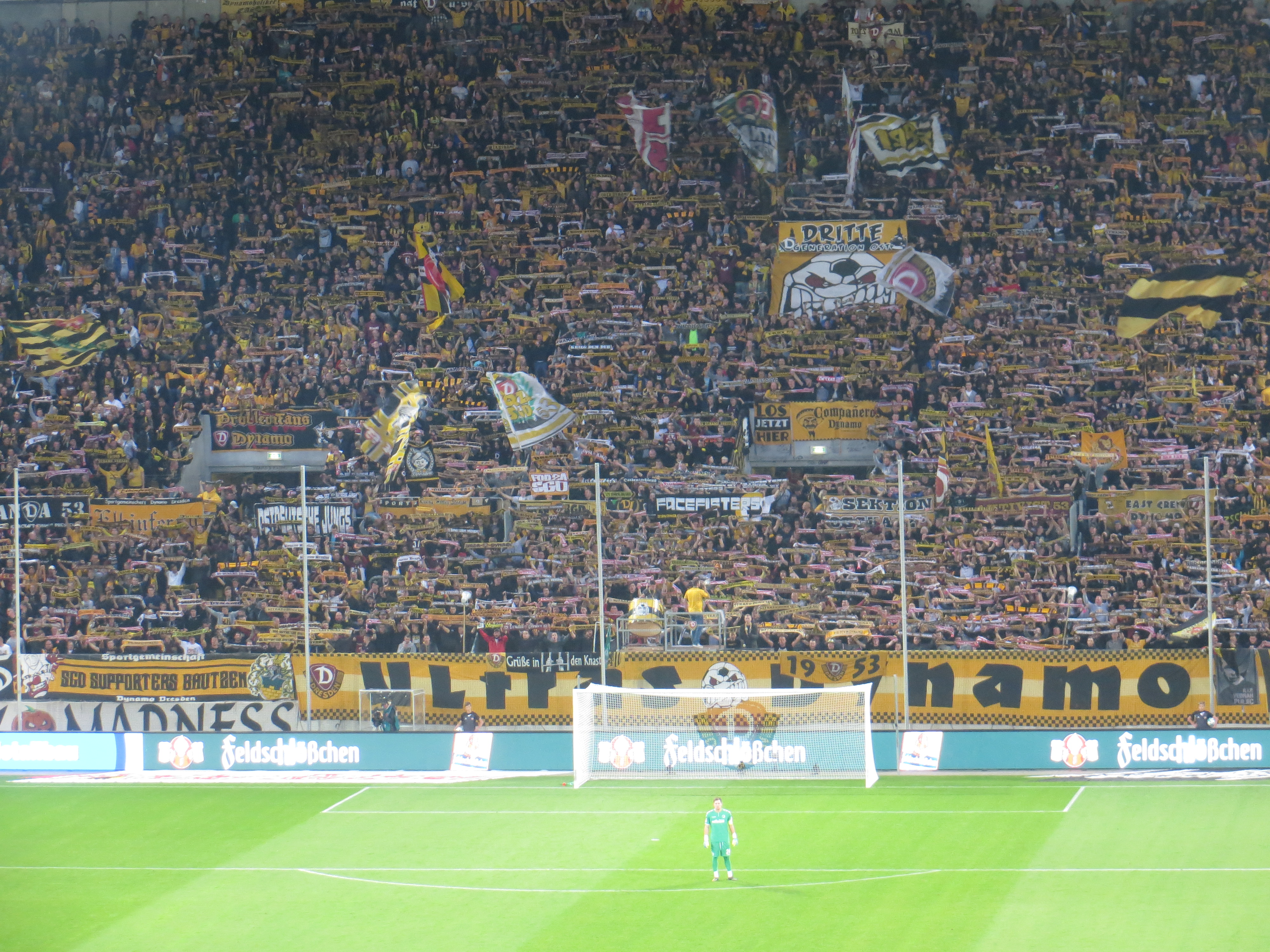 Zum Aktionsspieltag, der unter dem Motto stand: „Ihr kauft Euch die Welt, wie sie euch gefällt“ zeigten die Ultras Dynamo eine optische Aktion. Zu sehen gab es neben einem Mottospruchband ein durchgestrichenes DFB Logo, das von zahlreichen Geldscheinen umrandet wurde. Im Anschluss wurde das DFB Logo für 25 Minuten durch das gesamte Stadion getragen. Eine sackstarke Aktion, die in 90% der Stadien so nicht möglich gewesen wäre. Auch sonst zeigte sich Dynamo durchaus gut aufgelegt. Ein Schlachtruf, der auf eine Pfeifeinlage vom Vorsänger folgte und ein Lied auf die Melodie von „Hey Baby“, das drei Tribünen miteinbezog, waren definitiv Highlights. Gleichzeitig gab es jedoch auch Längen, die ich bei vorigen Besuchen noch nicht so beobachtet hatte. Aber klar, es ging auch nur gegen Sandhausen, sodass das immer noch ein guter Auftritt war. Sandhausen brachte übrigens 15 Fans mit. Schön, dass es Euch gibt!