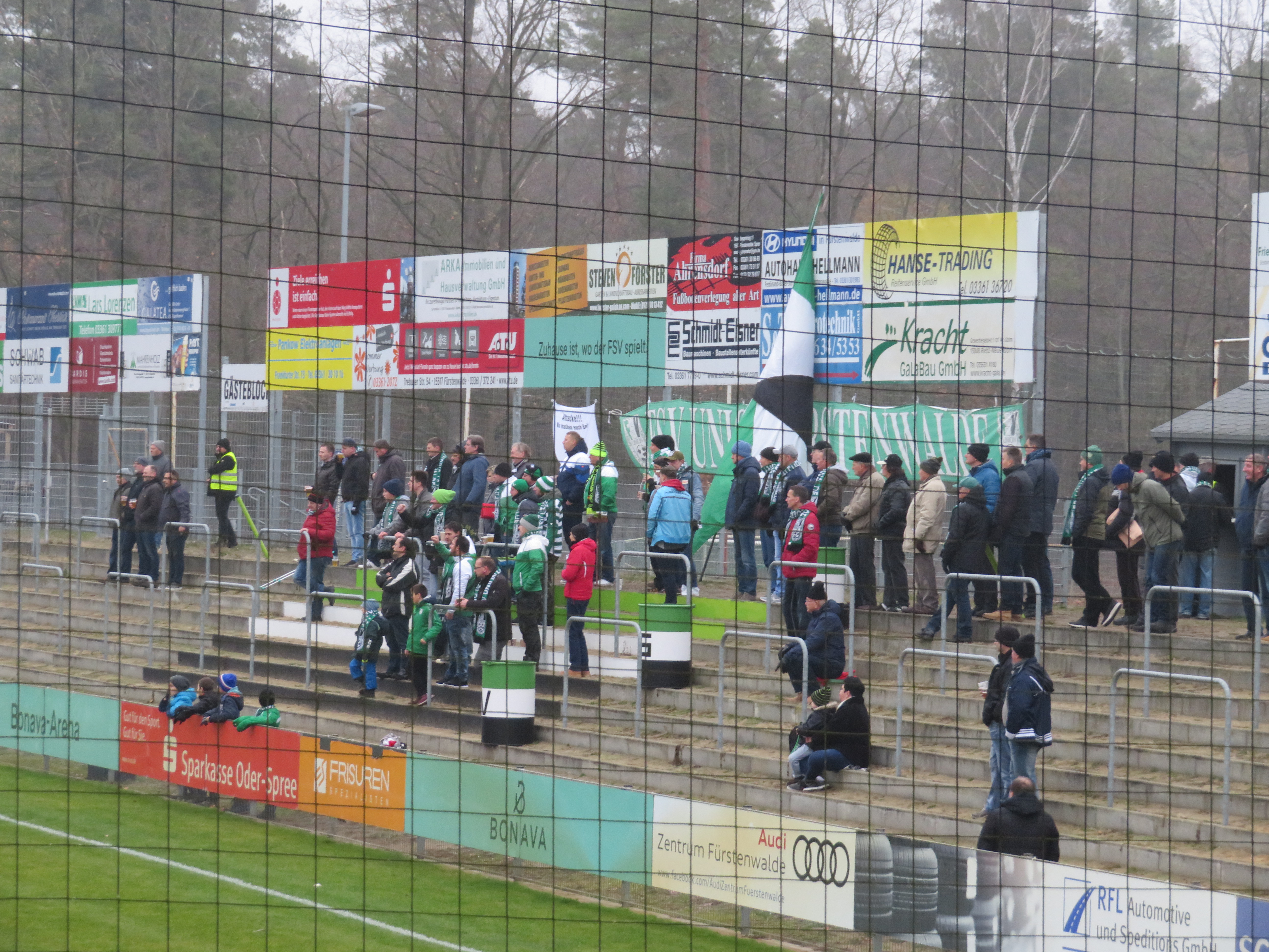 Wir verdaddelten dann ein bisschen die Zeit und den Weg und mussten uns etwas sputen. Der Weg führte weitestgehend durch einen Park zum Stadion. Für sechs Euro war man ermäßigt dabei und wir erreichten mit dem Anpfiff die Traversen. Das Stadion ist an allen Ecken ausgebaut. Der Großteil des Stadions besteht aus schönen Stehplätzen mit einigen Wellenbrechern, aber auch einen kleinen Sitzplatzbereich gibt es. Dazu gibt es zahlreiche Essens- und Getränkestände und bestes brandenburgisches Personal. Es fällt schwer, sich nicht in Fürstenwalde wohlzufühlen.