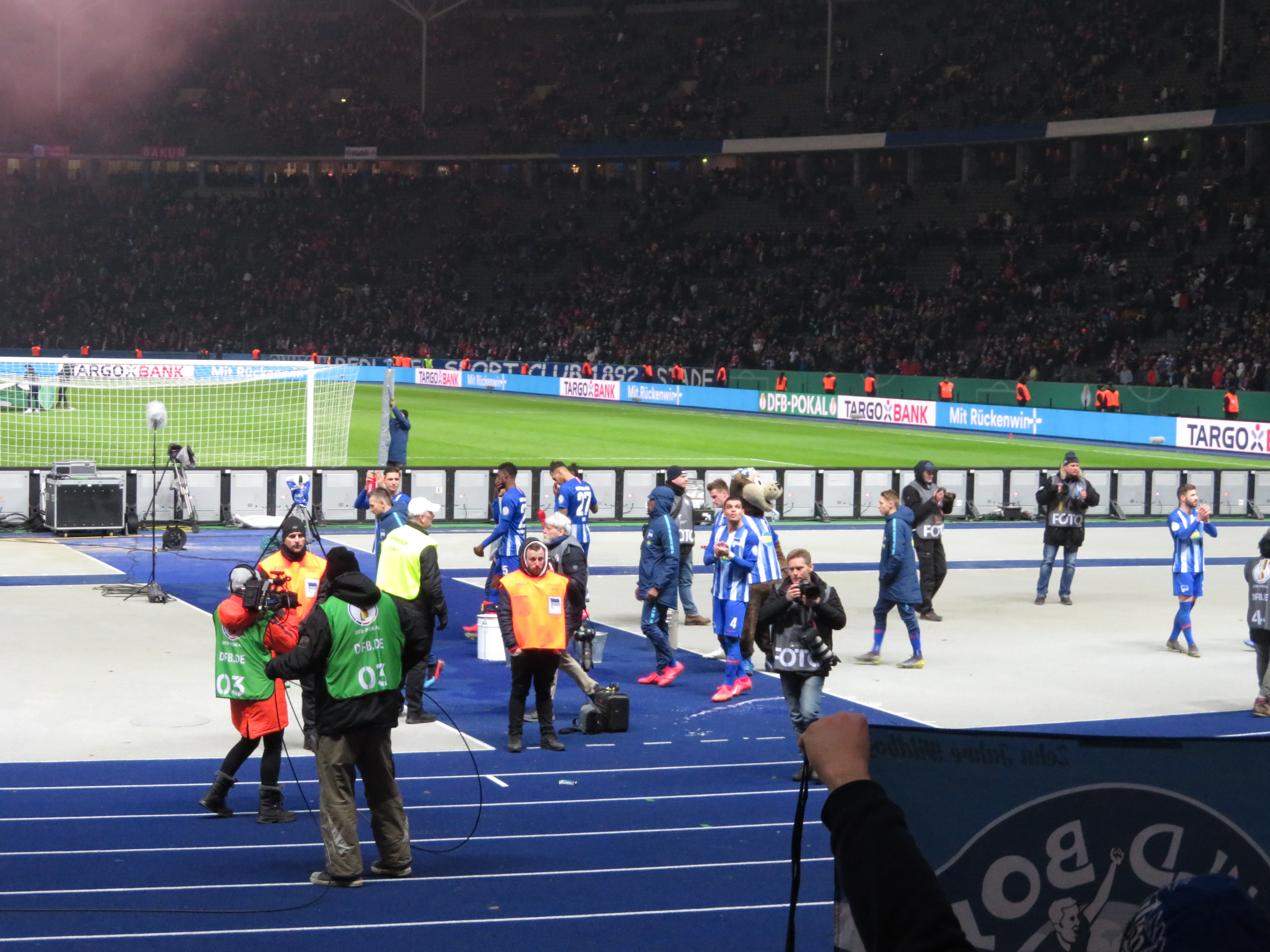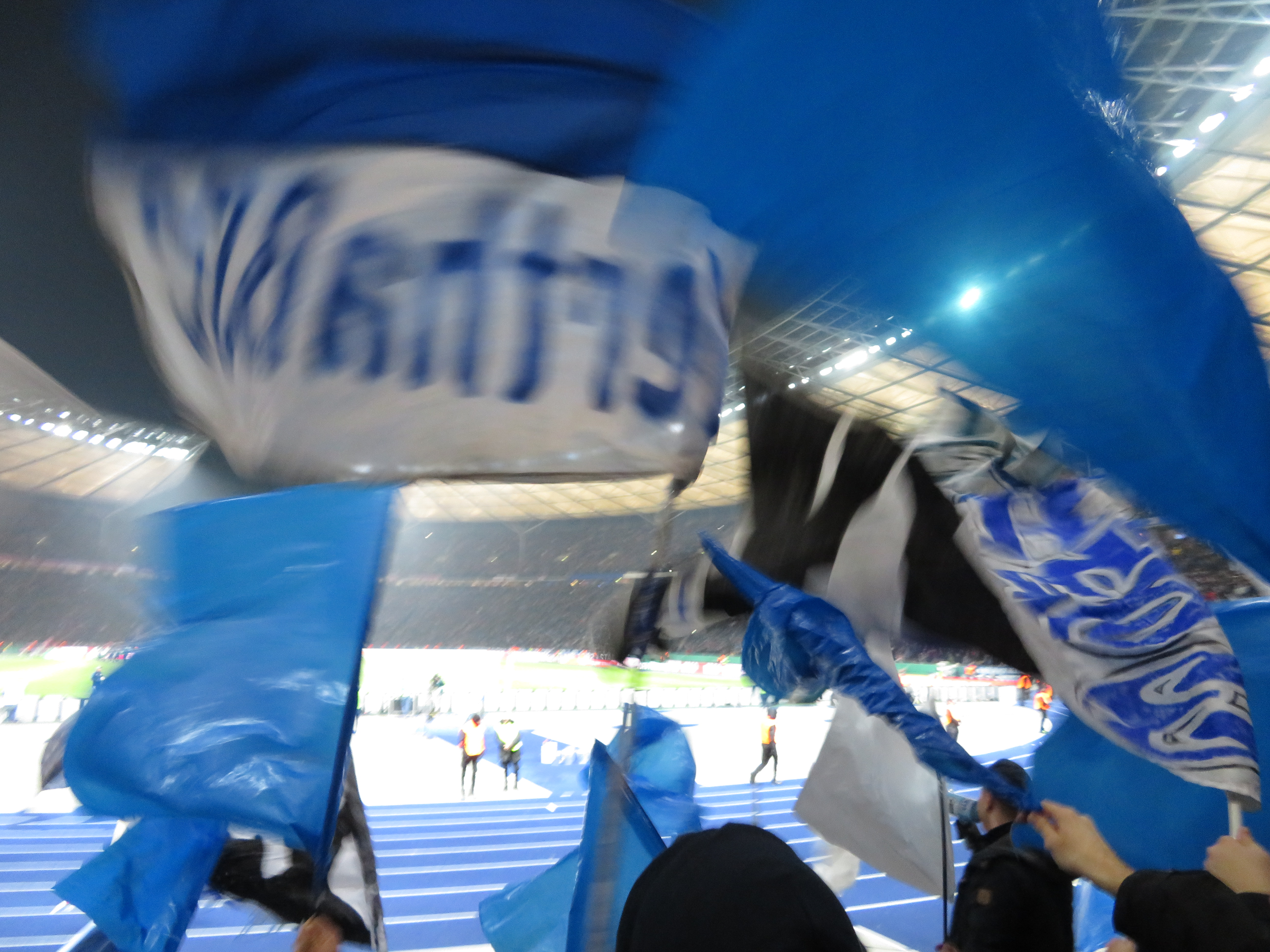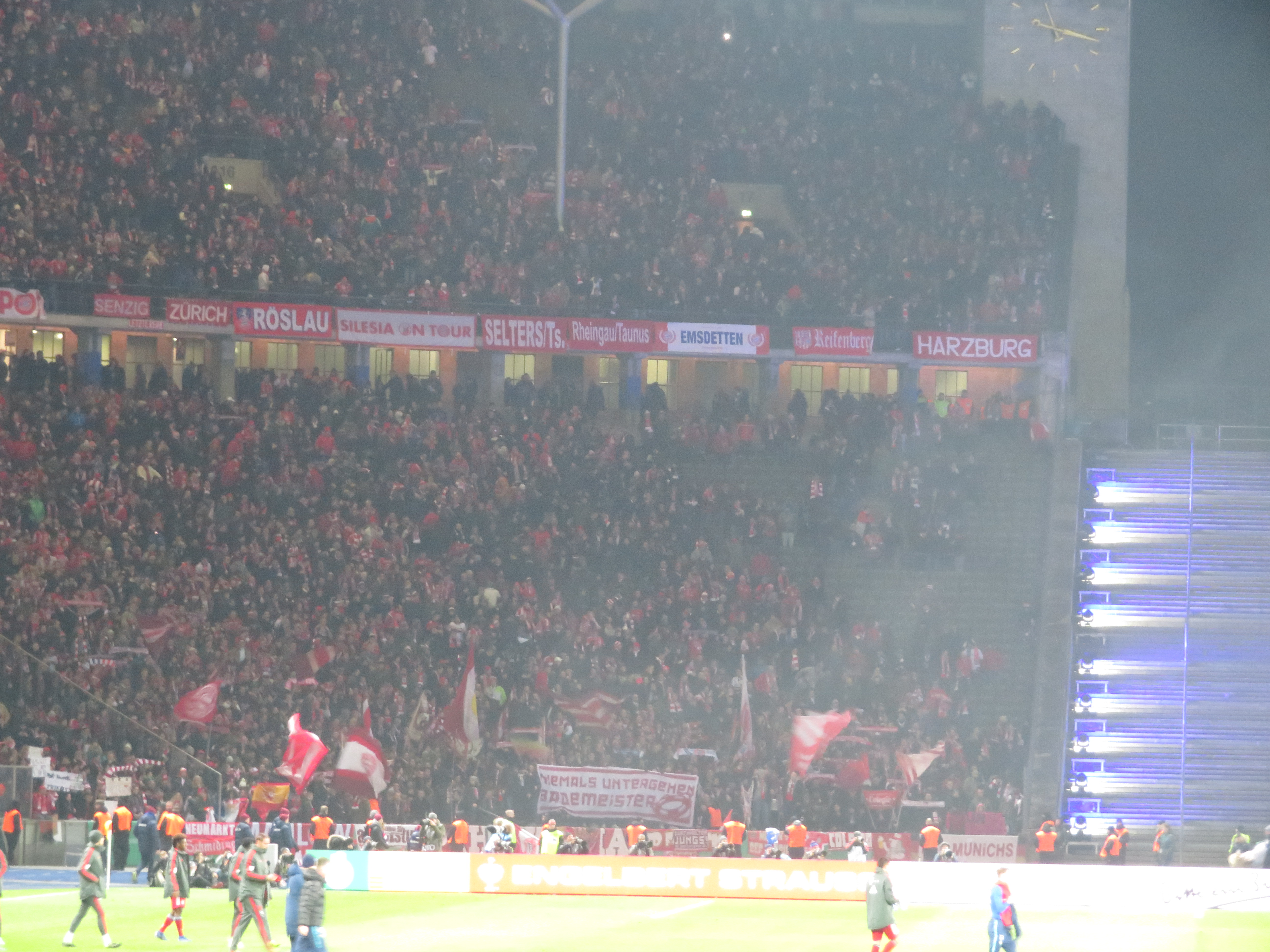 Gegen 18.00 nahm ich dann die S-Bahn zum Olympiastadion und traf einige bekannte Gesichter beim Parkplatztreff. Dann verbrachte ich noch einige Minuten damit meine überschüssige Karte loszuwerden. Ein echter Ehrenmann ließ uns erst 20 Minuten auf seinen Kumpel warten, nur um dann die Transaktion doch ohne ihn abzuschließen. Man, man, man. Dann ging es unmittelbar rein und wir verquatschten die Zeit noch im Stadionumlauf. Auffällig viel Optimismus war heute in den Gesprächen herauszuhören. Mir ging das irgendwie anders und ich glaubte nicht im Ansatz an eine Chance. Zu frisch war noch die enttäuschende Halbfinalniederlage gegen Dortmund 2016.