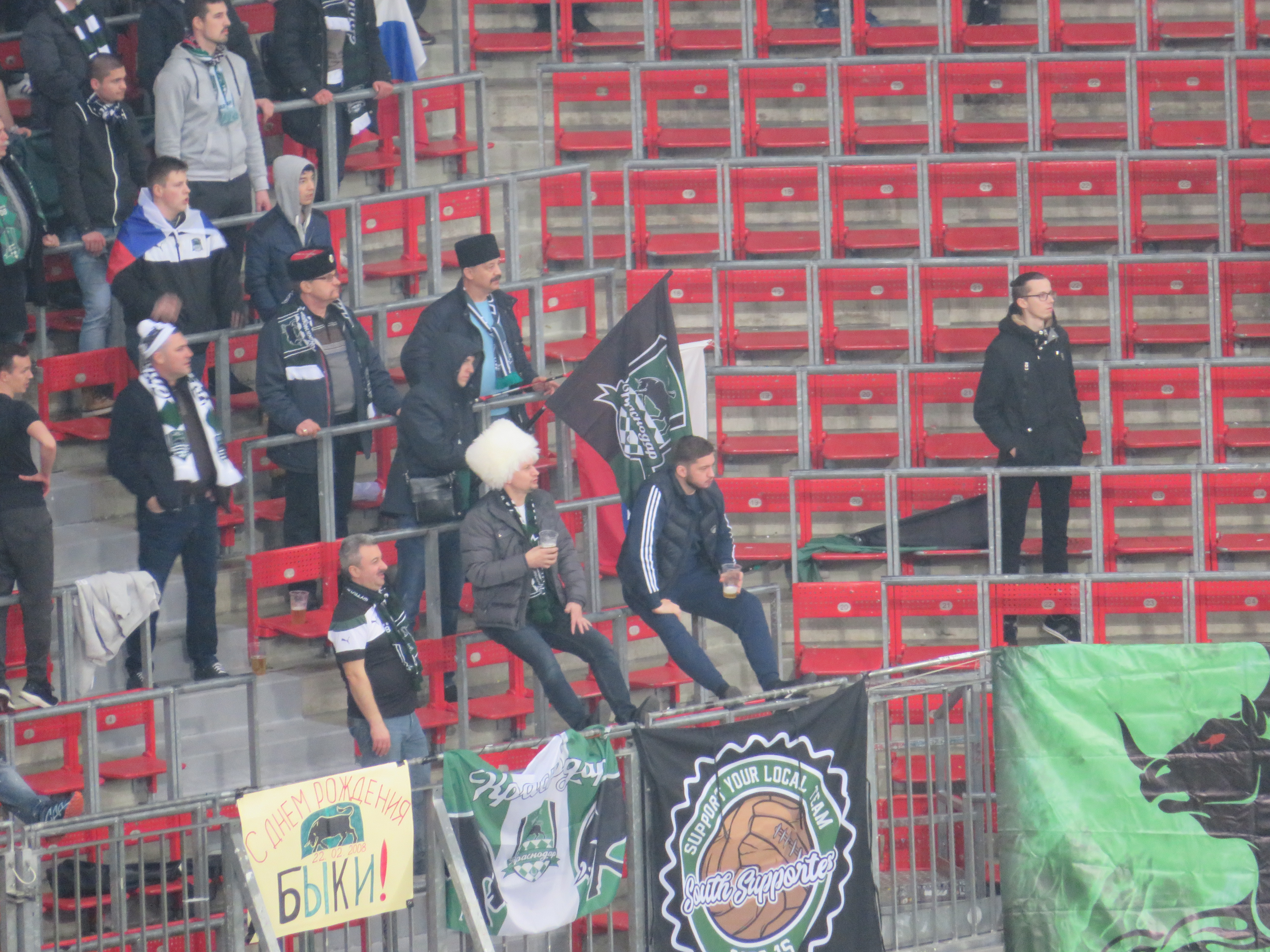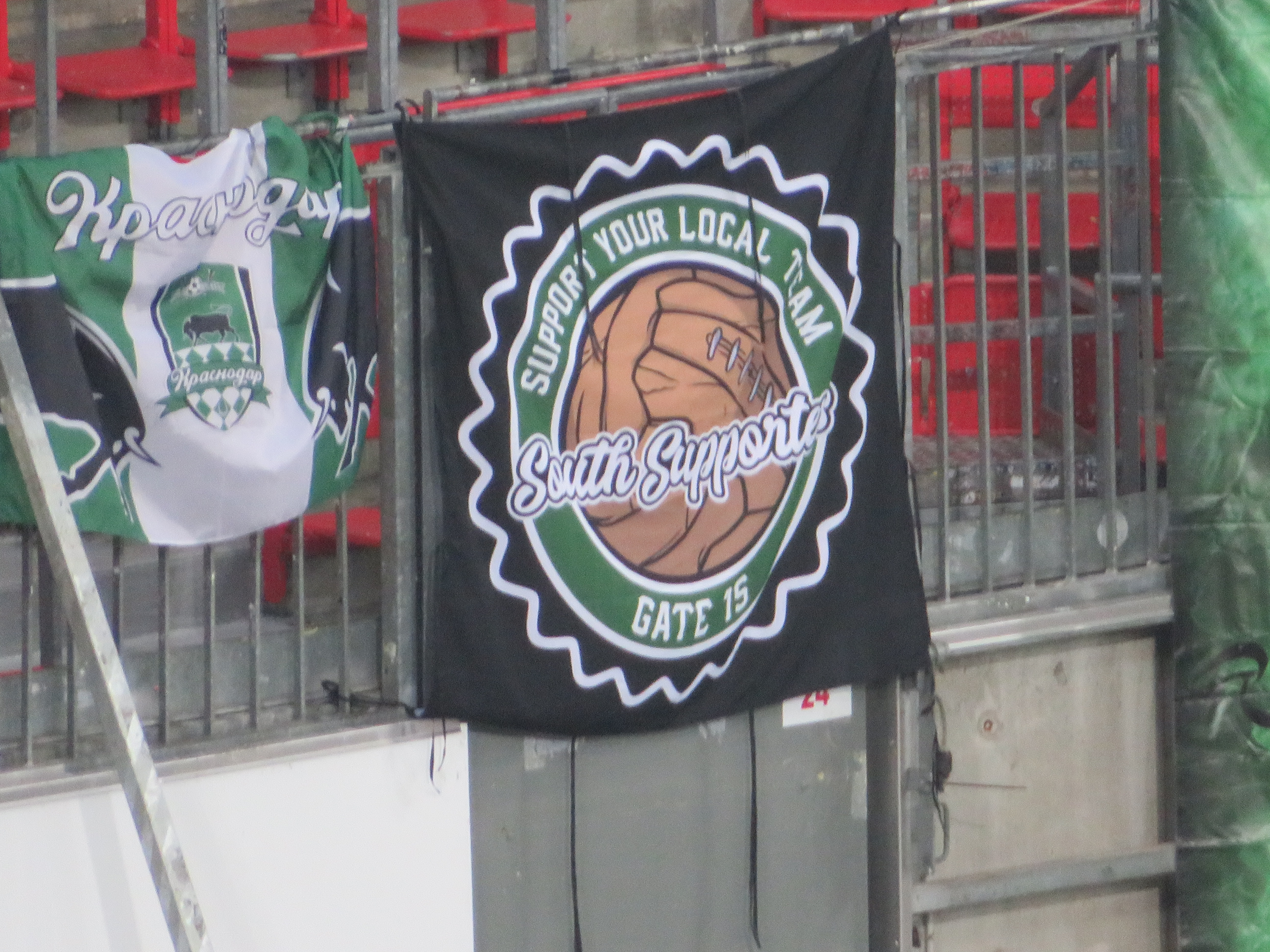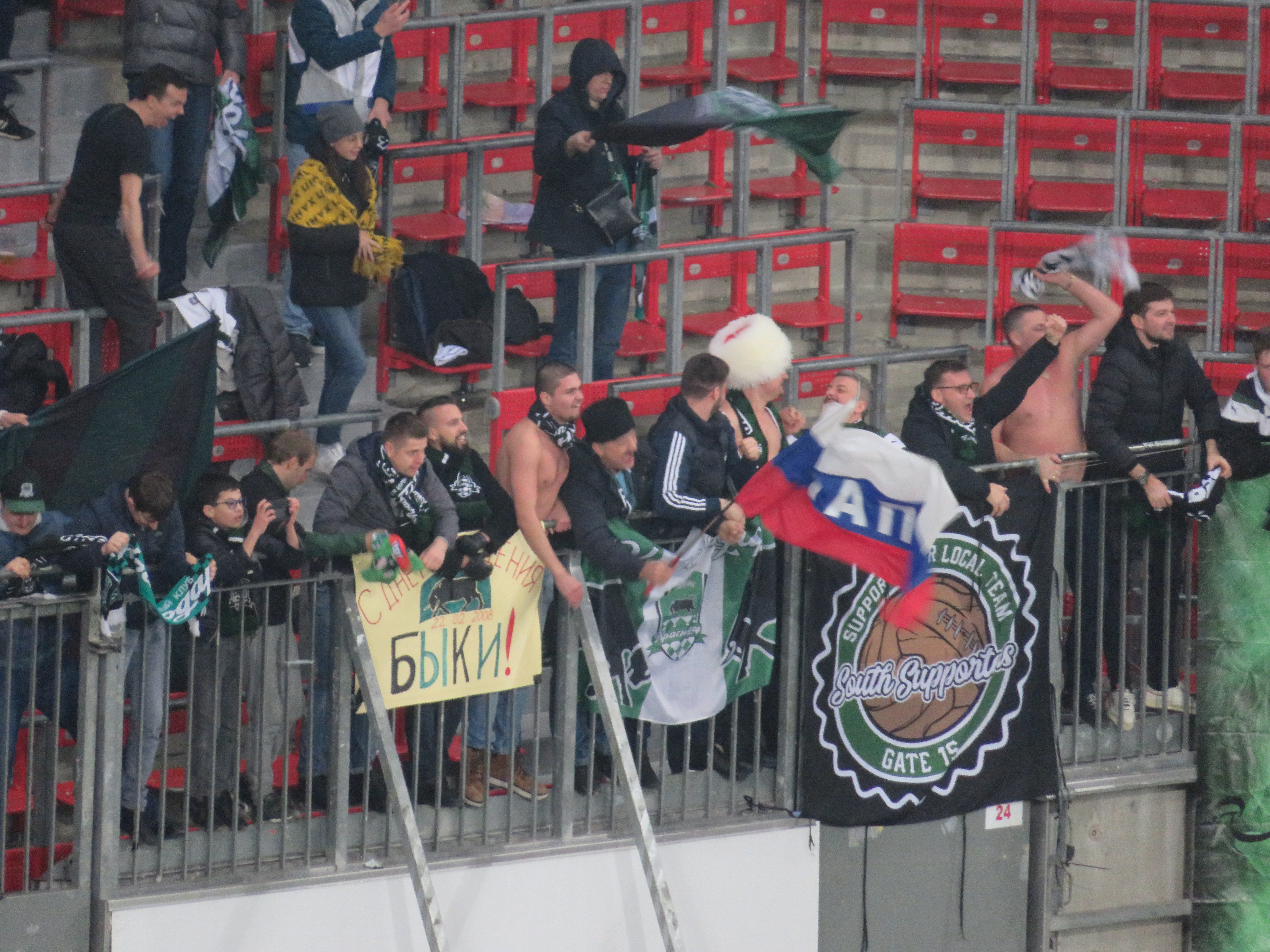 Im Block von Krasnodar fanden sich circa 200 Leute ein, wobei nur ein geringer Teil wirklich aus Krasnodar gekommen sein wird. Das schien eher ein buntes Sammelsurium von Exilrussen und Trittbrettfahrern der billigen Kartenpreise im Gästeblock. Einige lustige Gestalten waren aber dennoch dabei. Freier Oberkörper und Fellmütze passen einfach außerordentlich gut zusammen. Einige Lieder wurden auch gesungen, jedoch aufgrund der geringen Anzahl an Leuten eher gedämpft.