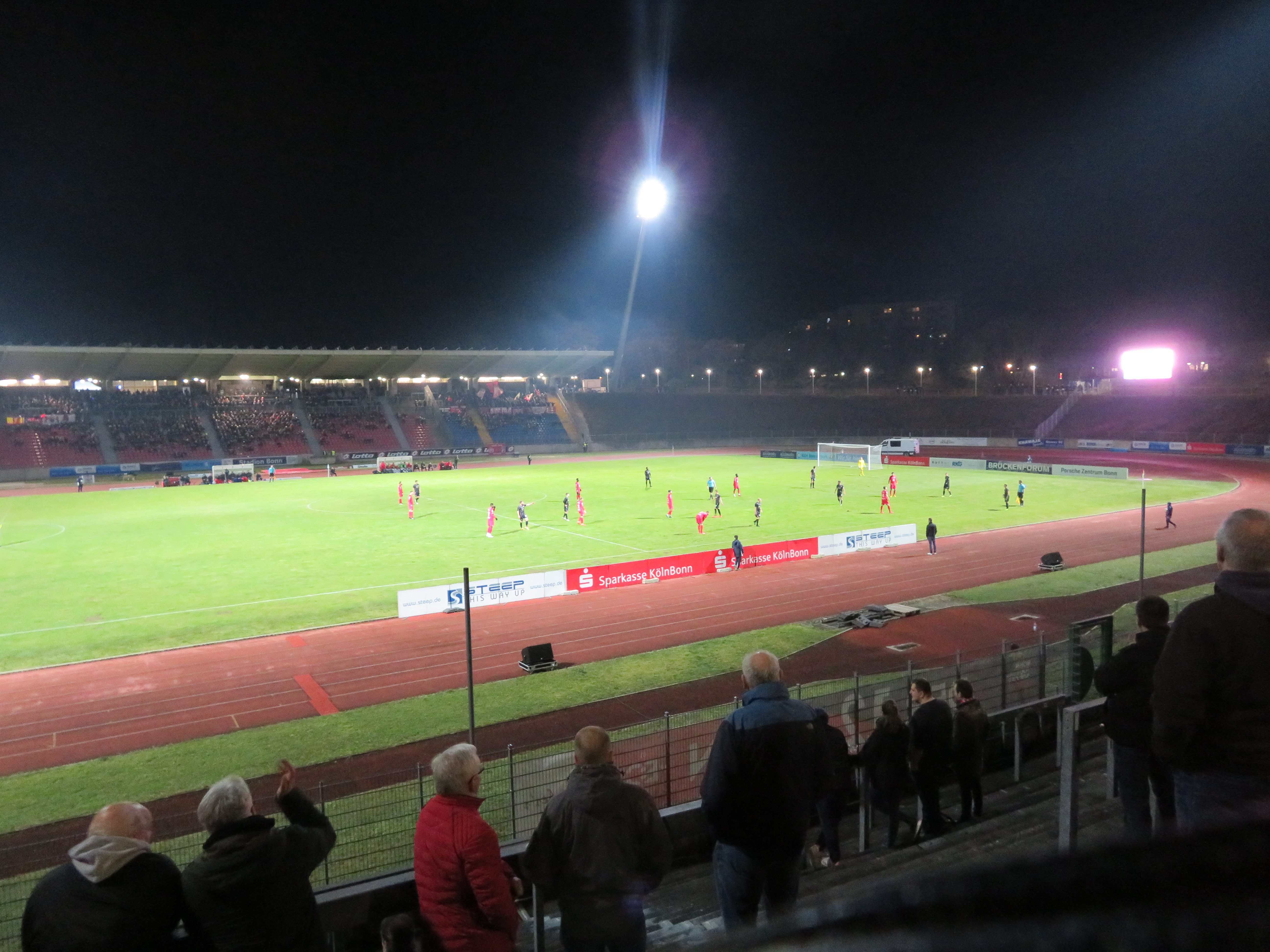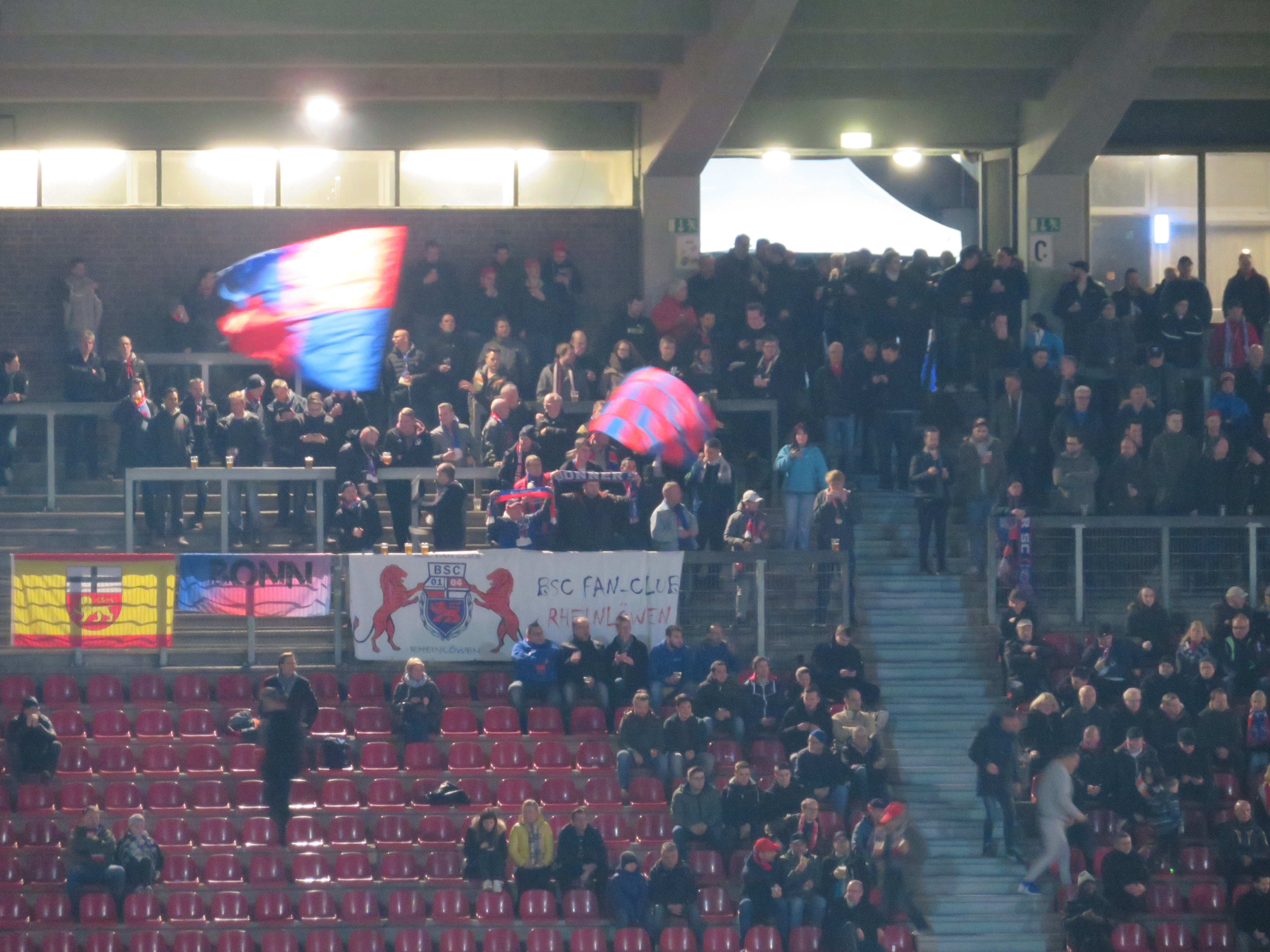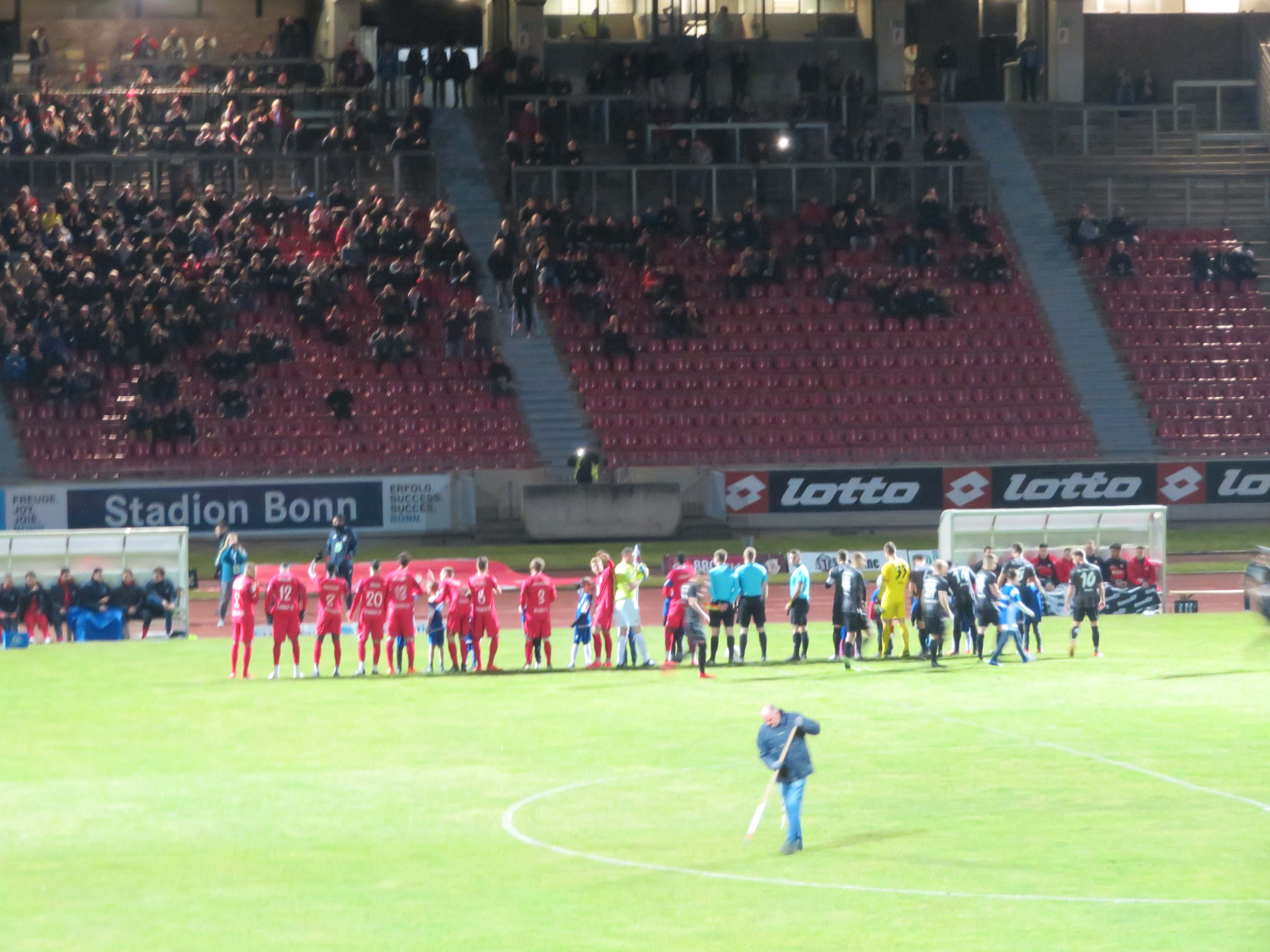 Die Bonner Fans sind irgendwie merkwürdig. Es gab auf der Haupttribüne einen kleinen Kern von fast 20 Leuten, die fast durchgängig sangen. Dazu gab es noch einige Lauchs auf der Gegentribüne, die in unregelmäßigen Abständen herumschrien. Studenten.