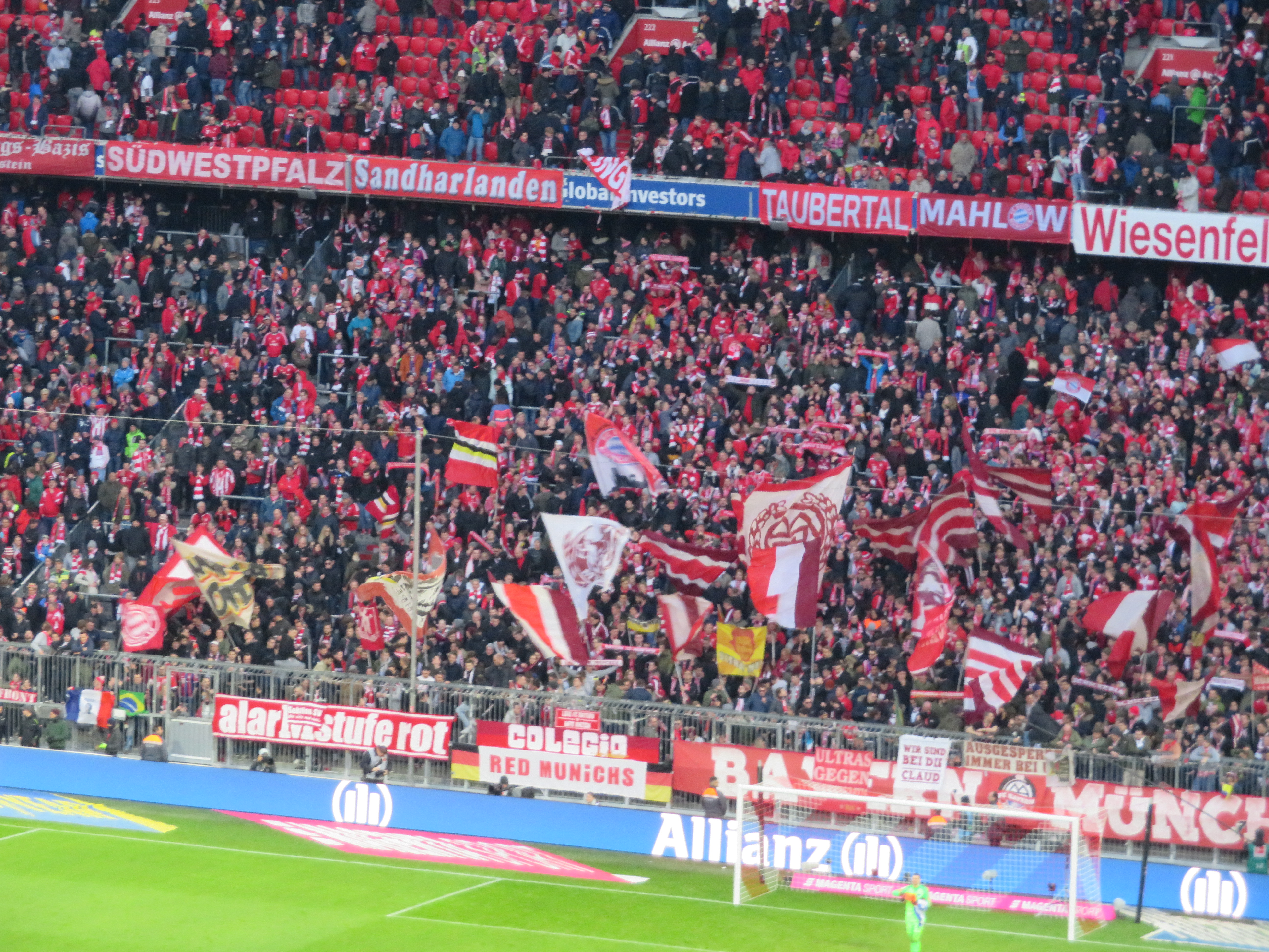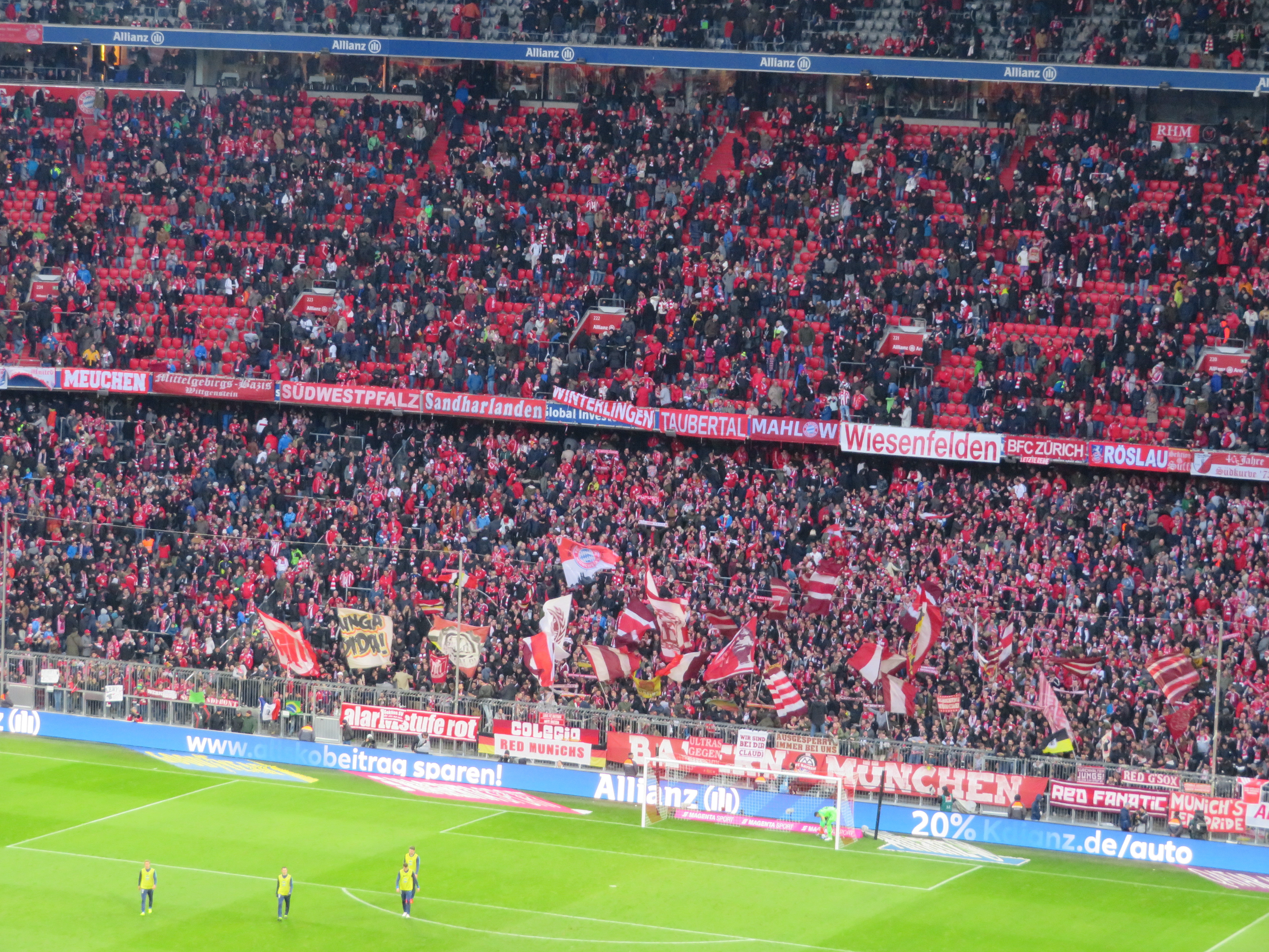 Dieser war auch durch den Sonderzug voller als in den Vorjahren. Ich suchte mir einen Platz auf der Treppe und ließ den Blick durch das Stadion schweifen. Wir legten dann auch direkt los und machten uns das erste Mal in der Arena bemerkbar. München auswärts gehört traditionell nicht zu unseren Sternstunden. Der Block ist einfach merkwürdig, die Lage im Oberrang suboptimal und der große Anteil an Arena-Touristen nicht unbedingt förderlich. Wenn man all diese Faktoren zusammennimmt, war es ein ordentlicher Auftritt. Etwas lockerer als sonst, aber ohne große Ausreißer nach oben.