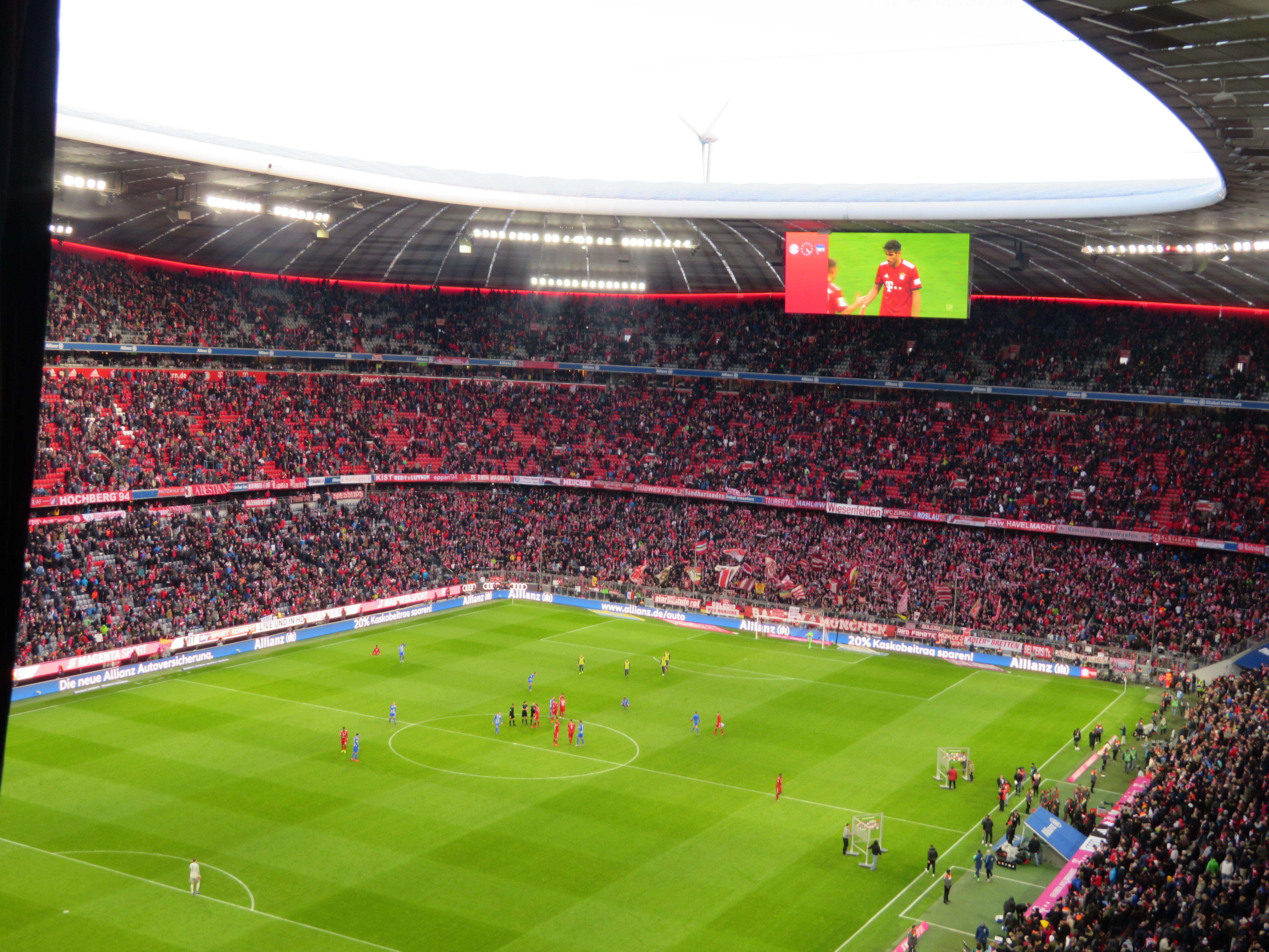 In München erwarteten mich dann Temperaturen um den Gefrierpunkt, aber strahlender Sonnenschein. So flanierte ich durch die Innenstadt und fand einen schönen Sonnenplatz im Außenbereich einer Kneipe, die mir ein super leckeres Cordon Bleu servierte. Dementsprechend gestärkt ging es zum Marienplatz, wo Menschenmassen auf eine U-Bahn zum Stadion warteten. Da bauen die ein Ufo mitten ins Nirgendwo und dann ist die Anbindung so bescheiden. Die Fahrt dauerte gefühlte Ewigkeiten, aber ich kam relativ schnell durch die Kontrollen, sodass ich gegen 15.05 den Block betreten konnte.