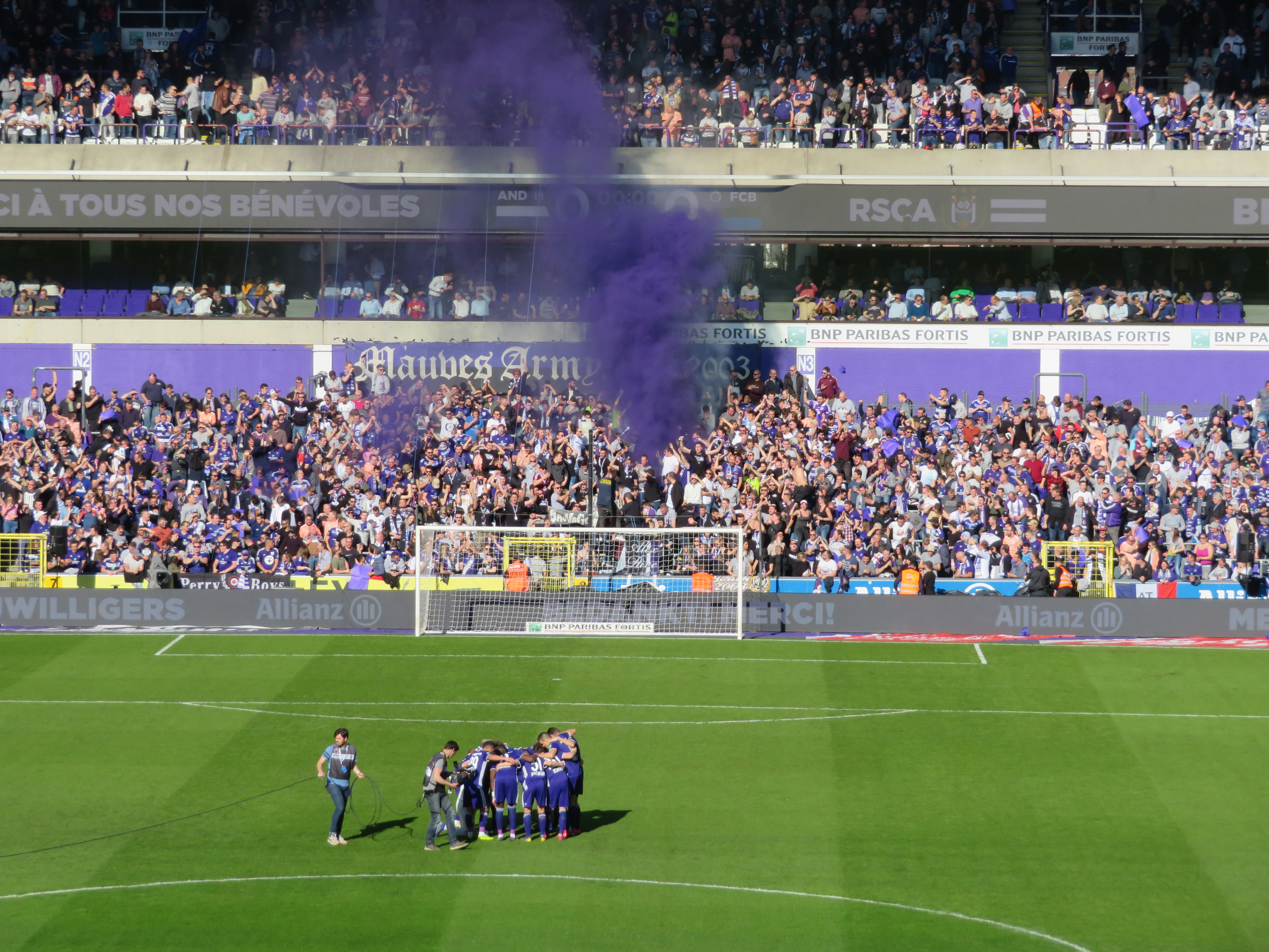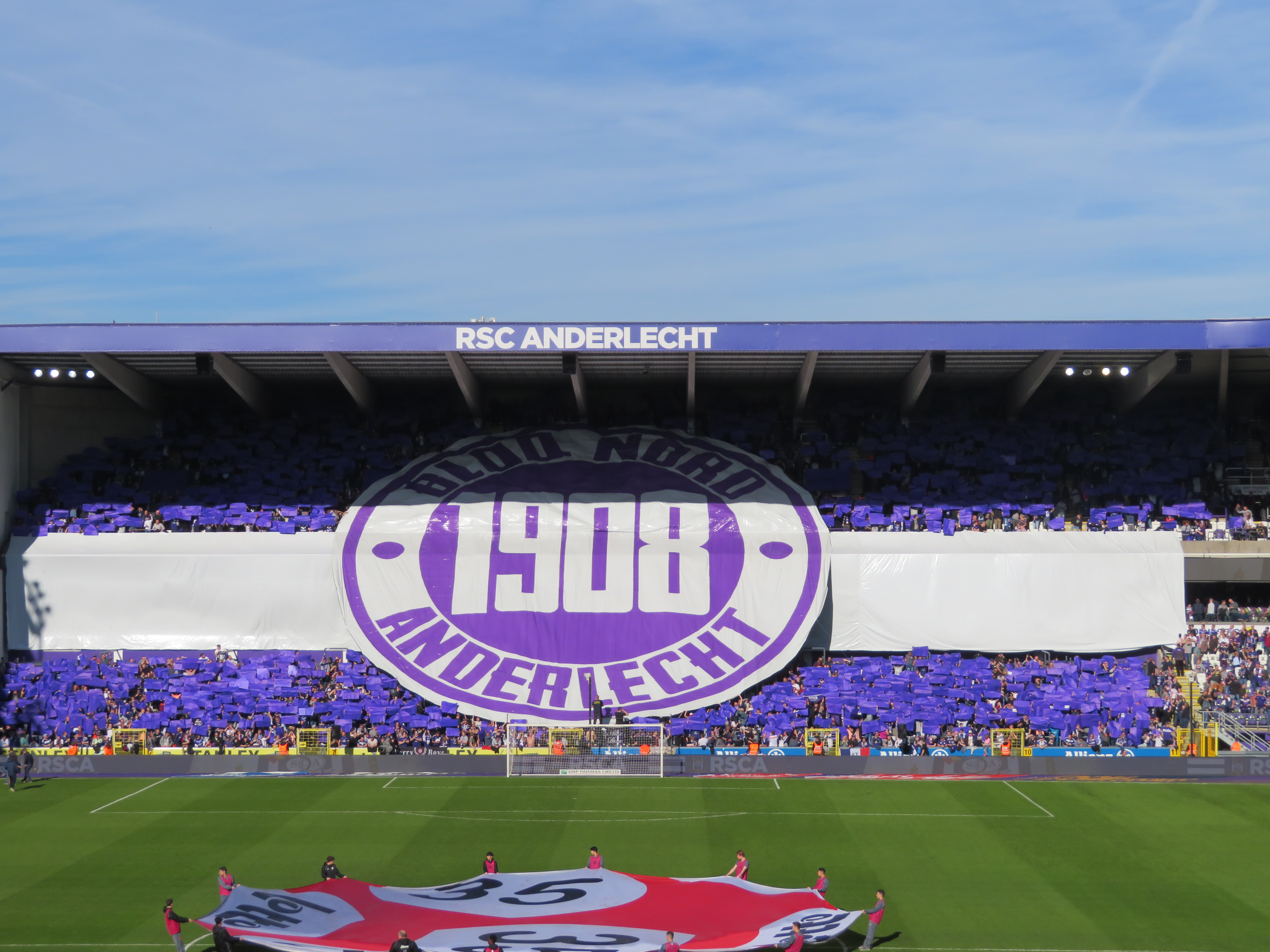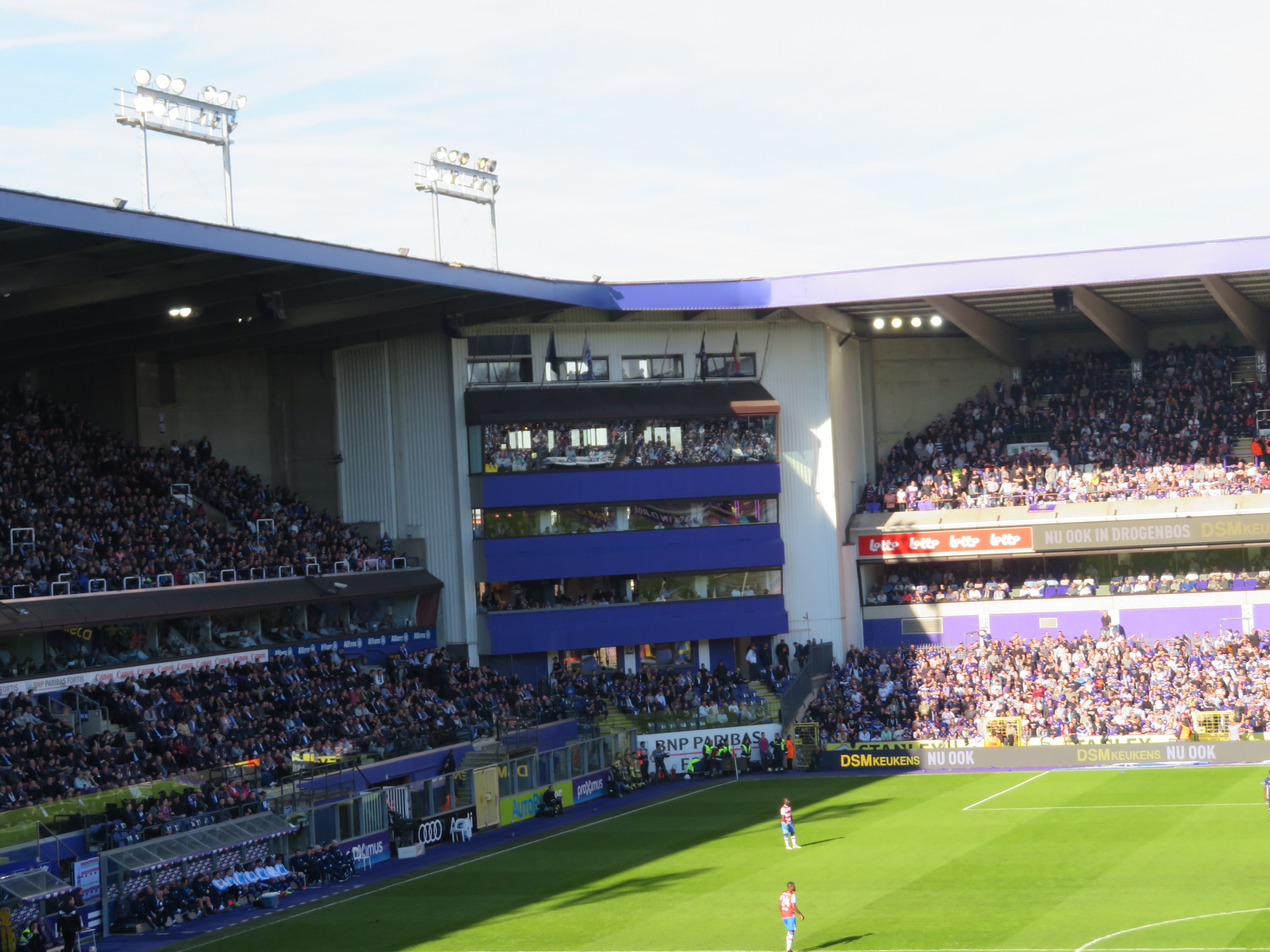 Mein letzter Brüssel Besuch war nun auch schon fast zehn Jahre her und so war ich sehr froh mal wieder ein paar Stunden in der Stadt zu verbringen. Die unterschiedlichen Stadtviertel, die vielfältigen Essensmöglichkeiten und die herausgeputzte Innenstadt bieten eine Melange, die man in europäischen Städten nur selten zu Gesicht bekommt. Nach einer kleinen Runde, aßen wir noch ein vorzügliches Panini und nahmen dann die Metro bis in die Nähe des Stadions. Dort erwartete uns die erste positive Überraschung, denn das Stadion war wunderbar in einem Wohnviertel gelegen. So ging es durch schmucke belgische Straßen, vorbei an zahlreichen Kneipen, bis man plötzlich auf dem Stadionvorplatz stand. Herrlich! Wir brauchten drei Anläufe, um unsere reservierten Tickets abzuholen, waren aber schlussendlich erfolgreich und nahmen unsere Plätze in der ersten Reihe des Oberrings ein. Über den Ticketpreis von 35 Euro darf man nicht zu lange nachdenken. Auch aus Supportsicht waren die Plätze nicht optimal, denn man konnte weder den Gästeblock, noch den Unterrang der Anderlecht Supporter auf der Südtribüne sehen.