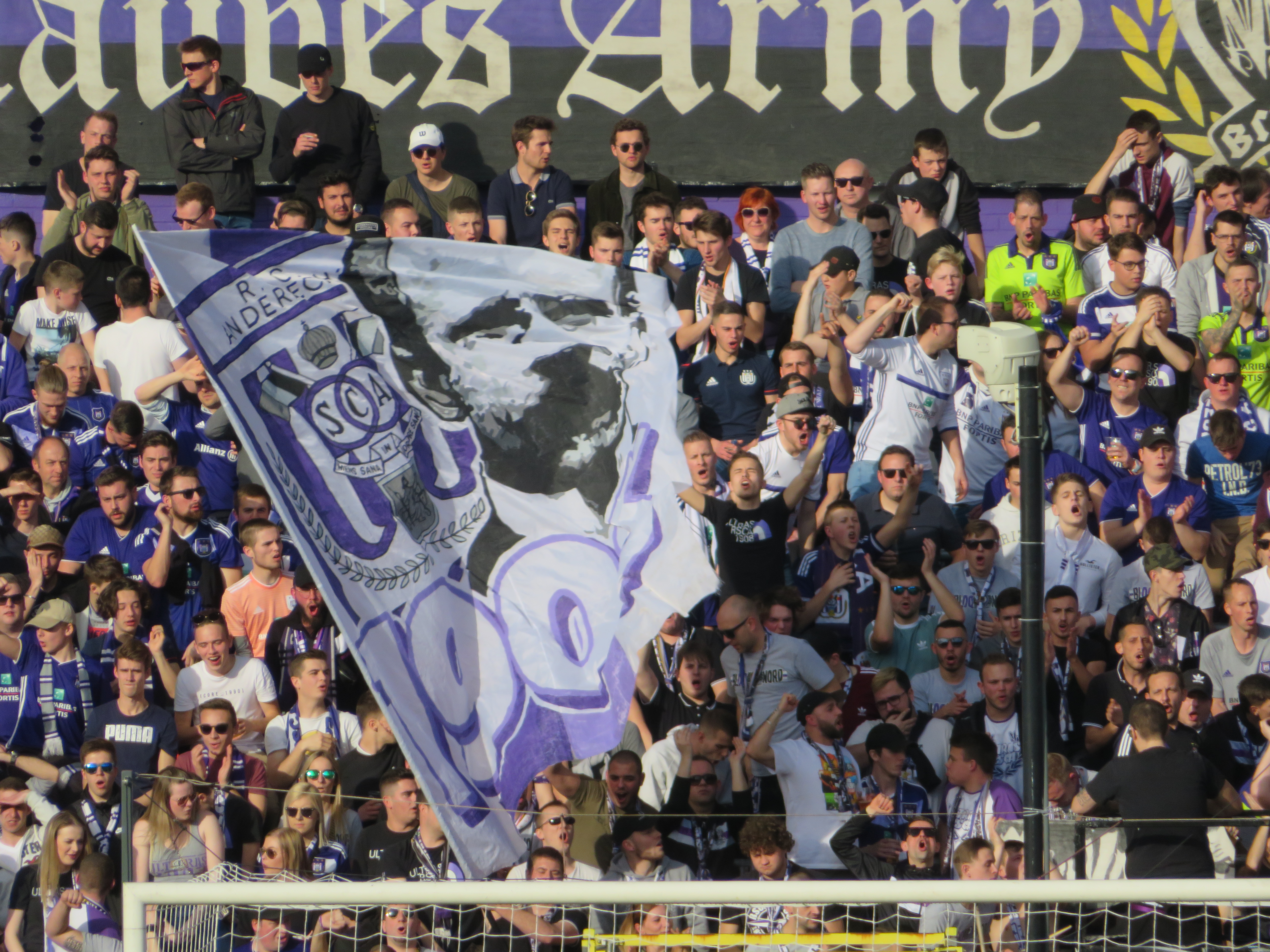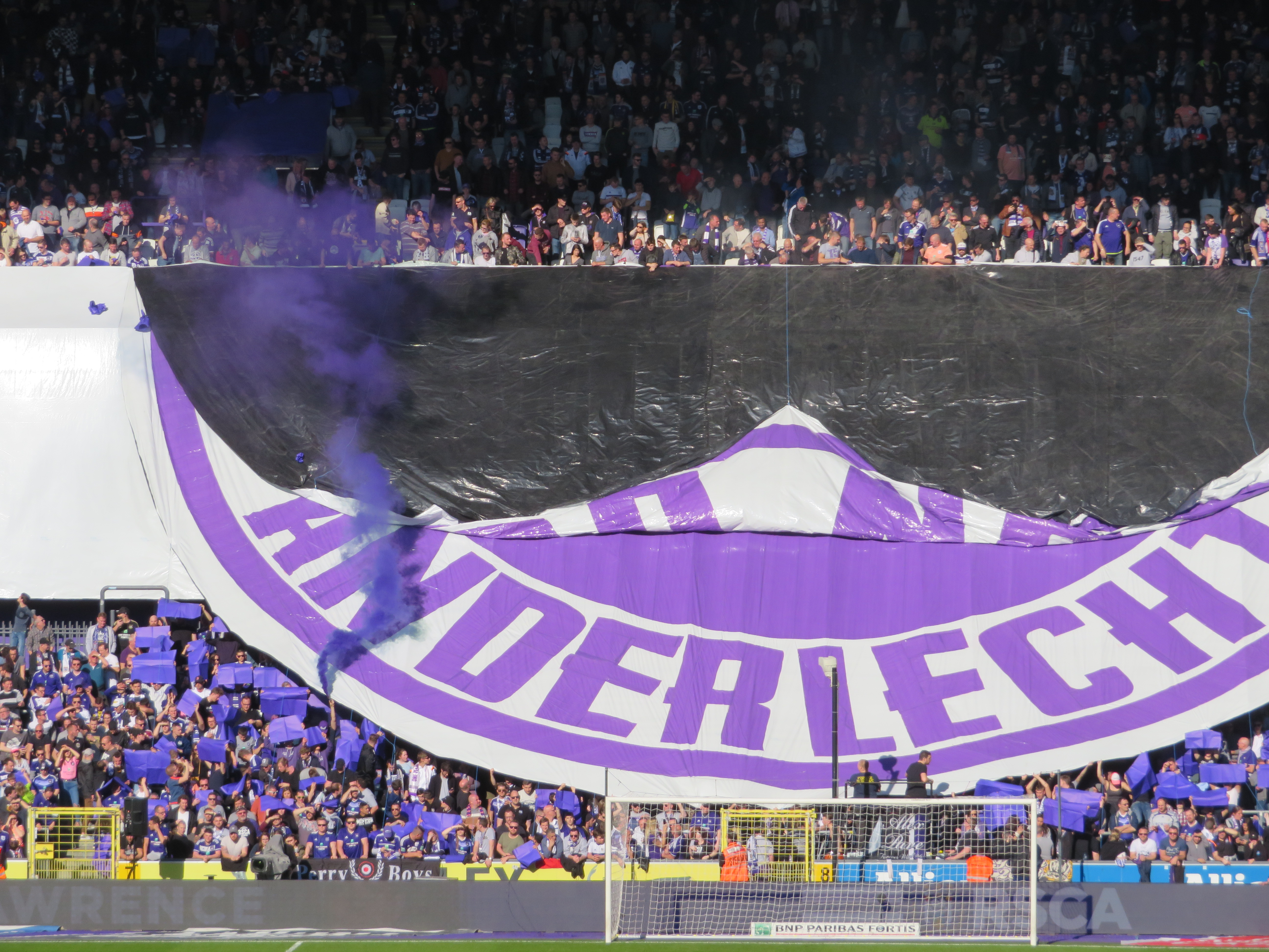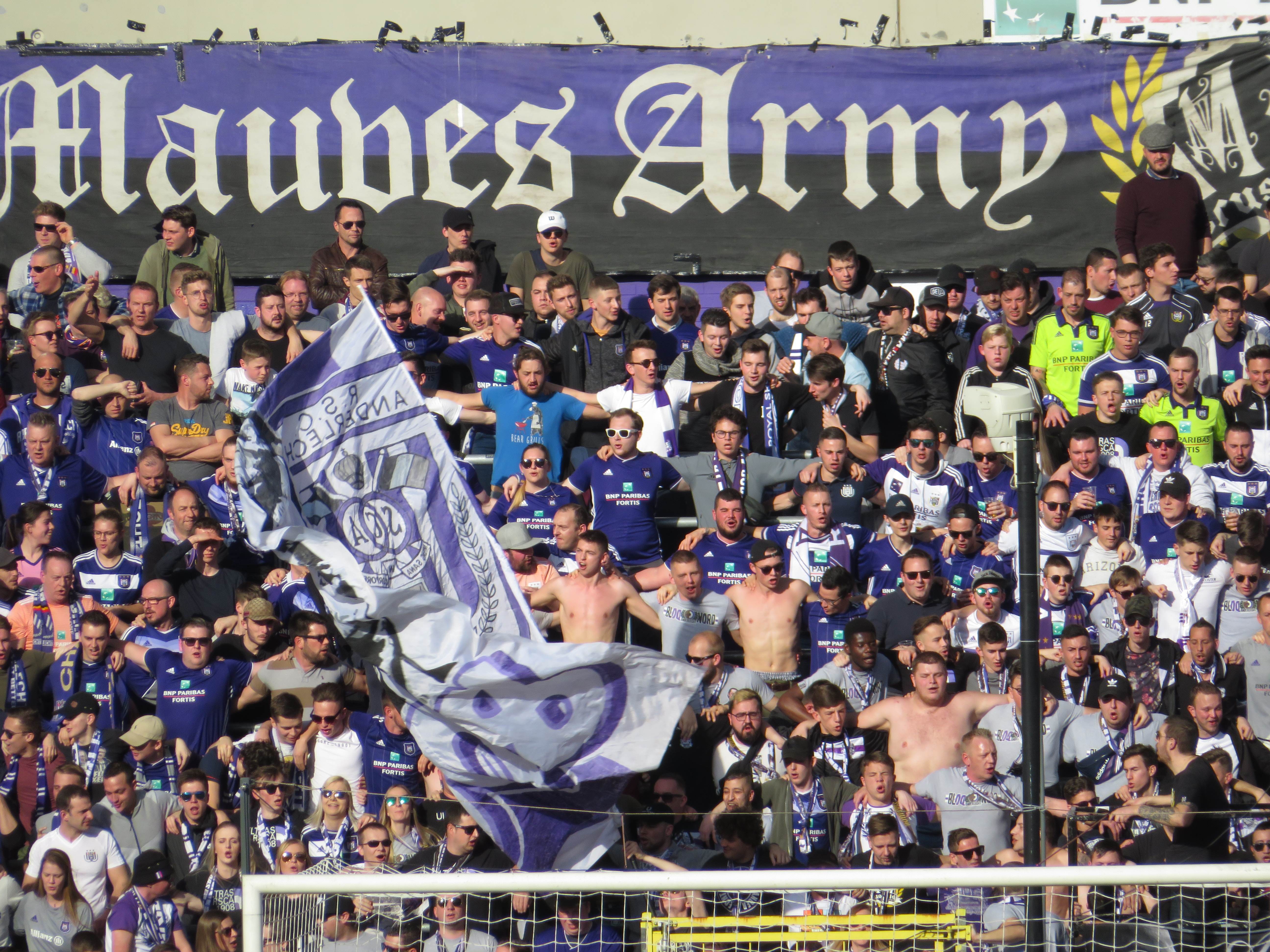 Generell war unfassbar viel los. In der Südkurve gab es eine simple Choreographie, die sich dem Gründungsjahr von Anderlecht widmete und einem Hauch violetten Rauch abgeschlossen wurde. Ein sehr gelungener Start. Außerdem gab es eine Supportgruppe im Unterrang der Nordtribüne und eine weitere im Oberrang der Nordtribüne. Und die Gästefans waren auch noch auf der Nordseite untergebracht. Wahnsinn. So herrschte das gesamte Spiel auch ein ohrenbetäubender Lärm und immer mal wieder stiegen weite Teile des Stadions in die Gesänge ein. Besonderer Beliebtheit erfreute sich der Gesang: „Alle Brügger sind Homos“, zu dem begeistert gesprungen wurde. Diesen Gesang mag man bewerten wie man will, dennoch war der Heimauftritt stark und viel besser als erwartet. Was wäre wohl möglich, wenn die verschiedenen Gruppen an einem Strang ziehen würden?