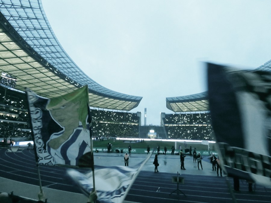 Zu Beginn versuchten wir uns noch einmal mit dem neuen Lied, was jedoch kaum Früchte trug. Die Fähigkeit schnell Text zu lernen, scheint nur bedingt verbreitet zu sein. Dennoch ein schönes Ding, das hoffentlich dauerhaften Einzug in unser Gesangbuch finden wird. Es ist schwer zu sagen, ob wir Herthaner heute überhaupt noch in der Überzahl im Stadion waren. Tendenziell würde ich sagen eher nein, was schon Einiges aussagt. Die Ostkurve zeigte sich dennoch motiviert. Der Spielverlauf in der ersten Halbzeit trug ohne Frage zur guten Stimmung bei. In der zweiten Halbzeit war der Auftritt dann etwas schwächer. Ein ordentlicher Auftritt war das dennoch.