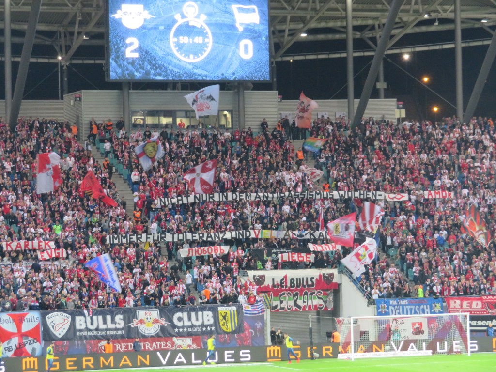 Erleichtert stellte ich fest, dass die Stimmung in Leipzig trotz guter Leistungen auf dem Platz, von Saison zu Saison abflacht. Bis auf wenige Ausnahmen, wurde es kaum laut im Stadion. Optisch eine Katastrophe und auch die nachgemachten Melodien sorgten kaum für Lautstärke. Euch braucht niemand.