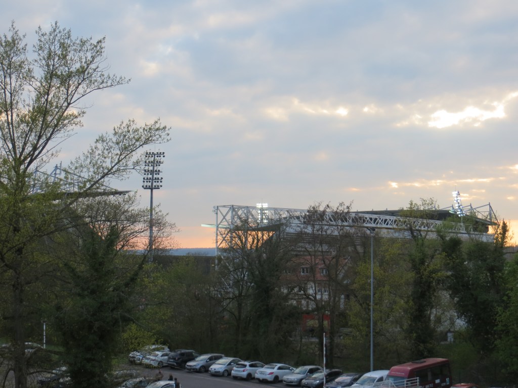 Am frühen Abend ging es dann zu Fuß von unserer Unterkunft zum Stadion, das direkt an der Mosel liegt. Langsam aber sicher stießen immer mehr Menschen zu uns und machten sich auf den Weg zum Stadion. Ich liebe dieses Gefühl, wenn man voller Vorfreude in einem Menschenstrom zum Stadion zieht, in der Ferne die Flutlichtmasten brennen sieht und ein kleines Kribbeln verspürt. Wir wählten einen Eingang und kauften uns Tickets für die Westtribüne. Die fachkundige Verkäuferin brauchte mehrere Minuten, um das Wechselgeld herauszugeben und verkaufte uns eine Karte für den Block der Gruppa Metz. Top!