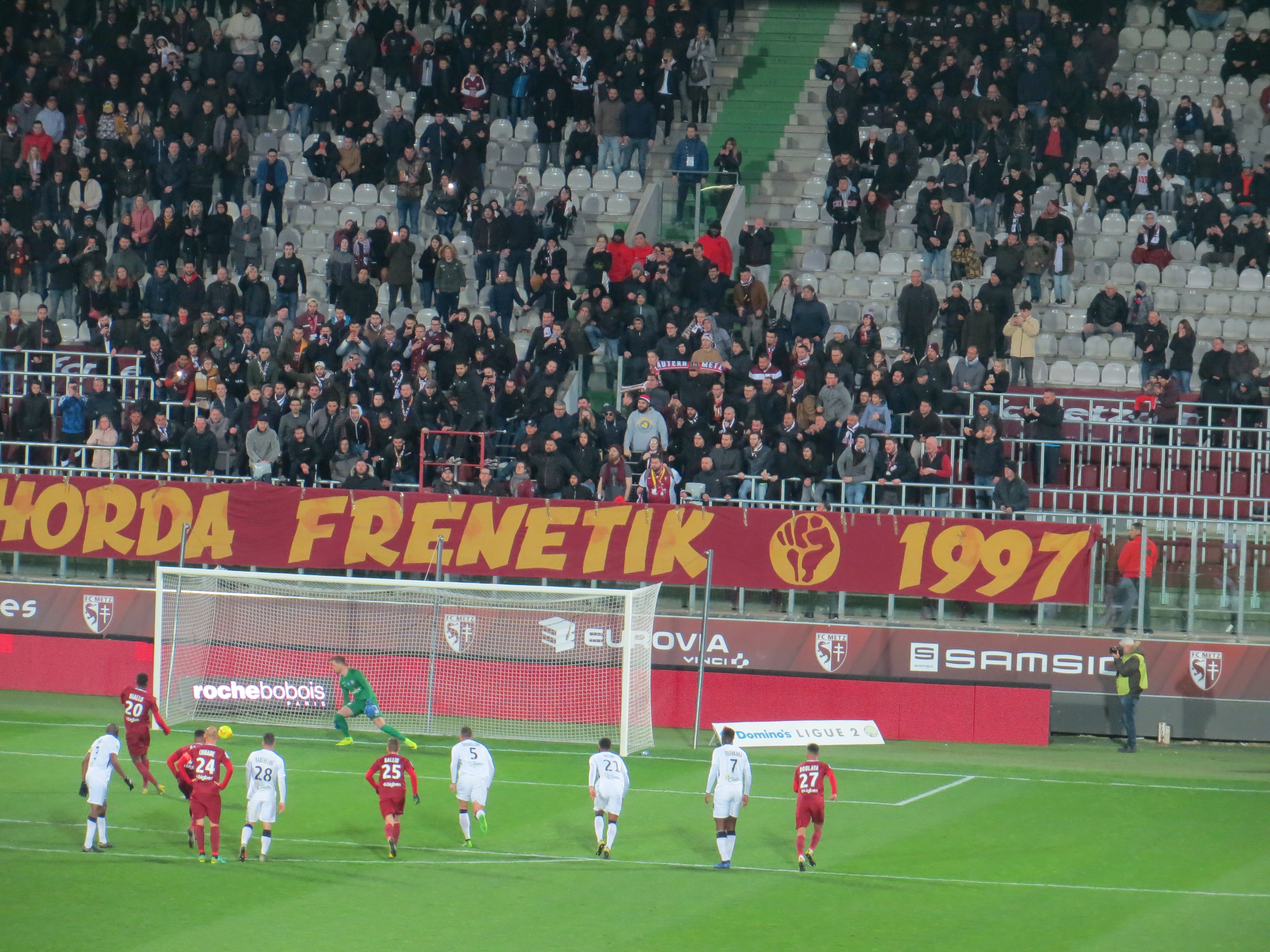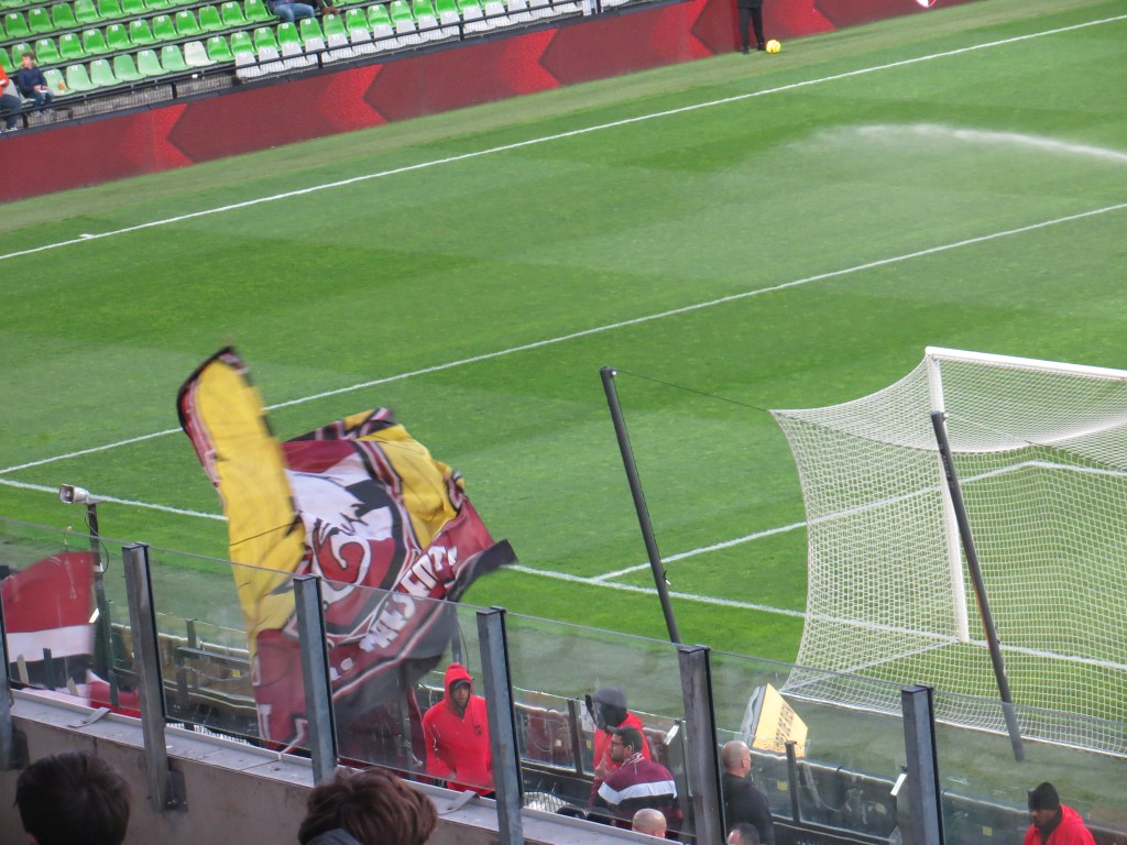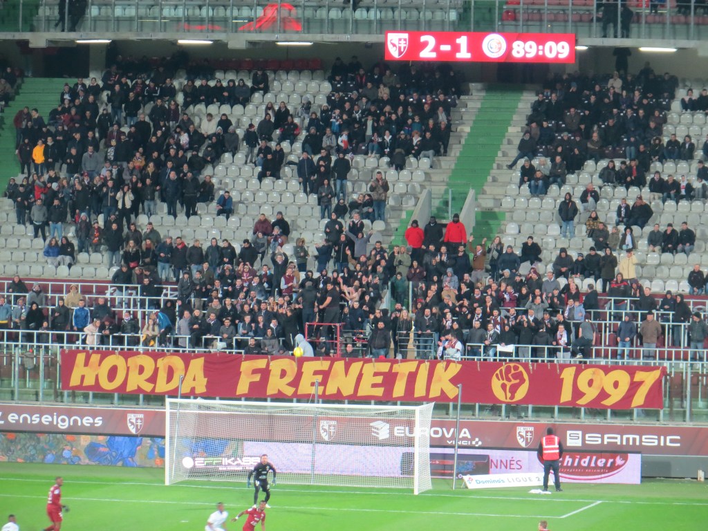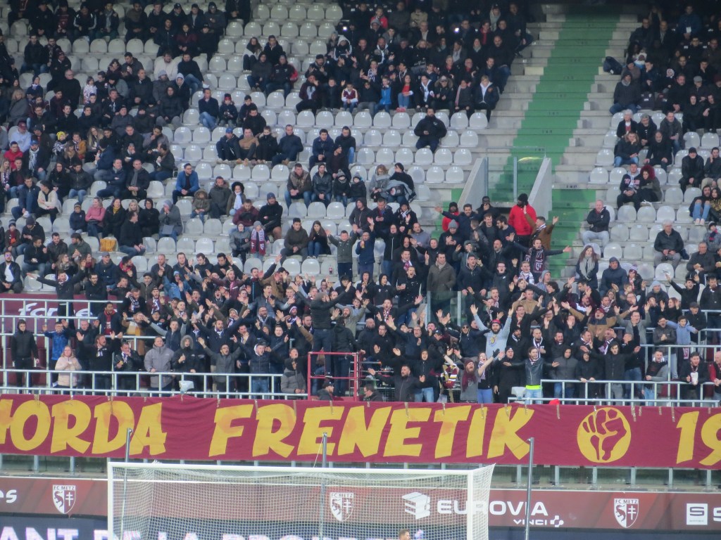 Die Fanszene in Metz teilt sich in zwei Gruppen auf, die sich auf unterschiedlichen Tribünen einfinden. Die Horda Frénétik im Jahre 1997 gegründet befindet sich auf der Osttribüne. Die Gruppe hing erst mit dem Anpfiff ihre sehenswerte Zaunfahne auf. Danach supporteten circa 300 Leute kompakt stehend ihren Verein. Durch die geringe Anzahl an Leuten war es eher leise, dafür aber optisch wirklich schön und mit guter Bewegung. Unter uns war die Gruppa Metz auf der Westtribüne, die wir nur eingeschränkt sehen konnten. Sie waren tendenziell noch ein bisschen leiser, hatten aber noch einige Schwenkfahnen am Start. Mir ist nicht bekannt, warum die beiden Gruppen nicht zusammen supporten. Für den neutralen Beobachter ist es aber definitiv bedauerlich.