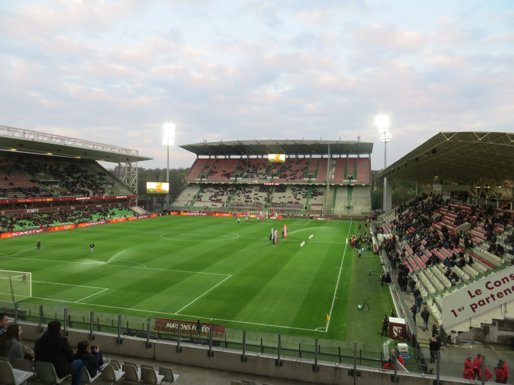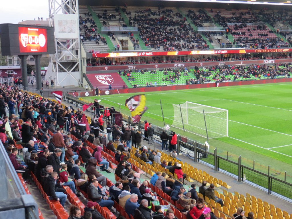 Ich bekam dann auch prompt einen Flyer der Gruppa in die Hand gedrückt. Für einen 10er kann man Mitglied werden und im nächsten Jahr eine vergünstigte Dauerkarte beziehen. Na, wenn das kein Angebot ist. Wir entschieden uns somit für den Oberrang und fanden dort ein schönes Plätzchen. Das Stadion in Metz ist sehenswert. Es besteht aus vier freistehenden Tribünen, wobei die beiden Hintertortribünen identisch sind. Zwar ist grau der dominierende Ton, aber die Aussicht nach draußen und schöne Flutlichtmasten entschädigen für einiges. Es war recht zugig und kalt, sodass die 90 Minuten schon mal schneller vorrübergingen.