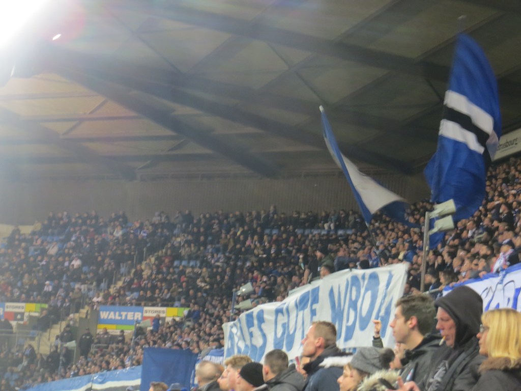 Das Auto geparkt, flux die Unterkunft für die Nacht bezogen und dann ging es auch schon zu Fuß in Richtung Stadion. Wir liefen einen schicken Weg durch die Innenstadt, sahen aber nur wenige Fußballfans. So kamen bei mir etliche Zweifel ob der Anstoßzeit auf. Als wir uns dem Stadion näherten sah man aber immer mehr Straßburgfans und ich entspannte mich innerlich. Die Absprache mit Flipper und Nemo gestaltete sich dann etwas schwierig, da die Artikulationsfähigkeiten der beiden Meeresbewohner aufgrund zahlreicher Freigetränke der Straßbourgois etwas abgenommen hatten. So warteten wir noch etliche Minuten auf die beiden und trafen sie dann an einem bekannten Schnellrestaurant. Wir erhielten unsere Karten und betraten gemeinsam das Stadion. Vielen Dank nach Straßbourg, dass wir jetzt schon das zweite Mal die Ehre hatten das Spiel mit Euch in der Kurve zu verfolgen.