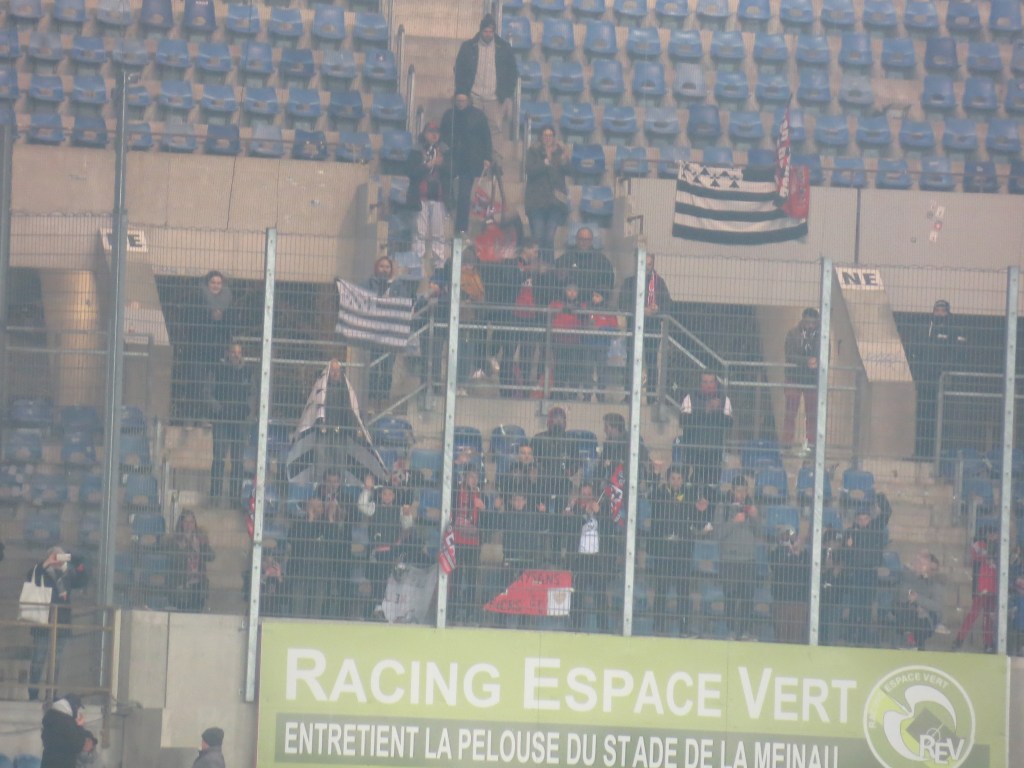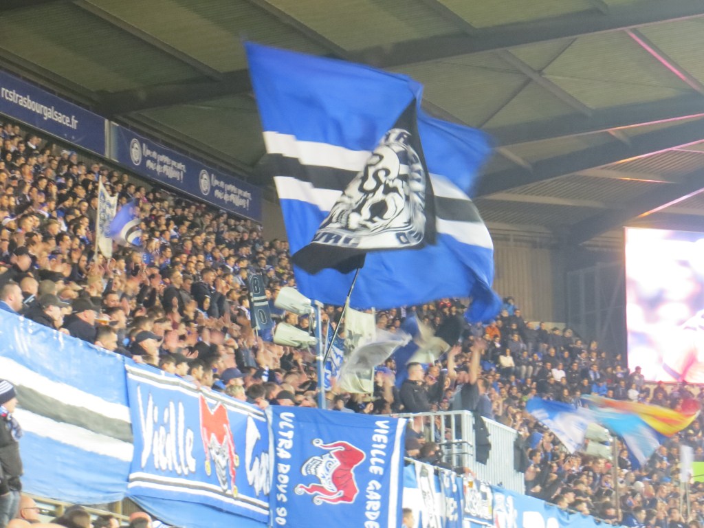 Fangen wir mit dem Geschehen auf den Rängen an. Aus Guingamp waren nur wenige Leute mitgereist, die außer durch ein paar Zaunfahnen nicht in Erscheinung traten. Straßbourg hingegen überzeugte mich sehr. Die Mitmachquote in der Heimkurve war absolut exzellent und die wunderbaren Melodien wurden geschlossen vorgetragen. Das Liedgut ist dabei absolut eingängig und so gelang es selbst uns die Texte schnell mitzusingen. Es machte einfach Spaß und man merkt, wie die Stadt hinter Racing steht und der Graben zwischen Ultras und Normalos kaum existent ist. Man kann einiges lernen in Straßbourg. Per Spruchband wurde noch den Wild Boys zum Jahrestag gratuliert und von der ganzen Kurve ein Ständchen gesungen. Es machte wirklich Spaß.