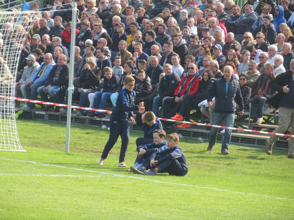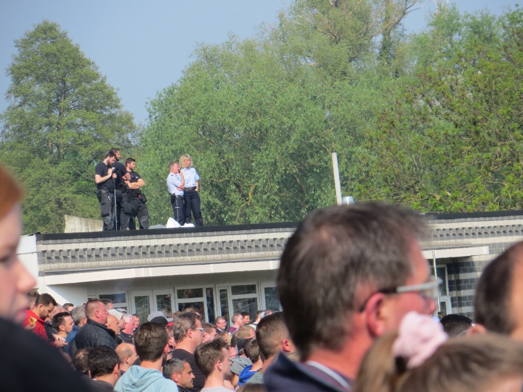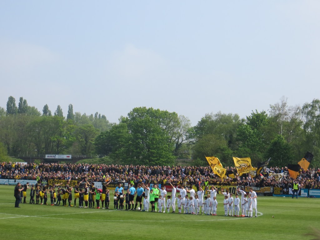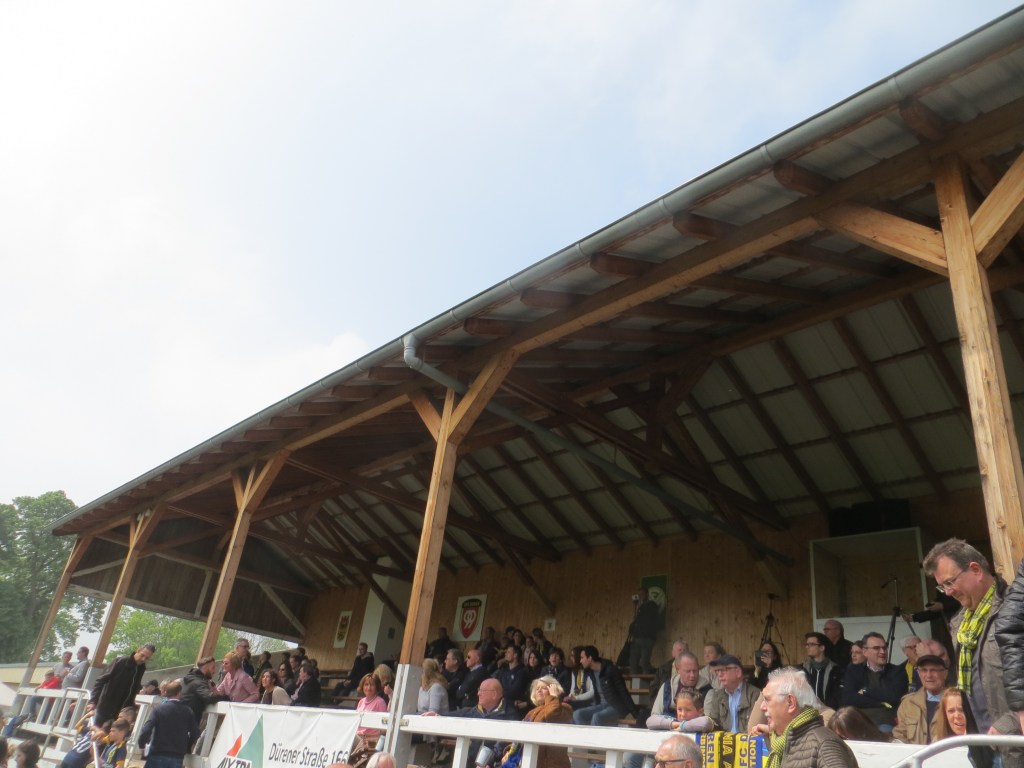 Diese Pokalspiele muss man einfach mögen. Klar, das ist auch ein Eventpublikum, aber ich finde es trotzdem toll, dass für ein Spiel zwischen einem Fünftligisten und einem Regionalligisten fast 6.000 Leute kommen. So gab es ein buntes Gewusel an Leuten. Gut und gerne 3.000 Leute hielten es mit der Alemannia aus Aachen. Der Rest waren Dürener, Gelegenheitsfans und Hopper. Wir nahmen unsere Stehplätze neben der historischen Holztribüne ein und kurz danach kam die Sonne hinter den Wolken hervor und kitzelte uns ein wenig.