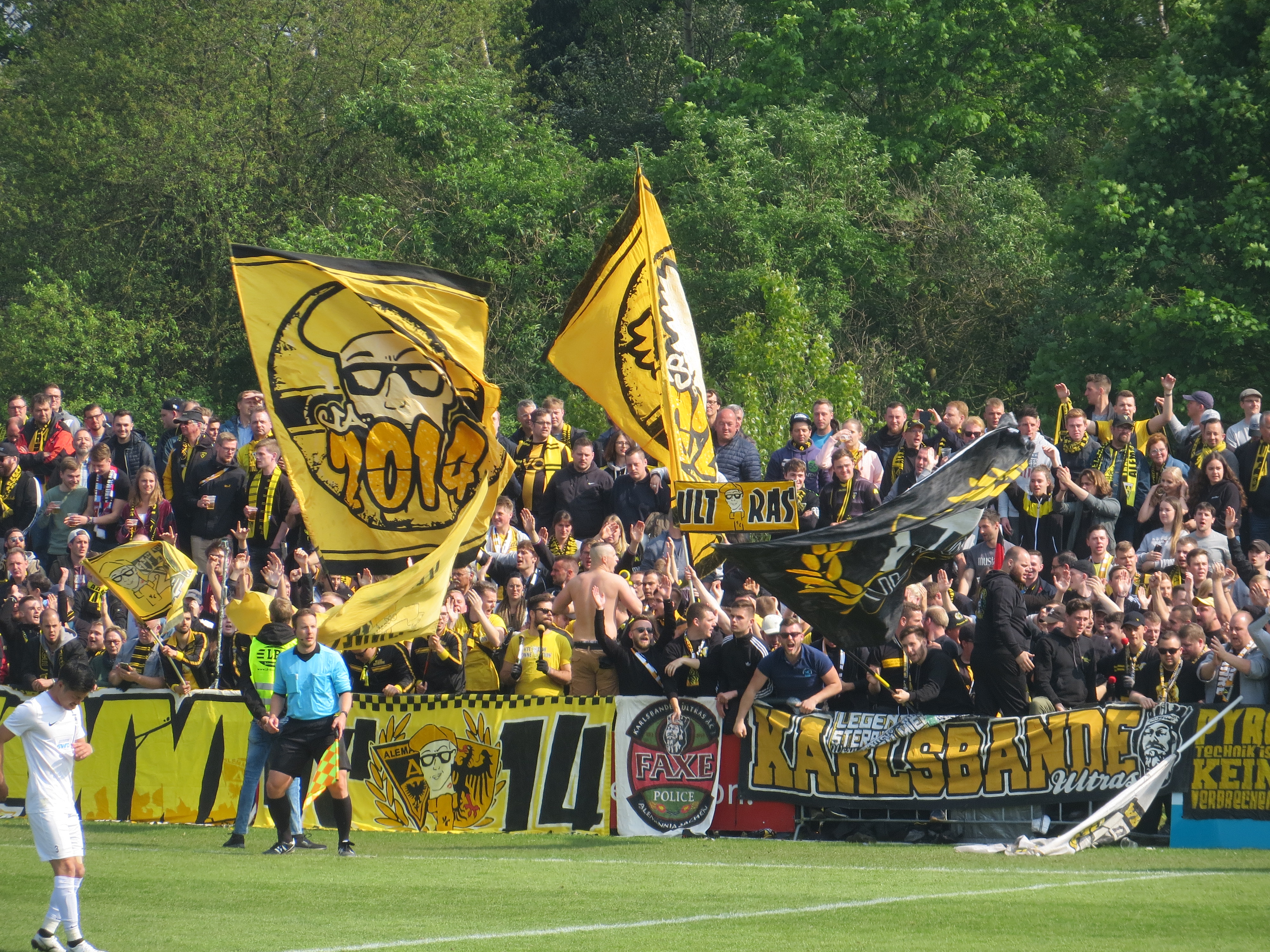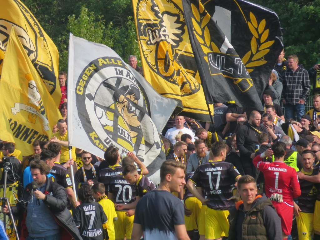 Röller hatte im Vorfeld massiv Werbung für das Halbfinale des Mittelrheinpokals in Düren gemacht und sich mit einigen Tricksereien am Ende durchgesetzt. Hier könnte man auch mal eine Genderdebatte führen, denn die größte Konkurrentin war das DFB Pokalfinale der Frauen. Am Bahnhof warteten wir kurz und sammelten dann das Flagschiff ein, das sich am Vorabend intensiv dem Thekensport gewidmet hatte. In dieser Mannschaftsstärke ging es durch das eher unansehnliche Düren, bis wir am Stadion noch die Sektion Düsseldorf begrüßten.