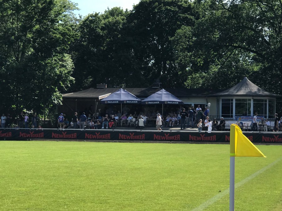 Dann hatten wir etwas Schwierigkeiten den Prinzenpark zu lokalisieren. Meine Erinnerungen führten uns direkt in den Kemmelpark. Dort fragten wir dann zwei Braunschweiger Urgesteine, die uns dank einer perfekten Erklärung den richtigen Weg wiesen. So erlebten wir den Anpfiff zumindest in Sichtweite. Schnell noch ein Ticket gekauft und schnell eine Bratwurst nachgeschoben. Das Catering war heute solide. Das Angebot war durch die anliegende Gaststätte herausragend. Die Preise waren aber aus dem gleichen Grund extrem hoch.