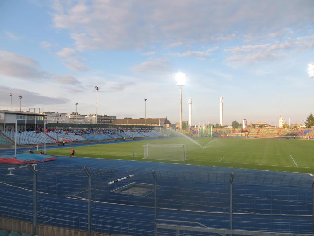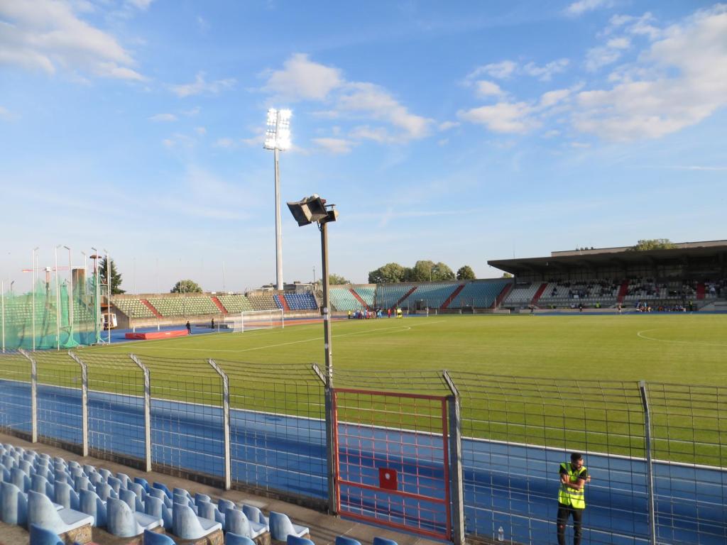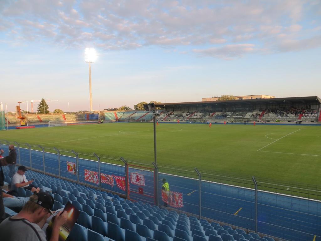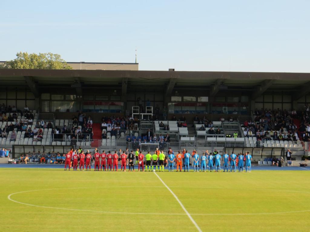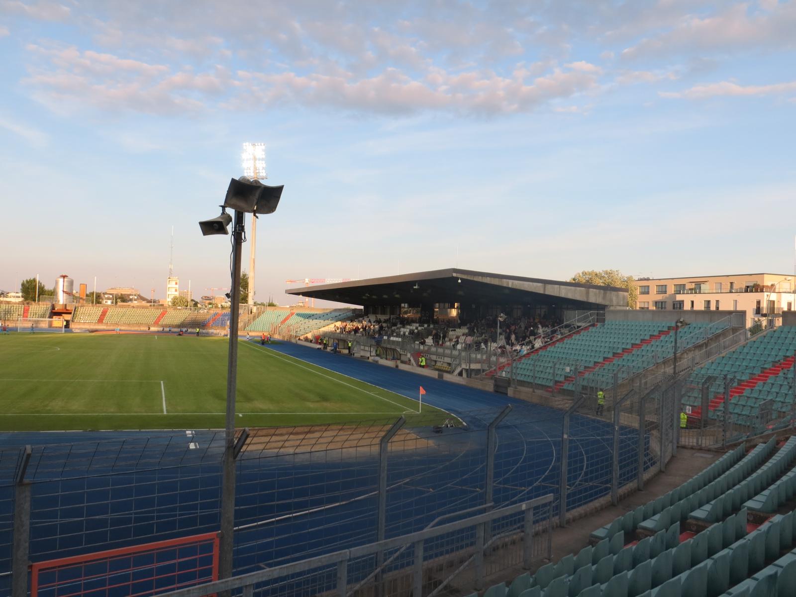 Um 17:45 betraten wir dann das Nationalstadion Luxemburgs, das in den nächsten Jahren abgerissen wird, um einem neuen Wohnviertel Platz zu machen. Schon ein bisschen bitter. Umso glücklicher war ich jedoch, dass ich diesen Ground noch rechtzeitig kreuzen konnte, denn es handelt sich um eine schöne Kiste. Die Haupttribüne ist überdacht und alle weiteren Stadionbereiche sind unüberdachte Sitzplätze. Wir nahmen auf der unüberdachten Tribüne auf der Geraden Platz und genossen das schöne Flair.