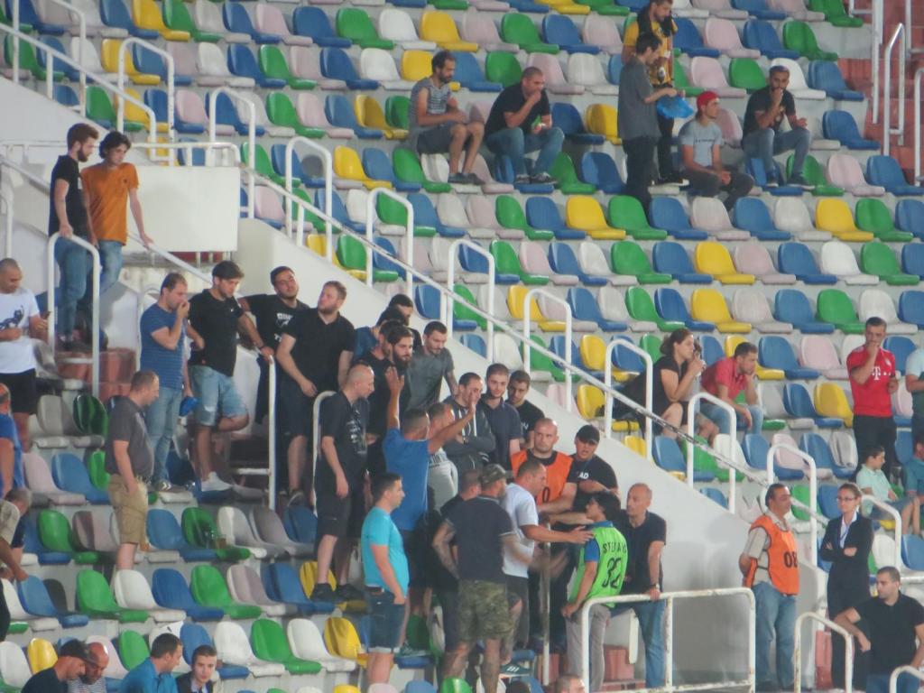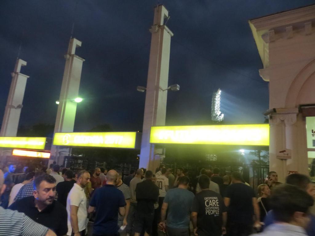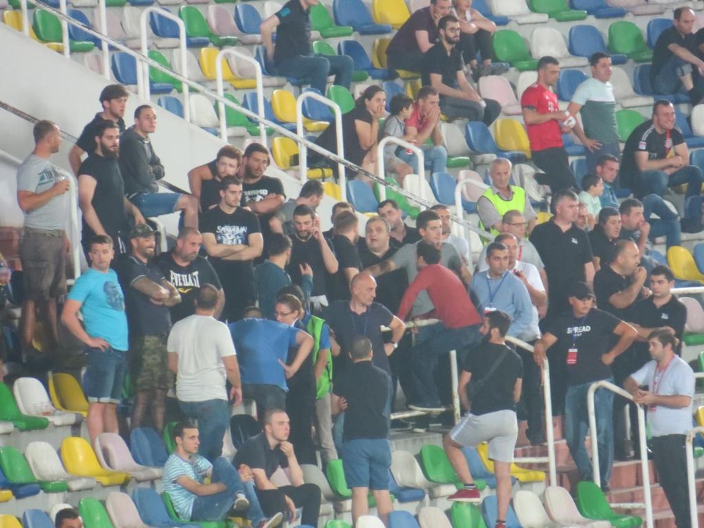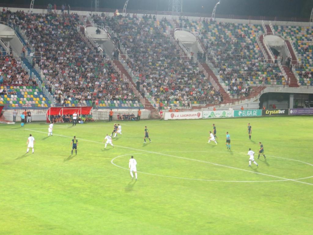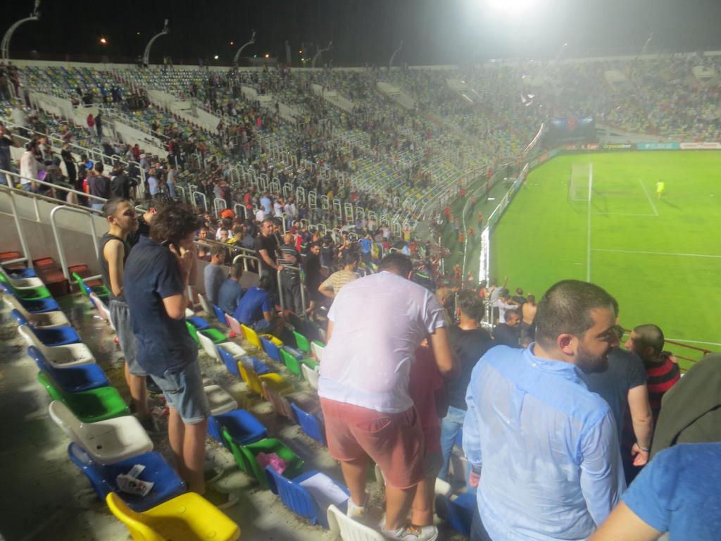 Die Eintrittskarte kostete heute einen stolzen Lari und somit umgerechnet 0,33€. Absolut Wahnsinn für so ein Spiel. Wir passierten die Kontrolle und wurden direkt herausgezogen und mussten unsere Pässe zeigen. Schon da schwante mir böses. Als wir den Block betraten folgte eine weitere Kontrolle. Später fand ich dann heraus, dass die Gäste aus Zagreb aufgrund einer UEFA Sperre nicht ins Stadion dürften. Dennoch hatten es circa 20 Kroaten ins Stadion geschafft, die sogar zwei Fahnen hielten und ein Spruchband gegen die Vereinsführung zeigte. In den ersten Minuten verschafften sich die Zagreber auch durchaus Gehör. Relativ schnell kamen dann jedoch Polizei und Ordnungskräfte und es kam zu Diskussionen. Kurz vor der Halbzeit verließen die Zagreber dann den Block und ich konnte sie auch in der zweiten Halbzeit nicht mehr wahrnehmen. Im Nachgang las ich dann von einem Angriff auf die Zagreb Fans in Tiflis, der womöglich vom korruptionsumwitterten Zagreber Präsidenten orchestriert wurde. Kranke Welt!