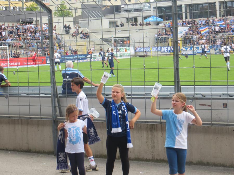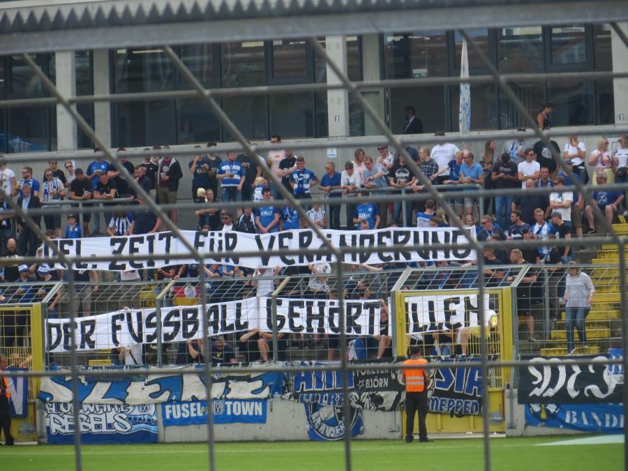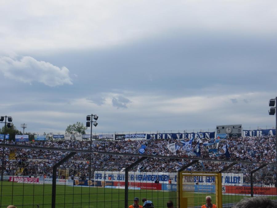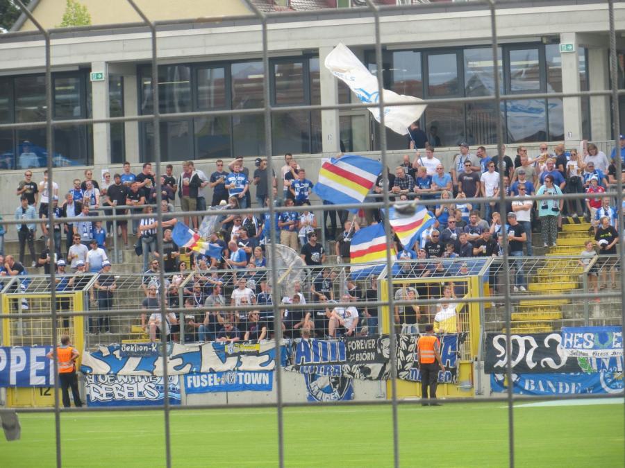 Meppen war nur mit circa 200 Leuten vor Ort, wobei sich vielleicht 50 Leute konstant am Support beteiligten. Ich hatte von Meppen irgendwie mehr Leute erwartet. Klar, ist das eine weite Strecke, aber ich hatte von denen immer ganz gute Auswärtsfahrerzahlen mitbekommen. Ordentliche Zaunbeflaggung und ansonsten kaum zu hören. Sehr unauffällig.