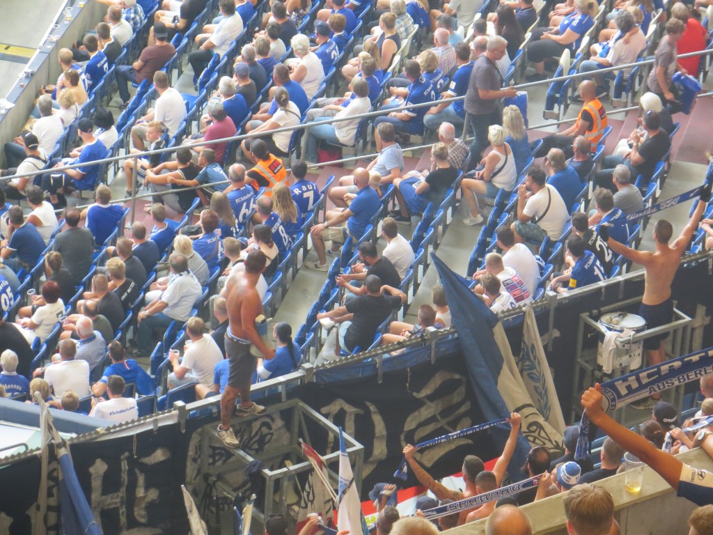 Dort gab es dann die obligatorisch peniblen Kontrollen und ich ließ mich in Rookie-Manier von dem Ordner vorführen und ließ mir meine Aufkleber abziehen. Wie lange gehe ich schon ins Stadion? Zumindest war die Schlange relativ kurz und so war ich dann auch zügig im Block. Dort verquatschte ich die Zeit bis zum Anpfiff und dann ging es auch schon los. Samstag 15.30 und trotzdem schaffen es nur 1.300 Herthaner in den Gästeblock. Dafür gibt es einfach keine Entschuldigung und gerade in der Derbysaison ist das einfach unglücklich. Die Anwesenden, schienen auch keine sonderliche Begeisterung zu verspüren, denn es war ein sehr dünner Auftritt. Eigentlich wurde die gesamte Zeit nur geträllert. Im besten Fall, denn auch in den unteren Reihen blieb der Mund dann einfach mal minutenlang geschlossen. Ist es wirklich so schwer 90 Minuten in der Woche aus sich rauszugehen? Die ganze Scheiße der Woche zu vergessen und gemeinsam einen Sahneauftritt hinzulegen? Offensichtlich schon. Lediglich beim Stadionverbotlerlied am Ende wurde es etwas lauter, was bei mir aber auch irgendwie eher Fragezeichen als Freude hinterlässt.