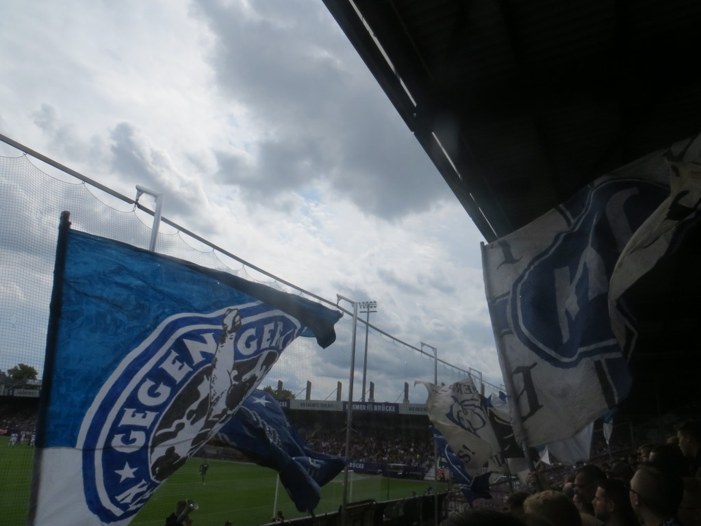 Das Stadion ist klein, aber oho. Ein guter Gästeblock, mit super Akustik, der auch sehr ansprechend gefüllt war. Karlsruhe war optisch wieder hervorragend mit zahlreichen Schwenkfahnen. Mit der Lautstärke war man etwas unzufrieden, aber gerade mit Blick auf den Spielverlauf war das sehr annehmbar. Generell war es wieder ein Melodiefeuerwerk. Manche Lieder wie „Karlsruhe schieß ein Tor“ müssten für mich nicht sein, aber nun gut. Es machte wieder Spaß und das ist ja die Hauptsache. Osnabrück war eher gut als schlecht. Optisch kein Vergleich zu Karlsruhe, aber dafür auch wirklich mit schönen Melodien. Zeugte von höherem Anspruch, als immer nur die aktuellen Gassenhauer abzukupfern. Auch das restliche Stadion konnte immer mal wieder mitgenommen werden. Alles sehr redlich und irgendwie mag ich solche Städte und Vereine wie Osnabrück. Das geht schon in Ordnung, dass die in der zweiten Liga spielen. Nervig waren lediglich einige pubertierende Rotzlöffel im Nebenblock, die das gesamte Spiel über provozierten. Hoffen wir, dass die Lektion bald überbracht wird.