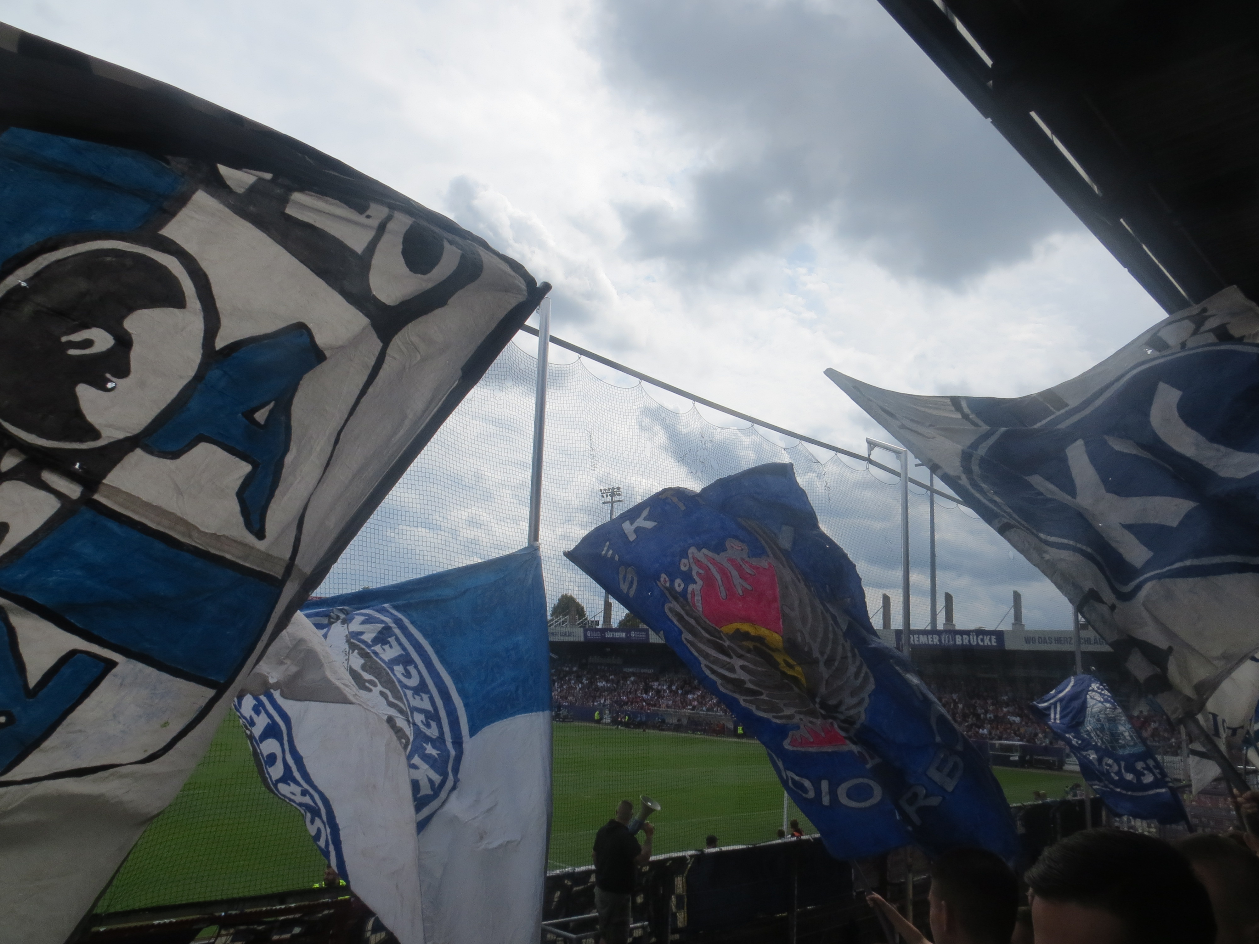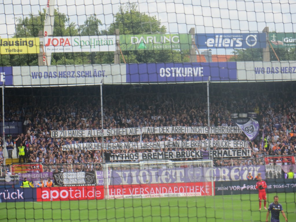 Diesen Sonntag sollte sich die Gelegenheit bieten, eine kleine Schande nachträglich etwas abzumildern. Vor etlichen Jahren hatte ich ein Auswärtsspiel des KSC in Osnabrück aus Faulheit abgelehnt, obwohl die Fahrzeit doch sehr überschaubar war. Seit Jahren war mir das fehlende Kreuz hinter dem Stadion an der Bremer Brücke ein Dorn im Auge. Heute war es endlich soweit.