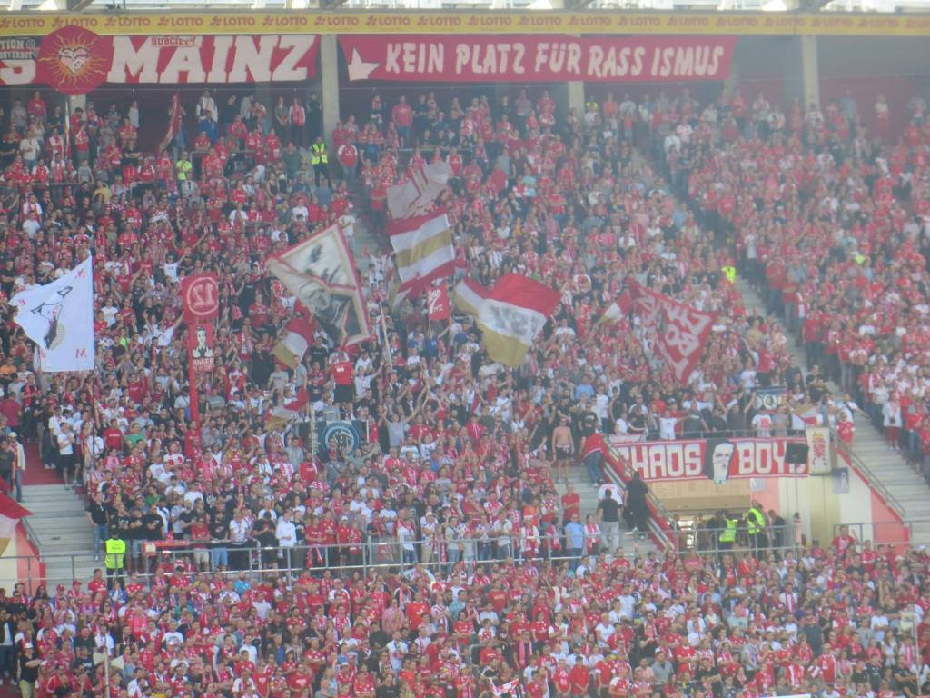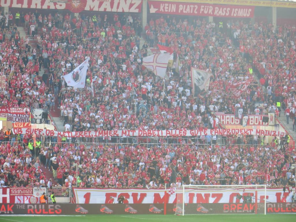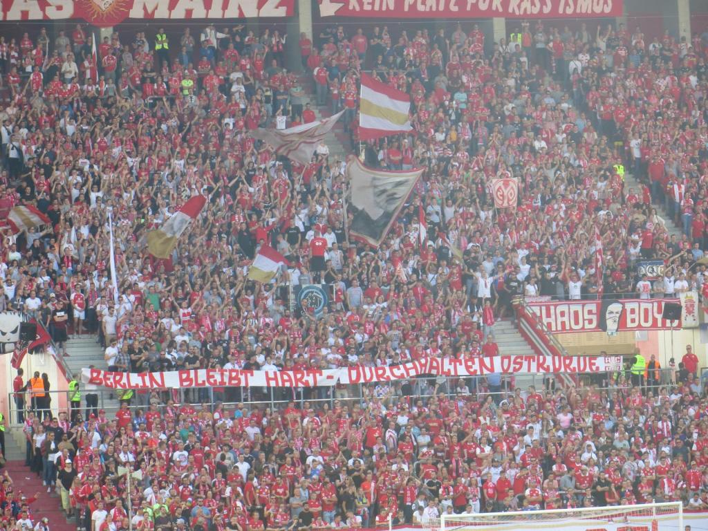 Zufrieden sein konnte man mit dem Support heute wieder nicht. 80 Minuten halbe Kraft und zehn gute Minuten sind irgendwie ernüchternd. Klar, die Mannschaft spielt momentan bescheiden, aber das sind eigentlich gerade die Momente, in denen man als Block wenigstens scheinen sollte. Mainz versuchte sich an einem erneuten Positionswechsel und befand sich ebenfalls im oberen Teil des Blocks. Zumindest heute konnte dadurch keine Verbesserung erzielt werden. Man hörte die Mainzer fast gar nicht und lediglich durch ein solidarisches Spruchband an unsere Ostkurve aufgrund der Stadionverbote fielen sie positiv auf.