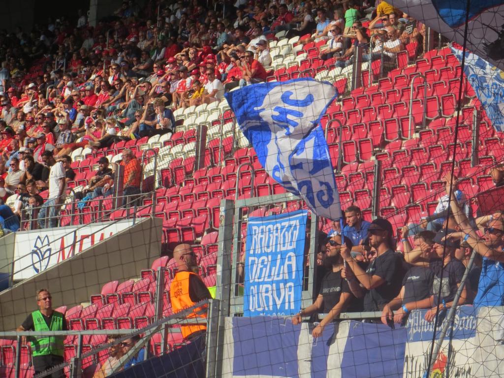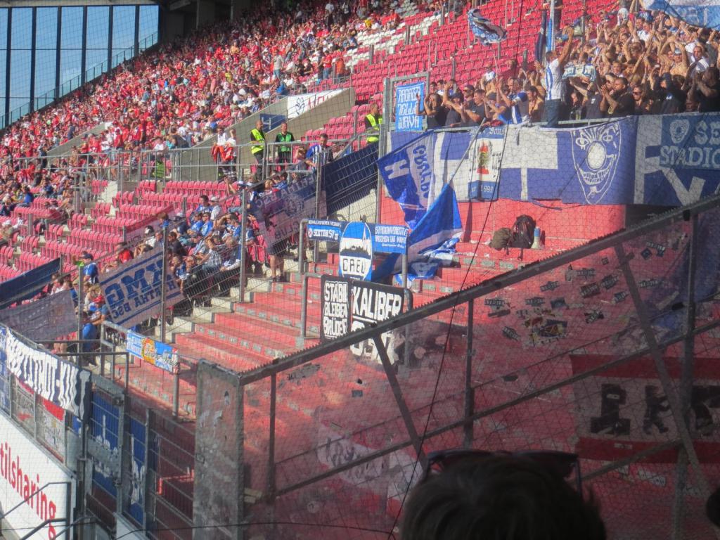 Ohne Rucksäcke auf den Schultern, aber mit Röller im Gepäck, ging es zu den Shuttlebussen. Das erschien ein fairer Deal zu sein. Um 15.18 waren wir am Stadion und um 15.26 betrat ich den Block, spurtete elegant die Treppen hoch und quetschte mich noch auf ein freies Plätzchen. Tschernie eingehakt und losgehüpft. So schnell kann es auch mal gehen. Ein großer Teil des Gästeblocks reiste heute mit dem Sonderzug aus Berlin an. Trotzdem war der Block wieder eher spärlich gefüllt und so wurde der untere Bereich komplett abgeflaggt. So war es im oberen Teil zumindest kompakt und eng.
